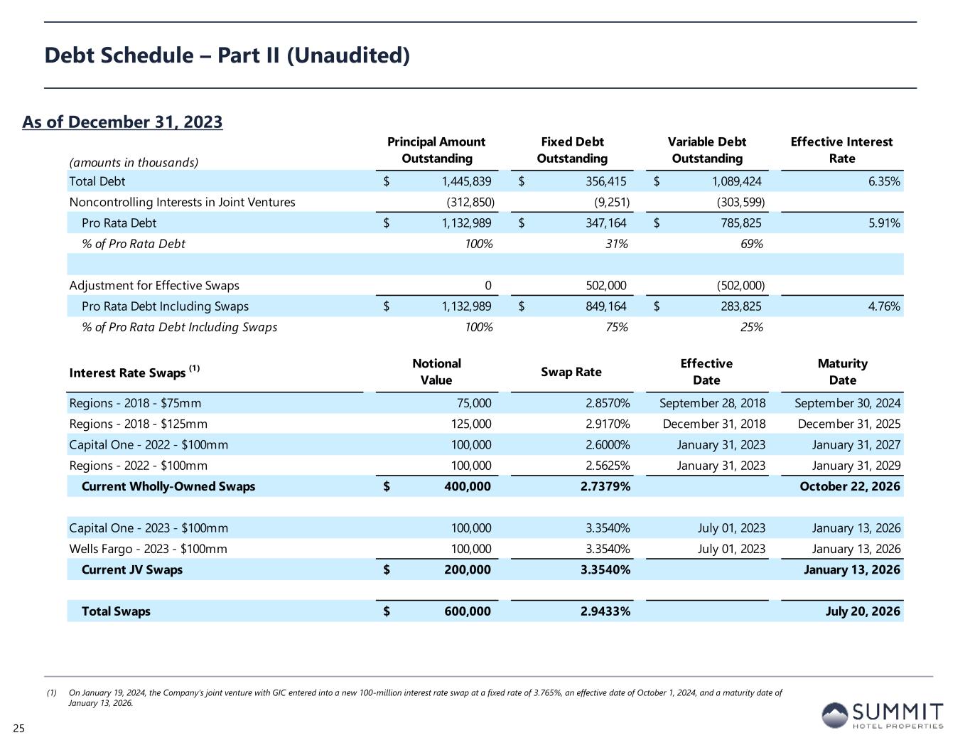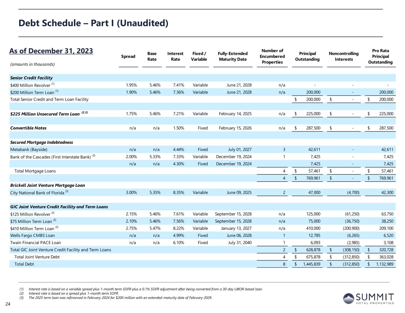 (amounts in thousands) Spread Base Rate Interest Rate Fixed / Variable Fully-Extended Maturity Date Number of Encumbered Properties Principal Outstanding Noncontrolling Interests Pro Rata Principal Outstanding Senior Credit Facility $400 Million Revolver (1) 1.95% 5.46% 7.41% Variable June 21, 2028 n/a - - - $200 Million Term Loan (1) 1.90% 5.46% 7.36% Variable June 21, 2028 n/a 200,000 - 200,000 Total Senior Credit and Term Loan Facility 200,000$ -$ 200,000$ $225 Million Unsecured Term Loan (2,3) 1.75% 5.46% 7.21% Variable February 14, 2025 n/a 225,000$ -$ 225,000$ Convertible Notes n/a n/a 1.50% Fixed February 15, 2026 n/a 287,500$ -$ 287,500$ Secured Mortgage Indebtedness Metabank (Bayside) n/a n/a 4.44% Fixed July 01, 2027 3 42,611 - 42,611 Bank of the Cascades (First Interstate Bank) (2) 2.00% 5.33% 7.33% Variable December 19, 2024 1 7,425 - 7,425 n/a n/a 4.30% Fixed December 19, 2024 7,425 - 7,425 Total Mortgage Loans 4 57,461$ -$ 57,461$ 4 769,961$ -$ 769,961$ Brickell Joint Venture Mortgage Loan City National Bank of Florida (3) 3.00% 5.35% 8.35% Variable June 09, 2025 2 47,000 (4,700) 42,300 GIC Joint Venture Credit Facility and Term Loans $125 Million Revolver (2) 2.15% 5.46% 7.61% Variable September 15, 2028 n/a 125,000 (61,250) 63,750 $75 Million Term Loan (2) 2.10% 5.46% 7.56% Variable September 15, 2028 n/a 75,000 (36,750) 38,250 $410 Million Term Loan (2) 2.75% 5.47% 8.22% Variable January 13, 2027 n/a 410,000 (200,900) 209,100 Wells Fargo CMBS Loan n/a n/a 4.99% Fixed June 06, 2028 1 12,785 (6,265) 6,520 Twain Financial PACE Loan n/a n/a 6.10% Fixed July 31, 2040 1 6,093 (2,985) 3,108 Total GIC Joint Venture Credit Facility and Term Loans 2 628,878$ (308,150)$ 320,728$ Total Joint Venture Debt 4 675,878$ (312,850)$ 363,028$ Total Debt 8 1,445,839$ (312,850)$ 1,132,989$ Debt Schedule – Part I (Unaudited) (1) Interest rate is based on a variable spread plus 1-month term SOFR plus a 0.1% SOFR adjustment after being converted from a 30-day LIBOR-based loan. (2) Interest rate is based on a spread plus 1-month term SOFR. (3) The 2025 term loan was refinanced in February 2024 for $200 million with an extended-maturity date of February 2029. As of December 31, 2023 24
