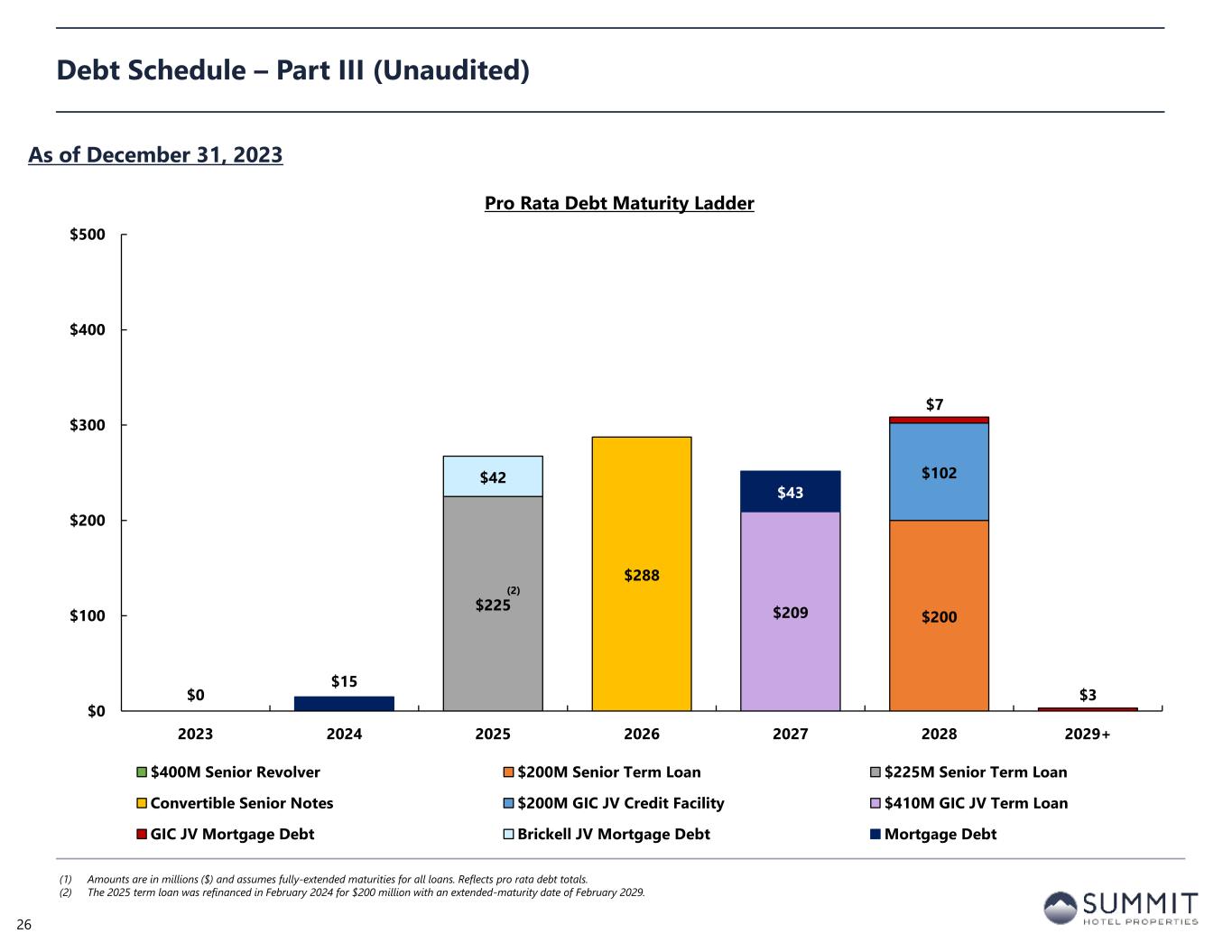 (amounts in thousands) Principal Amount Outstanding Fixed Debt Outstanding Variable Debt Outstanding Effective Interest Rate Total Debt 1,445,839$ 356,415$ 1,089,424$ 6.35% Noncontrolling Interests in Joint Ventures (312,850) (9,251) (303,599) Pro Rata Debt 1,132,989$ 347,164$ 785,825$ 5.91% % of Pro Rata Debt 100% 31% 69% Adjustment for Effective Swaps 0 502,000 (502,000) Pro Rata Debt Including Swaps 1,132,989$ 849,164$ 283,825$ 4.76% % of Pro Rata Debt Including Swaps 100% 75% 25% Interest Rate Swaps (1) Notional Value Swap Rate Effective Date Maturity Date Regions - 2018 - $75mm 75,000 2.8570% September 28, 2018 September 30, 2024 Regions - 2018 - $125mm 125,000 2.9170% December 31, 2018 December 31, 2025 Capital One - 2022 - $100mm 100,000 2.6000% January 31, 2023 January 31, 2027 Regions - 2022 - $100mm 100,000 2.5625% January 31, 2023 January 31, 2029 Current Wholly-Owned Swaps 400,000$ 2.7379% October 22, 2026 Capital One - 2023 - $100mm 100,000 3.3540% July 01, 2023 January 13, 2026 Wells Fargo - 2023 - $100mm 100,000 3.3540% July 01, 2023 January 13, 2026 Current JV Swaps 200,000$ 3.3540% January 13, 2026 Total Swaps 600,000$ 2.9433% July 20, 2026 Debt Schedule – Part II (Unaudited) As of December 31, 2023 25 (1) On January 19, 2024, the Company’s joint venture with GIC entered into a new 100-million interest rate swap at a fixed rate of 3.765%, an effective date of October 1, 2024, and a maturity date of January 13, 2026.