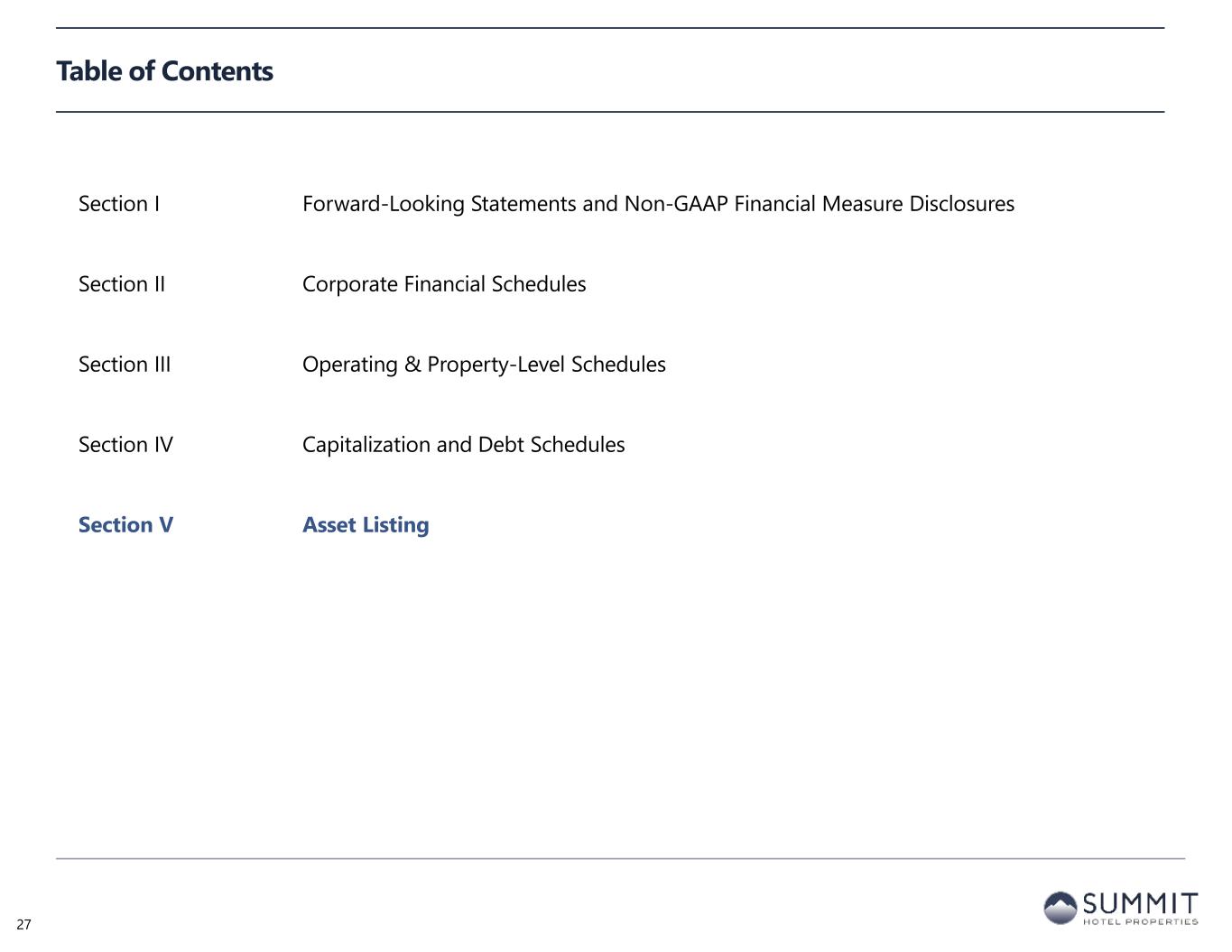 Table of Contents Section I Forward-Looking Statements and Non-GAAP Financial Measure Disclosures Section II Corporate Financial Schedules Section III Operating & Property-Level Schedules Section IV Capitalization and Debt Schedules Section V Asset Listing 27