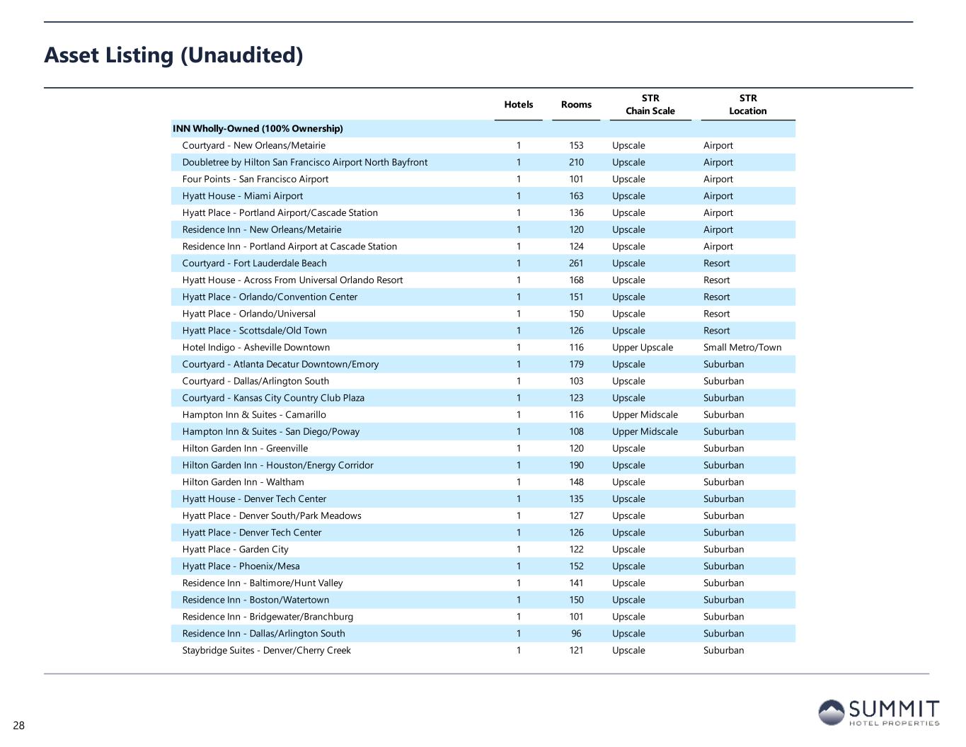 Hotels Rooms STR Chain Scale STR Location INN Wholly-Owned (100% Ownership) Courtyard - New Orleans/Metairie 1 153 Upscale Airport Doubletree by Hilton San Francisco Airport North Bayfront 1 210 Upscale Airport Four Points - San Francisco Airport 1 101 Upscale Airport Hyatt House - Miami Airport 1 163 Upscale Airport Hyatt Place - Portland Airport/Cascade Station 1 136 Upscale Airport Residence Inn - New Orleans/Metairie 1 120 Upscale Airport Residence Inn - Portland Airport at Cascade Station 1 124 Upscale Airport Courtyard - Fort Lauderdale Beach 1 261 Upscale Resort Hyatt House - Across From Universal Orlando Resort 1 168 Upscale Resort Hyatt Place - Orlando/Convention Center 1 151 Upscale Resort Hyatt Place - Orlando/Universal 1 150 Upscale Resort Hyatt Place - Scottsdale/Old Town 1 126 Upscale Resort Hotel Indigo - Asheville Downtown 1 116 Upper Upscale Small Metro/Town Courtyard - Atlanta Decatur Downtown/Emory 1 179 Upscale Suburban Courtyard - Dallas/Arlington South 1 103 Upscale Suburban Courtyard - Kansas City Country Club Plaza 1 123 Upscale Suburban Hampton Inn & Suites - Camarillo 1 116 Upper Midscale Suburban Hampton Inn & Suites - San Diego/Poway 1 108 Upper Midscale Suburban Hilton Garden Inn - Greenville 1 120 Upscale Suburban Hilton Garden Inn - Houston/Energy Corridor 1 190 Upscale Suburban Hilton Garden Inn - Waltham 1 148 Upscale Suburban Hyatt House - Denver Tech Center 1 135 Upscale Suburban Hyatt Place - Denver South/Park Meadows 1 127 Upscale Suburban Hyatt Place - Denver Tech Center 1 126 Upscale Suburban Hyatt Place - Garden City 1 122 Upscale Suburban Hyatt Place - Phoenix/Mesa 1 152 Upscale Suburban Residence Inn - Baltimore/Hunt Valley 1 141 Upscale Suburban Residence Inn - Boston/Watertown 1 150 Upscale Suburban Residence Inn - Bridgewater/Branchburg 1 101 Upscale Suburban Residence Inn - Dallas/Arlington South 1 96 Upscale Suburban Staybridge Suites - Denver/Cherry Creek 1 121 Upscale Suburban Asset Listing (Unaudited) 28