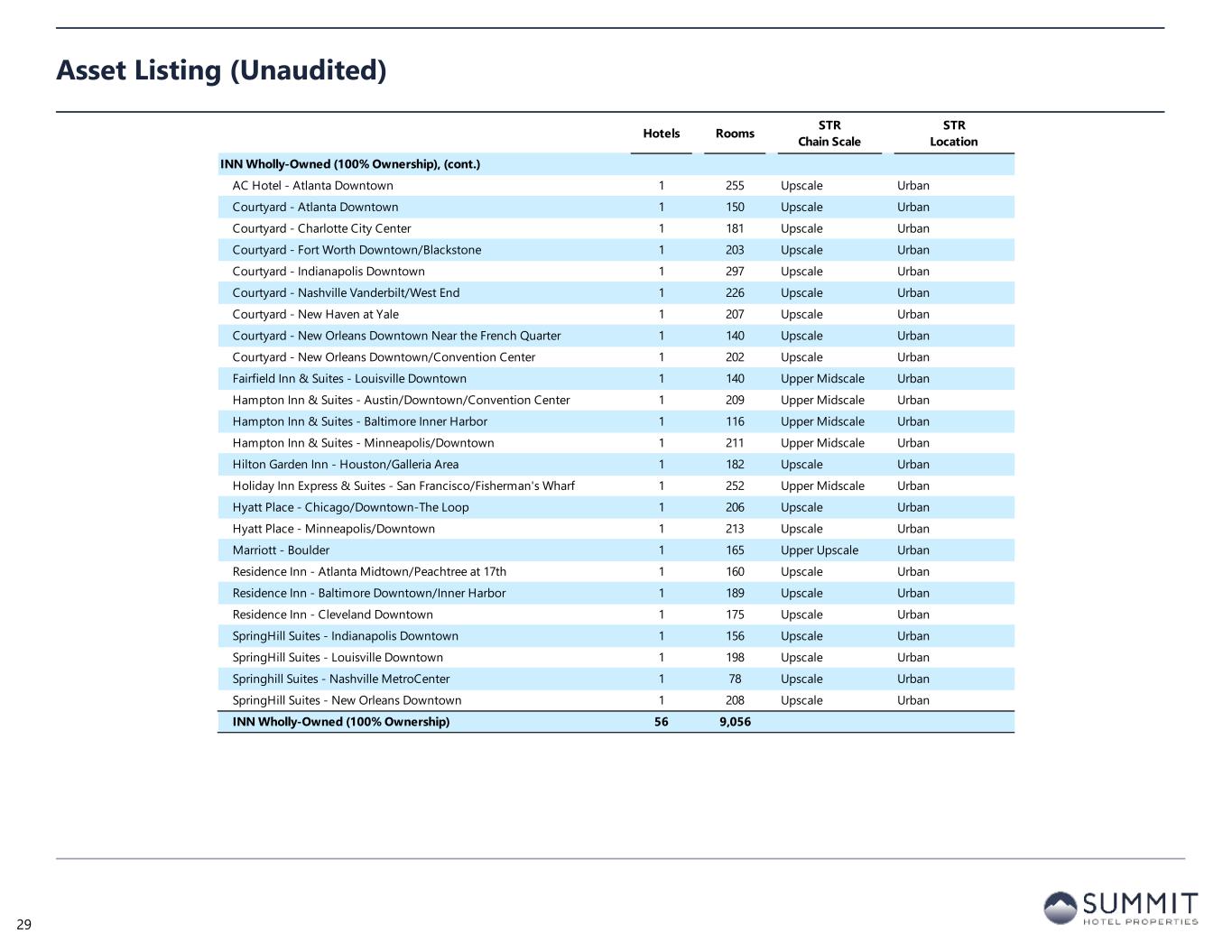 Hotels Rooms STR Chain Scale STR Location INN Wholly-Owned (100% Ownership), (cont.) AC Hotel - Atlanta Downtown 1 255 Upscale Urban Courtyard - Atlanta Downtown 1 150 Upscale Urban Courtyard - Charlotte City Center 1 181 Upscale Urban Courtyard - Fort Worth Downtown/Blackstone 1 203 Upscale Urban Courtyard - Indianapolis Downtown 1 297 Upscale Urban Courtyard - Nashville Vanderbilt/West End 1 226 Upscale Urban Courtyard - New Haven at Yale 1 207 Upscale Urban Courtyard - New Orleans Downtown Near the French Quarter 1 140 Upscale Urban Courtyard - New Orleans Downtown/Convention Center 1 202 Upscale Urban Fairfield Inn & Suites - Louisville Downtown 1 140 Upper Midscale Urban Hampton Inn & Suites - Austin/Downtown/Convention Center 1 209 Upper Midscale Urban Hampton Inn & Suites - Baltimore Inner Harbor 1 116 Upper Midscale Urban Hampton Inn & Suites - Minneapolis/Downtown 1 211 Upper Midscale Urban Hilton Garden Inn - Houston/Galleria Area 1 182 Upscale Urban Holiday Inn Express & Suites - San Francisco/Fisherman's Wharf 1 252 Upper Midscale Urban Hyatt Place - Chicago/Downtown-The Loop 1 206 Upscale Urban Hyatt Place - Minneapolis/Downtown 1 213 Upscale Urban Marriott - Boulder 1 165 Upper Upscale Urban Residence Inn - Atlanta Midtown/Peachtree at 17th 1 160 Upscale Urban Residence Inn - Baltimore Downtown/Inner Harbor 1 189 Upscale Urban Residence Inn - Cleveland Downtown 1 175 Upscale Urban SpringHill Suites - Indianapolis Downtown 1 156 Upscale Urban SpringHill Suites - Louisville Downtown 1 198 Upscale Urban Springhill Suites - Nashville MetroCenter 1 78 Upscale Urban SpringHill Suites - New Orleans Downtown 1 208 Upscale Urban INN Wholly-Owned (100% Ownership) 56 9,056 Asset Listing (Unaudited) 29