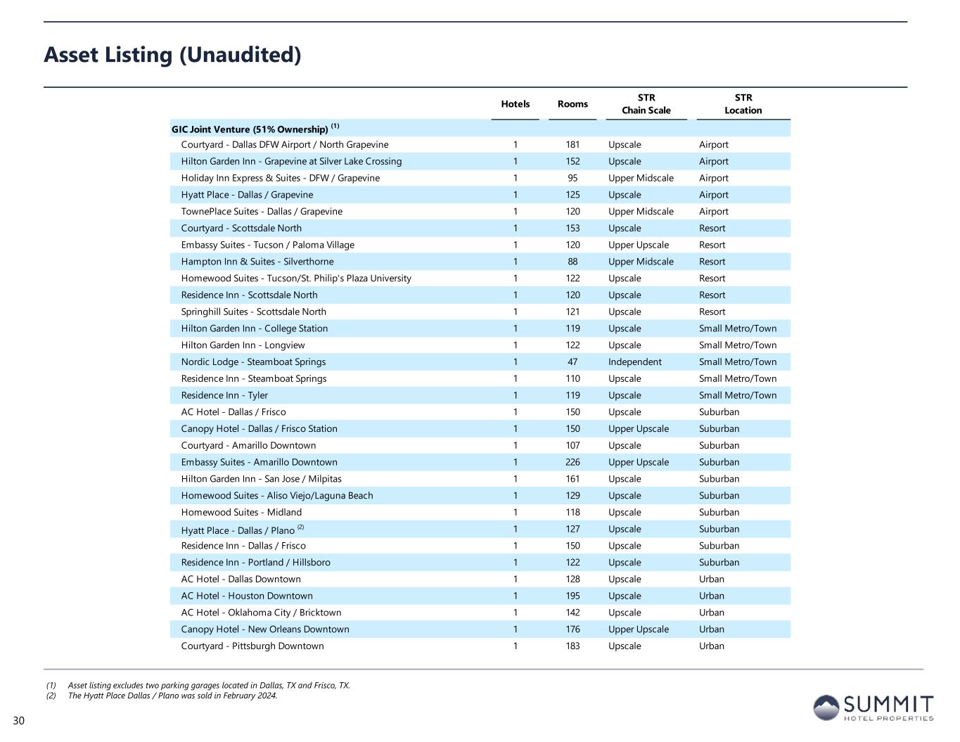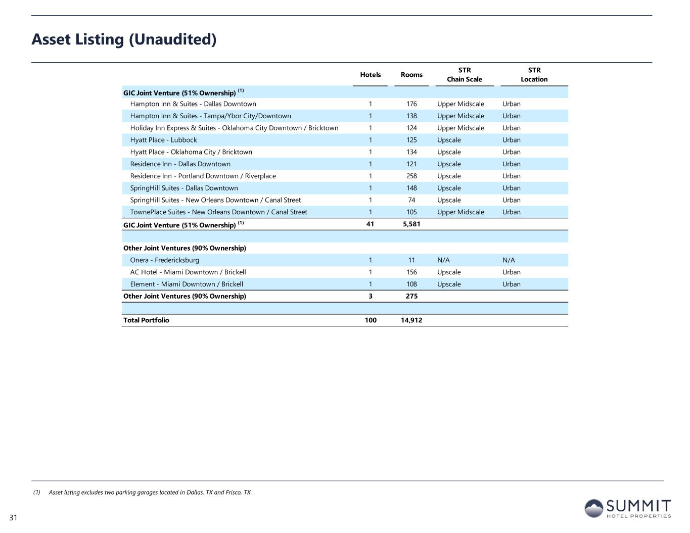 Hotels Rooms STR Chain Scale STR Location GIC Joint Venture (51% Ownership) (1) Courtyard - Dallas DFW Airport / North Grapevine 1 181 Upscale Airport Hilton Garden Inn - Grapevine at Silver Lake Crossing 1 152 Upscale Airport Holiday Inn Express & Suites - DFW / Grapevine 1 95 Upper Midscale Airport Hyatt Place - Dallas / Grapevine 1 125 Upscale Airport TownePlace Suites - Dallas / Grapevine 1 120 Upper Midscale Airport Courtyard - Scottsdale North 1 153 Upscale Resort Embassy Suites - Tucson / Paloma Village 1 120 Upper Upscale Resort Hampton Inn & Suites - Silverthorne 1 88 Upper Midscale Resort Homewood Suites - Tucson/St. Philip's Plaza University 1 122 Upscale Resort Residence Inn - Scottsdale North 1 120 Upscale Resort Springhill Suites - Scottsdale North 1 121 Upscale Resort Hilton Garden Inn - College Station 1 119 Upscale Small Metro/Town Hilton Garden Inn - Longview 1 122 Upscale Small Metro/Town Nordic Lodge - Steamboat Springs 1 47 Independent Small Metro/Town Residence Inn - Steamboat Springs 1 110 Upscale Small Metro/Town Residence Inn - Tyler 1 119 Upscale Small Metro/Town AC Hotel - Dallas / Frisco 1 150 Upscale Suburban Canopy Hotel - Dallas / Frisco Station 1 150 Upper Upscale Suburban Courtyard - Amarillo Downtown 1 107 Upscale Suburban Embassy Suites - Amarillo Downtown 1 226 Upper Upscale Suburban Hilton Garden Inn - San Jose / Milpitas 1 161 Upscale Suburban Homewood Suites - Aliso Viejo/Laguna Beach 1 129 Upscale Suburban Homewood Suites - Midland 1 118 Upscale Suburban Hyatt Place - Dallas / Plano (2) 1 127 Upscale Suburban Residence Inn - Dallas / Frisco 1 150 Upscale Suburban Residence Inn - Portland / Hillsboro 1 122 Upscale Suburban AC Hotel - Dallas Downtown 1 128 Upscale Urban AC Hotel - Houston Downtown 1 195 Upscale Urban AC Hotel - Oklahoma City / Bricktown 1 142 Upscale Urban Canopy Hotel - New Orleans Downtown 1 176 Upper Upscale Urban Courtyard - Pittsburgh Downtown 1 183 Upscale Urban Asset Listing (Unaudited) (1) Asset listing excludes two parking garages located in Dallas, TX and Frisco, TX. (2) The Hyatt Place Dallas / Plano was sold in February 2024. 30