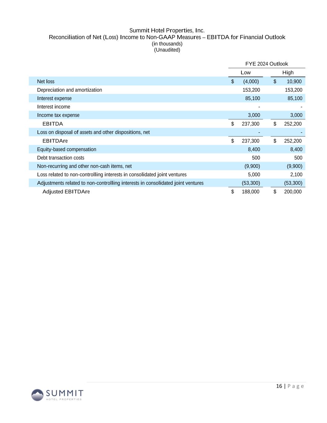 FYE 2024 Outlook Low High Pro Forma RevPAR Growth (1) 2.00% 4.00% Adjusted EBITDAre 188,000$ 200,000$ Adjusted FFO 111,000$ 123,000$ Adjusted FFO per Diluted Unit 0.90$ 1.00$ Capital Expenditures, Pro Rata 65,000$ 85,000$ Full Year 2024 Outlook (Unaudited) (1) All pro forma information includes operating and financial results for 99 lodging assets owned as of February 28, 2024, as if each property had been owned by the Company since January 1, 2023, and will continue to be owned through the entire year ending December 31, 2024. As a result, the pro forma information includes operating and financial results for lodging assets acquired since January 1, 2023, which may include periods prior to the Company’s ownership. Pro forma and non-GAAP financial measures are unaudited. 15 (Amounts in thousands, except per share metrics and statistics)