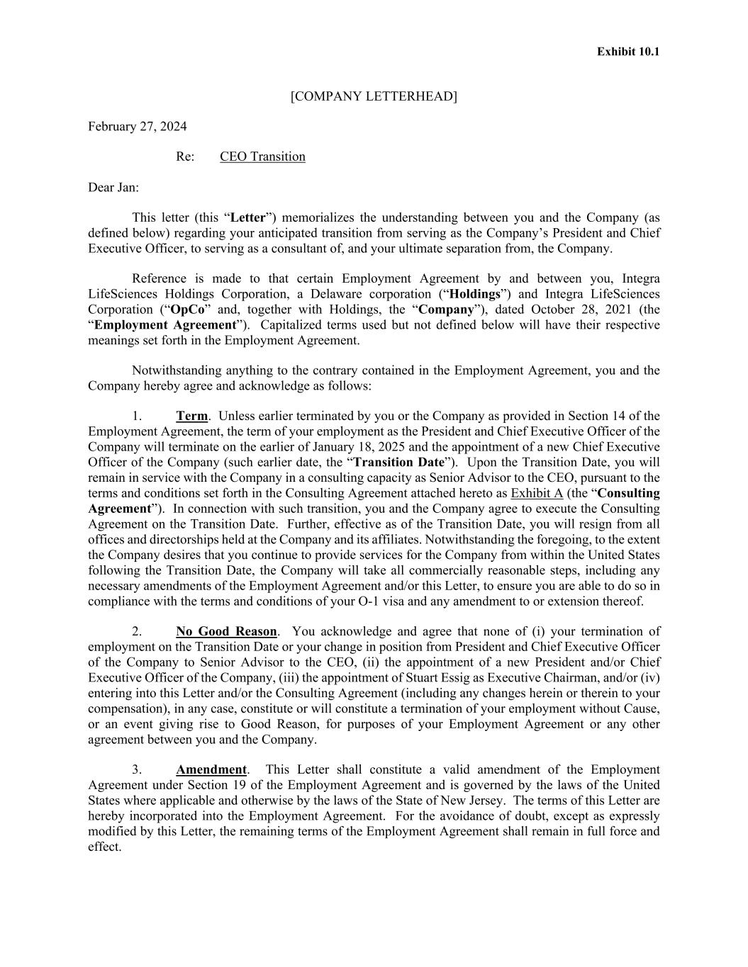 Exhibit 10.1 [COMPANY LETTERHEAD] February 27, 2024 Re: CEO Transition Dear Jan: This letter (this “Letter”) memorializes the understanding between you and the Company (as defined below) regarding your anticipated transition from serving as the Company’s President and Chief Executive Officer, to serving as a consultant of, and your ultimate separation from, the Company. Reference is made to that certain Employment Agreement by and between you, Integra LifeSciences Holdings Corporation, a Delaware corporation (“Holdings”) and Integra LifeSciences Corporation (“OpCo” and, together with Holdings, the “Company”), dated October 28, 2021 (the “Employment Agreement”). Capitalized terms used but not defined below will have their respective meanings set forth in the Employment Agreement. Notwithstanding anything to the contrary contained in the Employment Agreement, you and the Company hereby agree and acknowledge as follows: 1. Term. Unless earlier terminated by you or the Company as provided in Section 14 of the Employment Agreement, the term of your employment as the President and Chief Executive Officer of the Company will terminate on the earlier of January 18, 2025 and the appointment of a new Chief Executive Officer of the Company (such earlier date, the “Transition Date”). Upon the Transition Date, you will remain in service with the Company in a consulting capacity as Senior Advisor to the CEO, pursuant to the terms and conditions set forth in the Consulting Agreement attached hereto as Exhibit A (the “Consulting Agreement”). In connection with such transition, you and the Company agree to execute the Consulting Agreement on the Transition Date. Further, effective as of the Transition Date, you will resign from all offices and directorships held at the Company and its affiliates. Notwithstanding the foregoing, to the extent the Company desires that you continue to provide services for the Company from within the United States following the Transition Date, the Company will take all commercially reasonable steps, including any necessary amendments of the Employment Agreement and/or this Letter, to ensure you are able to do so in compliance with the terms and conditions of your O-1 visa and any amendment to or extension thereof. 2. No Good Reason. You acknowledge and agree that none of (i) your termination of employment on the Transition Date or your change in position from President and Chief Executive Officer of the Company to Senior Advisor to the CEO, (ii) the appointment of a new President and/or Chief Executive Officer of the Company, (iii) the appointment of Stuart Essig as Executive Chairman, and/or (iv) entering into this Letter and/or the Consulting Agreement (including any changes herein or therein to your compensation), in any case, constitute or will constitute a termination of your employment without Cause, or an event giving rise to Good Reason, for purposes of your Employment Agreement or any other agreement between you and the Company. 3. Amendment. This Letter shall constitute a valid amendment of the Employment Agreement under Section 19 of the Employment Agreement and is governed by the laws of the United States where applicable and otherwise by the laws of the State of New Jersey. The terms of this Letter are hereby incorporated into the Employment Agreement. For the avoidance of doubt, except as expressly modified by this Letter, the remaining terms of the Employment Agreement shall remain in full force and effect.