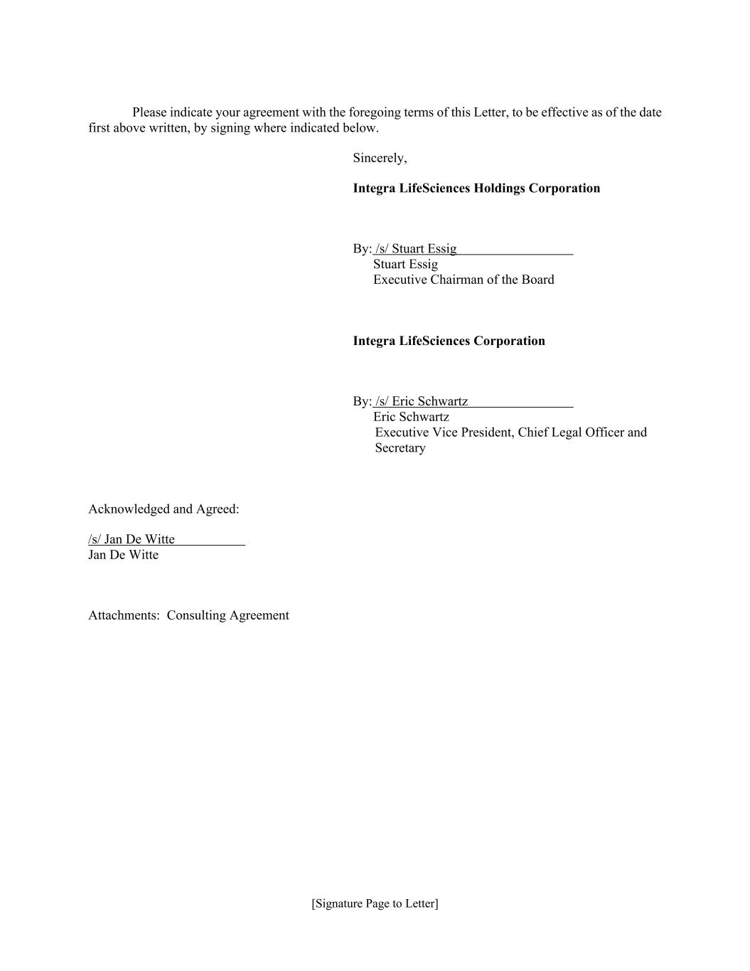 [Signature Page to Letter] Please indicate your agreement with the foregoing terms of this Letter, to be effective as of the date first above written, by signing where indicated below. Sincerely, Integra LifeSciences Holdings Corporation By: /s/ Stuart Essig Stuart Essig Executive Chairman of the Board Integra LifeSciences Corporation By: /s/ Eric Schwartz Eric Schwartz Executive Vice President, Chief Legal Officer and Secretary Acknowledged and Agreed: /s/ Jan De Witte Jan De Witte Attachments: Consulting Agreement