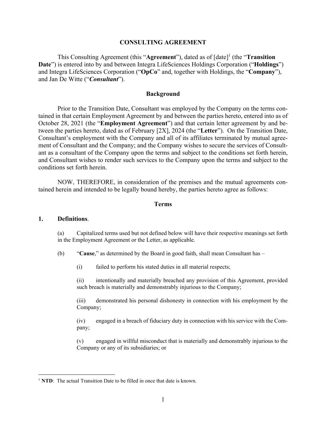 1 CONSULTING AGREEMENT This Consulting Agreement (this “Agreement”), dated as of [date]1 (the “Transition Date”) is entered into by and between Integra LifeSciences Holdings Corporation (“Holdings”) and Integra LifeSciences Corporation (“OpCo” and, together with Holdings, the “Company”), and Jan De Witte (“Consultant”). Background Prior to the Transition Date, Consultant was employed by the Company on the terms con- tained in that certain Employment Agreement by and between the parties hereto, entered into as of October 28, 2021 (the “Employment Agreement”) and that certain letter agreement by and be- tween the parties hereto, dated as of February [2X], 2024 (the “Letter”). On the Transition Date, Consultant’s employment with the Company and all of its affiliates terminated by mutual agree- ment of Consultant and the Company; and the Company wishes to secure the services of Consult- ant as a consultant of the Company upon the terms and subject to the conditions set forth herein, and Consultant wishes to render such services to the Company upon the terms and subject to the conditions set forth herein. NOW, THEREFORE, in consideration of the premises and the mutual agreements con- tained herein and intended to be legally bound hereby, the parties hereto agree as follows: Terms 1. Definitions. (a) Capitalized terms used but not defined below will have their respective meanings set forth in the Employment Agreement or the Letter, as applicable. (b) “Cause,” as determined by the Board in good faith, shall mean Consultant has – (i) failed to perform his stated duties in all material respects; (ii) intentionally and materially breached any provision of this Agreement, provided such breach is materially and demonstrably injurious to the Company; (iii) demonstrated his personal dishonesty in connection with his employment by the Company; (iv) engaged in a breach of fiduciary duty in connection with his service with the Com- pany; (v) engaged in willful misconduct that is materially and demonstrably injurious to the Company or any of its subsidiaries; or 1 NTD: The actual Transition Date to be filled in once that date is known.