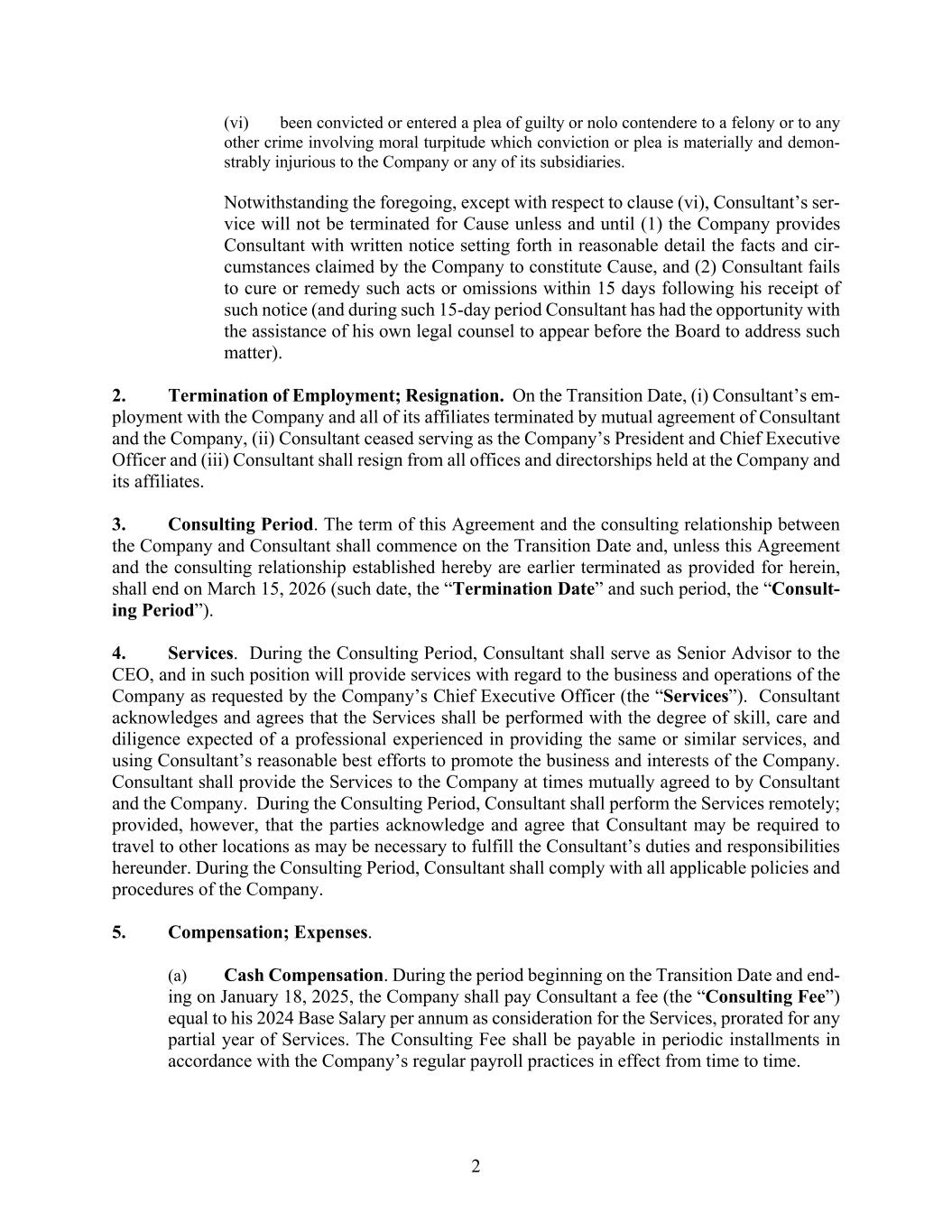 2 (vi) been convicted or entered a plea of guilty or nolo contendere to a felony or to any other crime involving moral turpitude which conviction or plea is materially and demon- strably injurious to the Company or any of its subsidiaries. Notwithstanding the foregoing, except with respect to clause (vi), Consultant’s ser- vice will not be terminated for Cause unless and until (1) the Company provides Consultant with written notice setting forth in reasonable detail the facts and cir- cumstances claimed by the Company to constitute Cause, and (2) Consultant fails to cure or remedy such acts or omissions within 15 days following his receipt of such notice (and during such 15-day period Consultant has had the opportunity with the assistance of his own legal counsel to appear before the Board to address such matter). 2. Termination of Employment; Resignation. On the Transition Date, (i) Consultant’s em- ployment with the Company and all of its affiliates terminated by mutual agreement of Consultant and the Company, (ii) Consultant ceased serving as the Company’s President and Chief Executive Officer and (iii) Consultant shall resign from all offices and directorships held at the Company and its affiliates. 3. Consulting Period. The term of this Agreement and the consulting relationship between the Company and Consultant shall commence on the Transition Date and, unless this Agreement and the consulting relationship established hereby are earlier terminated as provided for herein, shall end on March 15, 2026 (such date, the “Termination Date” and such period, the “Consult- ing Period”). 4. Services. During the Consulting Period, Consultant shall serve as Senior Advisor to the CEO, and in such position will provide services with regard to the business and operations of the Company as requested by the Company’s Chief Executive Officer (the “Services”). Consultant acknowledges and agrees that the Services shall be performed with the degree of skill, care and diligence expected of a professional experienced in providing the same or similar services, and using Consultant’s reasonable best efforts to promote the business and interests of the Company. Consultant shall provide the Services to the Company at times mutually agreed to by Consultant and the Company. During the Consulting Period, Consultant shall perform the Services remotely; provided, however, that the parties acknowledge and agree that Consultant may be required to travel to other locations as may be necessary to fulfill the Consultant’s duties and responsibilities hereunder. During the Consulting Period, Consultant shall comply with all applicable policies and procedures of the Company. 5. Compensation; Expenses. (a) Cash Compensation. During the period beginning on the Transition Date and end- ing on January 18, 2025, the Company shall pay Consultant a fee (the “Consulting Fee”) equal to his 2024 Base Salary per annum as consideration for the Services, prorated for any partial year of Services. The Consulting Fee shall be payable in periodic installments in accordance with the Company’s regular payroll practices in effect from time to time.