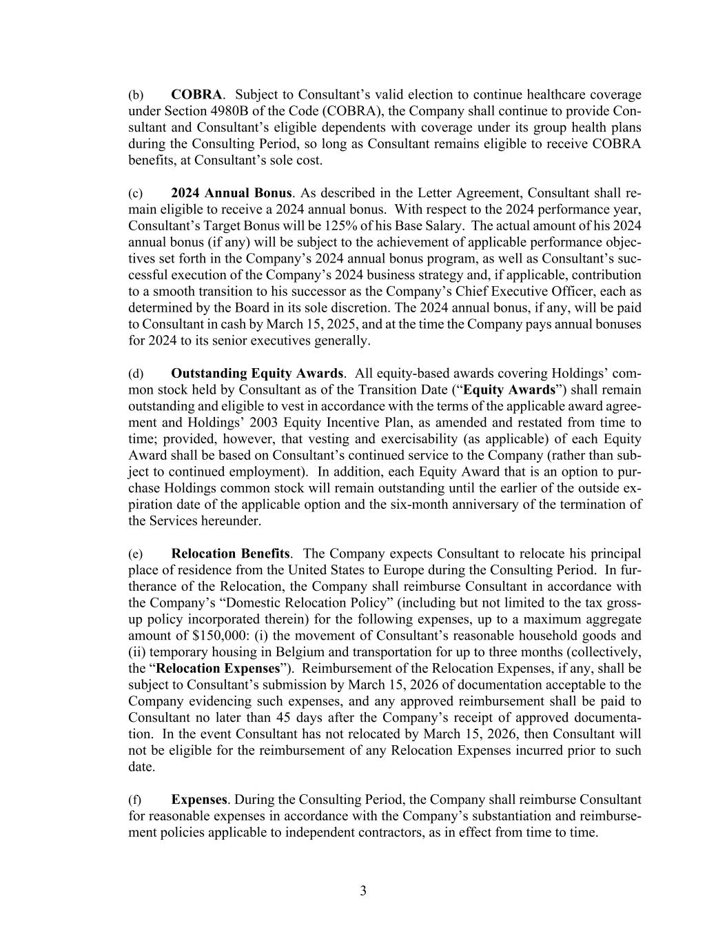 3 (b) COBRA. Subject to Consultant’s valid election to continue healthcare coverage under Section 4980B of the Code (COBRA), the Company shall continue to provide Con- sultant and Consultant’s eligible dependents with coverage under its group health plans during the Consulting Period, so long as Consultant remains eligible to receive COBRA benefits, at Consultant’s sole cost. (c) 2024 Annual Bonus. As described in the Letter Agreement, Consultant shall re- main eligible to receive a 2024 annual bonus. With respect to the 2024 performance year, Consultant’s Target Bonus will be 125% of his Base Salary. The actual amount of his 2024 annual bonus (if any) will be subject to the achievement of applicable performance objec- tives set forth in the Company’s 2024 annual bonus program, as well as Consultant’s suc- cessful execution of the Company’s 2024 business strategy and, if applicable, contribution to a smooth transition to his successor as the Company’s Chief Executive Officer, each as determined by the Board in its sole discretion. The 2024 annual bonus, if any, will be paid to Consultant in cash by March 15, 2025, and at the time the Company pays annual bonuses for 2024 to its senior executives generally. (d) Outstanding Equity Awards. All equity-based awards covering Holdings’ com- mon stock held by Consultant as of the Transition Date (“Equity Awards”) shall remain outstanding and eligible to vest in accordance with the terms of the applicable award agree- ment and Holdings’ 2003 Equity Incentive Plan, as amended and restated from time to time; provided, however, that vesting and exercisability (as applicable) of each Equity Award shall be based on Consultant’s continued service to the Company (rather than sub- ject to continued employment). In addition, each Equity Award that is an option to pur- chase Holdings common stock will remain outstanding until the earlier of the outside ex- piration date of the applicable option and the six-month anniversary of the termination of the Services hereunder. (e) Relocation Benefits. The Company expects Consultant to relocate his principal place of residence from the United States to Europe during the Consulting Period. In fur- therance of the Relocation, the Company shall reimburse Consultant in accordance with the Company’s “Domestic Relocation Policy” (including but not limited to the tax gross- up policy incorporated therein) for the following expenses, up to a maximum aggregate amount of $150,000: (i) the movement of Consultant’s reasonable household goods and (ii) temporary housing in Belgium and transportation for up to three months (collectively, the “Relocation Expenses”). Reimbursement of the Relocation Expenses, if any, shall be subject to Consultant’s submission by March 15, 2026 of documentation acceptable to the Company evidencing such expenses, and any approved reimbursement shall be paid to Consultant no later than 45 days after the Company’s receipt of approved documenta- tion. In the event Consultant has not relocated by March 15, 2026, then Consultant will not be eligible for the reimbursement of any Relocation Expenses incurred prior to such date. (f) Expenses. During the Consulting Period, the Company shall reimburse Consultant for reasonable expenses in accordance with the Company’s substantiation and reimburse- ment policies applicable to independent contractors, as in effect from time to time.