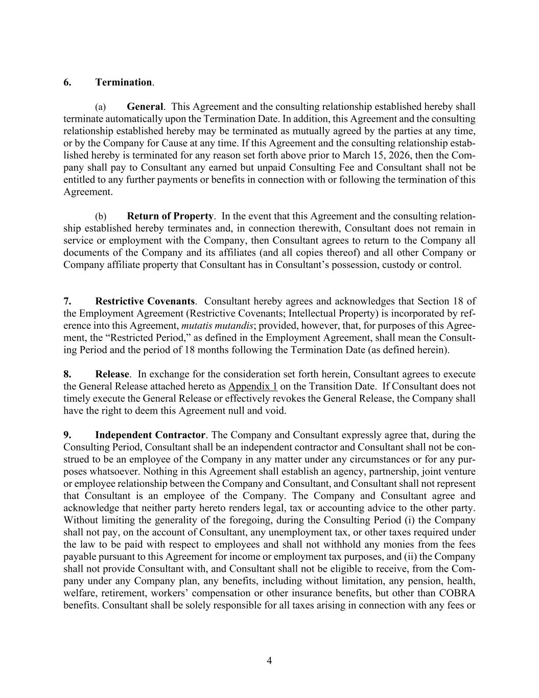 4 6. Termination. (a) General. This Agreement and the consulting relationship established hereby shall terminate automatically upon the Termination Date. In addition, this Agreement and the consulting relationship established hereby may be terminated as mutually agreed by the parties at any time, or by the Company for Cause at any time. If this Agreement and the consulting relationship estab- lished hereby is terminated for any reason set forth above prior to March 15, 2026, then the Com- pany shall pay to Consultant any earned but unpaid Consulting Fee and Consultant shall not be entitled to any further payments or benefits in connection with or following the termination of this Agreement. (b) Return of Property. In the event that this Agreement and the consulting relation- ship established hereby terminates and, in connection therewith, Consultant does not remain in service or employment with the Company, then Consultant agrees to return to the Company all documents of the Company and its affiliates (and all copies thereof) and all other Company or Company affiliate property that Consultant has in Consultant’s possession, custody or control. 7. Restrictive Covenants. Consultant hereby agrees and acknowledges that Section 18 of the Employment Agreement (Restrictive Covenants; Intellectual Property) is incorporated by ref- erence into this Agreement, mutatis mutandis; provided, however, that, for purposes of this Agree- ment, the “Restricted Period,” as defined in the Employment Agreement, shall mean the Consult- ing Period and the period of 18 months following the Termination Date (as defined herein). 8. Release. In exchange for the consideration set forth herein, Consultant agrees to execute the General Release attached hereto as Appendix 1 on the Transition Date. If Consultant does not timely execute the General Release or effectively revokes the General Release, the Company shall have the right to deem this Agreement null and void. 9. Independent Contractor. The Company and Consultant expressly agree that, during the Consulting Period, Consultant shall be an independent contractor and Consultant shall not be con- strued to be an employee of the Company in any matter under any circumstances or for any pur- poses whatsoever. Nothing in this Agreement shall establish an agency, partnership, joint venture or employee relationship between the Company and Consultant, and Consultant shall not represent that Consultant is an employee of the Company. The Company and Consultant agree and acknowledge that neither party hereto renders legal, tax or accounting advice to the other party. Without limiting the generality of the foregoing, during the Consulting Period (i) the Company shall not pay, on the account of Consultant, any unemployment tax, or other taxes required under the law to be paid with respect to employees and shall not withhold any monies from the fees payable pursuant to this Agreement for income or employment tax purposes, and (ii) the Company shall not provide Consultant with, and Consultant shall not be eligible to receive, from the Com- pany under any Company plan, any benefits, including without limitation, any pension, health, welfare, retirement, workers’ compensation or other insurance benefits, but other than COBRA benefits. Consultant shall be solely responsible for all taxes arising in connection with any fees or