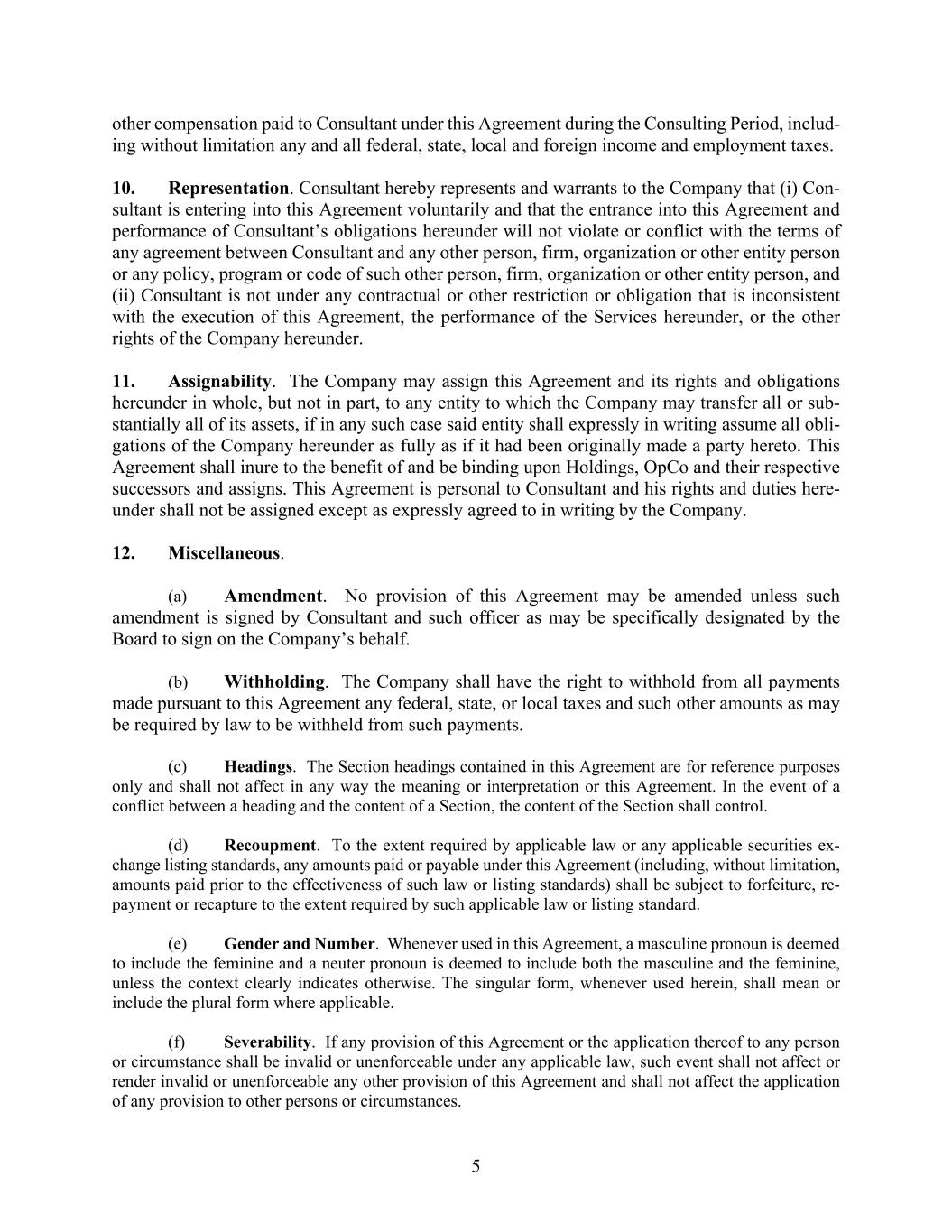 5 other compensation paid to Consultant under this Agreement during the Consulting Period, includ- ing without limitation any and all federal, state, local and foreign income and employment taxes. 10. Representation. Consultant hereby represents and warrants to the Company that (i) Con- sultant is entering into this Agreement voluntarily and that the entrance into this Agreement and performance of Consultant’s obligations hereunder will not violate or conflict with the terms of any agreement between Consultant and any other person, firm, organization or other entity person or any policy, program or code of such other person, firm, organization or other entity person, and (ii) Consultant is not under any contractual or other restriction or obligation that is inconsistent with the execution of this Agreement, the performance of the Services hereunder, or the other rights of the Company hereunder. 11. Assignability. The Company may assign this Agreement and its rights and obligations hereunder in whole, but not in part, to any entity to which the Company may transfer all or sub- stantially all of its assets, if in any such case said entity shall expressly in writing assume all obli- gations of the Company hereunder as fully as if it had been originally made a party hereto. This Agreement shall inure to the benefit of and be binding upon Holdings, OpCo and their respective successors and assigns. This Agreement is personal to Consultant and his rights and duties here- under shall not be assigned except as expressly agreed to in writing by the Company. 12. Miscellaneous. (a) Amendment. No provision of this Agreement may be amended unless such amendment is signed by Consultant and such officer as may be specifically designated by the Board to sign on the Company’s behalf. (b) Withholding. The Company shall have the right to withhold from all payments made pursuant to this Agreement any federal, state, or local taxes and such other amounts as may be required by law to be withheld from such payments. (c) Headings. The Section headings contained in this Agreement are for reference purposes only and shall not affect in any way the meaning or interpretation or this Agreement. In the event of a conflict between a heading and the content of a Section, the content of the Section shall control. (d) Recoupment. To the extent required by applicable law or any applicable securities ex- change listing standards, any amounts paid or payable under this Agreement (including, without limitation, amounts paid prior to the effectiveness of such law or listing standards) shall be subject to forfeiture, re- payment or recapture to the extent required by such applicable law or listing standard. (e) Gender and Number. Whenever used in this Agreement, a masculine pronoun is deemed to include the feminine and a neuter pronoun is deemed to include both the masculine and the feminine, unless the context clearly indicates otherwise. The singular form, whenever used herein, shall mean or include the plural form where applicable. (f) Severability. If any provision of this Agreement or the application thereof to any person or circumstance shall be invalid or unenforceable under any applicable law, such event shall not affect or render invalid or unenforceable any other provision of this Agreement and shall not affect the application of any provision to other persons or circumstances.