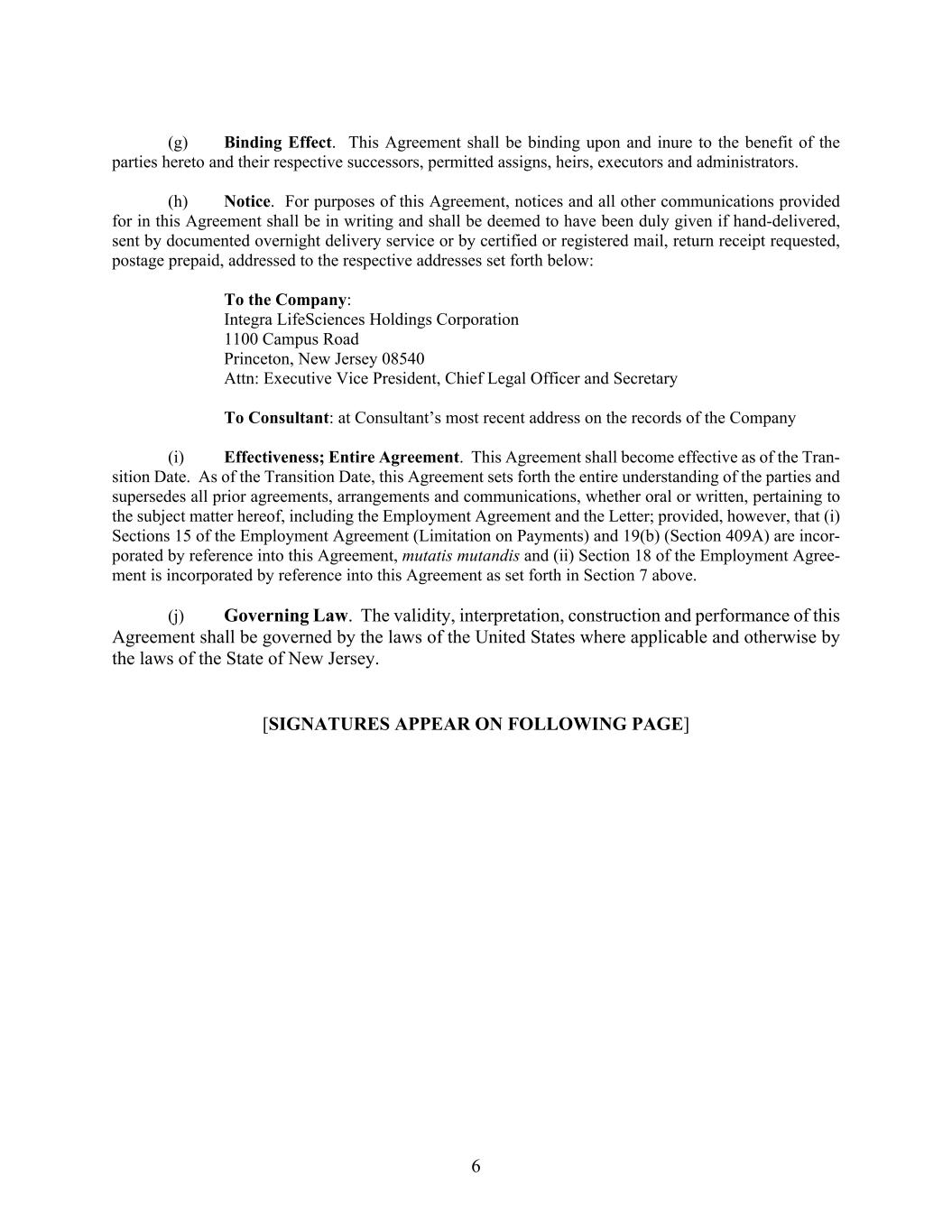6 (g) Binding Effect. This Agreement shall be binding upon and inure to the benefit of the parties hereto and their respective successors, permitted assigns, heirs, executors and administrators. (h) Notice. For purposes of this Agreement, notices and all other communications provided for in this Agreement shall be in writing and shall be deemed to have been duly given if hand-delivered, sent by documented overnight delivery service or by certified or registered mail, return receipt requested, postage prepaid, addressed to the respective addresses set forth below: To the Company: Integra LifeSciences Holdings Corporation 1100 Campus Road Princeton, New Jersey 08540 Attn: Executive Vice President, Chief Legal Officer and Secretary To Consultant: at Consultant’s most recent address on the records of the Company (i) Effectiveness; Entire Agreement. This Agreement shall become effective as of the Tran- sition Date. As of the Transition Date, this Agreement sets forth the entire understanding of the parties and supersedes all prior agreements, arrangements and communications, whether oral or written, pertaining to the subject matter hereof, including the Employment Agreement and the Letter; provided, however, that (i) Sections 15 of the Employment Agreement (Limitation on Payments) and 19(b) (Section 409A) are incor- porated by reference into this Agreement, mutatis mutandis and (ii) Section 18 of the Employment Agree- ment is incorporated by reference into this Agreement as set forth in Section 7 above. (j) Governing Law. The validity, interpretation, construction and performance of this Agreement shall be governed by the laws of the United States where applicable and otherwise by the laws of the State of New Jersey. [SIGNATURES APPEAR ON FOLLOWING PAGE]