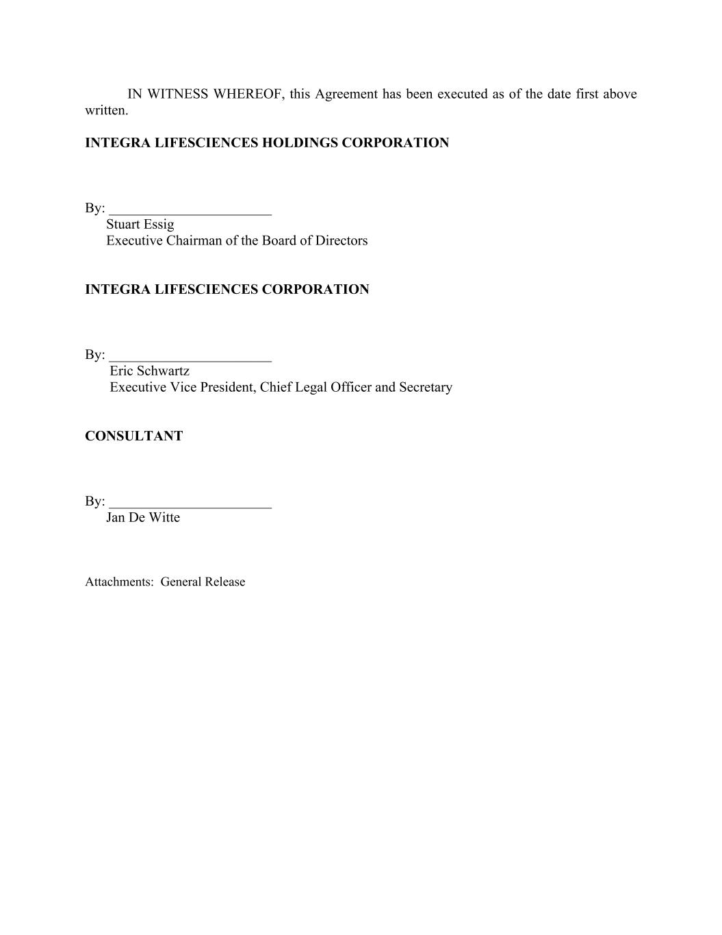 IN WITNESS WHEREOF, this Agreement has been executed as of the date first above written. INTEGRA LIFESCIENCES HOLDINGS CORPORATION By: _______________________ Stuart Essig Executive Chairman of the Board of Directors INTEGRA LIFESCIENCES CORPORATION By: _______________________ Eric Schwartz Executive Vice President, Chief Legal Officer and Secretary CONSULTANT By: _______________________ Jan De Witte Attachments: General Release