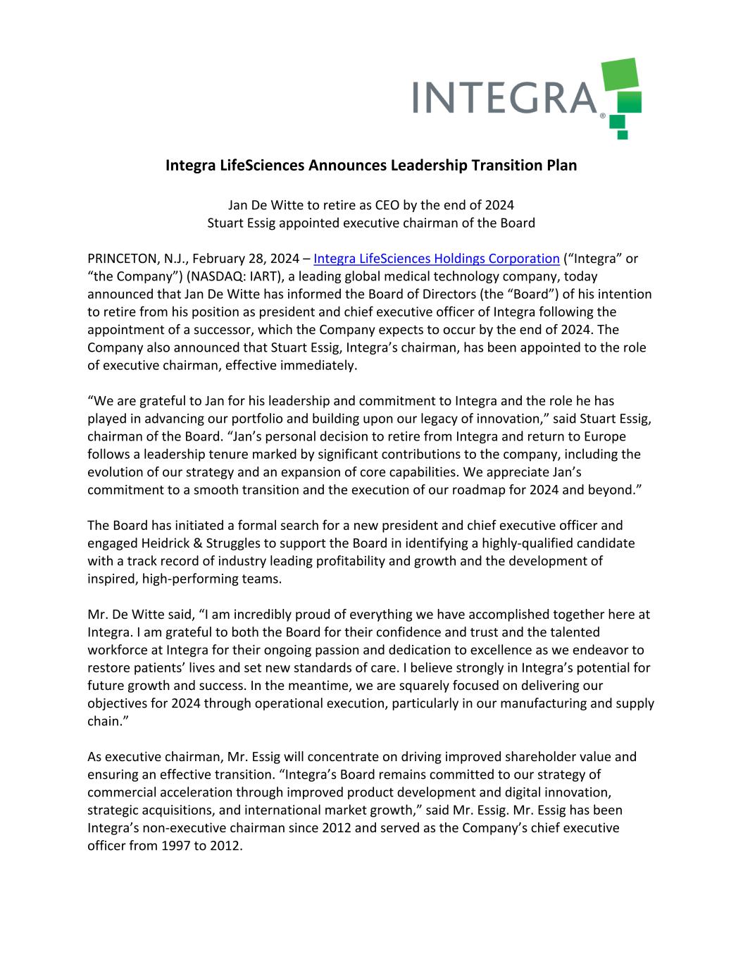 Integra LifeSciences Announces Leadership Transition Plan Jan De Witte to retire as CEO by the end of 2024 Stuart Essig appointed executive chairman of the Board PRINCETON, N.J., February 28, 2024 – Integra LifeSciences Holdings Corporation (“Integra” or “the Company”) (NASDAQ: IART), a leading global medical technology company, today announced that Jan De Witte has informed the Board of Directors (the “Board”) of his intention to retire from his position as president and chief executive officer of Integra following the appointment of a successor, which the Company expects to occur by the end of 2024. The Company also announced that Stuart Essig, Integra’s chairman, has been appointed to the role of executive chairman, effective immediately. “We are grateful to Jan for his leadership and commitment to Integra and the role he has played in advancing our portfolio and building upon our legacy of innovation,” said Stuart Essig, chairman of the Board. “Jan’s personal decision to retire from Integra and return to Europe follows a leadership tenure marked by significant contributions to the company, including the evolution of our strategy and an expansion of core capabilities. We appreciate Jan’s commitment to a smooth transition and the execution of our roadmap for 2024 and beyond.” The Board has initiated a formal search for a new president and chief executive officer and engaged Heidrick & Struggles to support the Board in identifying a highly‐qualified candidate with a track record of industry leading profitability and growth and the development of inspired, high‐performing teams. Mr. De Witte said, “I am incredibly proud of everything we have accomplished together here at Integra. I am grateful to both the Board for their confidence and trust and the talented workforce at Integra for their ongoing passion and dedication to excellence as we endeavor to restore patients’ lives and set new standards of care. I believe strongly in Integra’s potential for future growth and success. In the meantime, we are squarely focused on delivering our objectives for 2024 through operational execution, particularly in our manufacturing and supply chain.” As executive chairman, Mr. Essig will concentrate on driving improved shareholder value and ensuring an effective transition. “Integra’s Board remains committed to our strategy of commercial acceleration through improved product development and digital innovation, strategic acquisitions, and international market growth,” said Mr. Essig. Mr. Essig has been Integra’s non‐executive chairman since 2012 and served as the Company’s chief executive officer from 1997 to 2012.