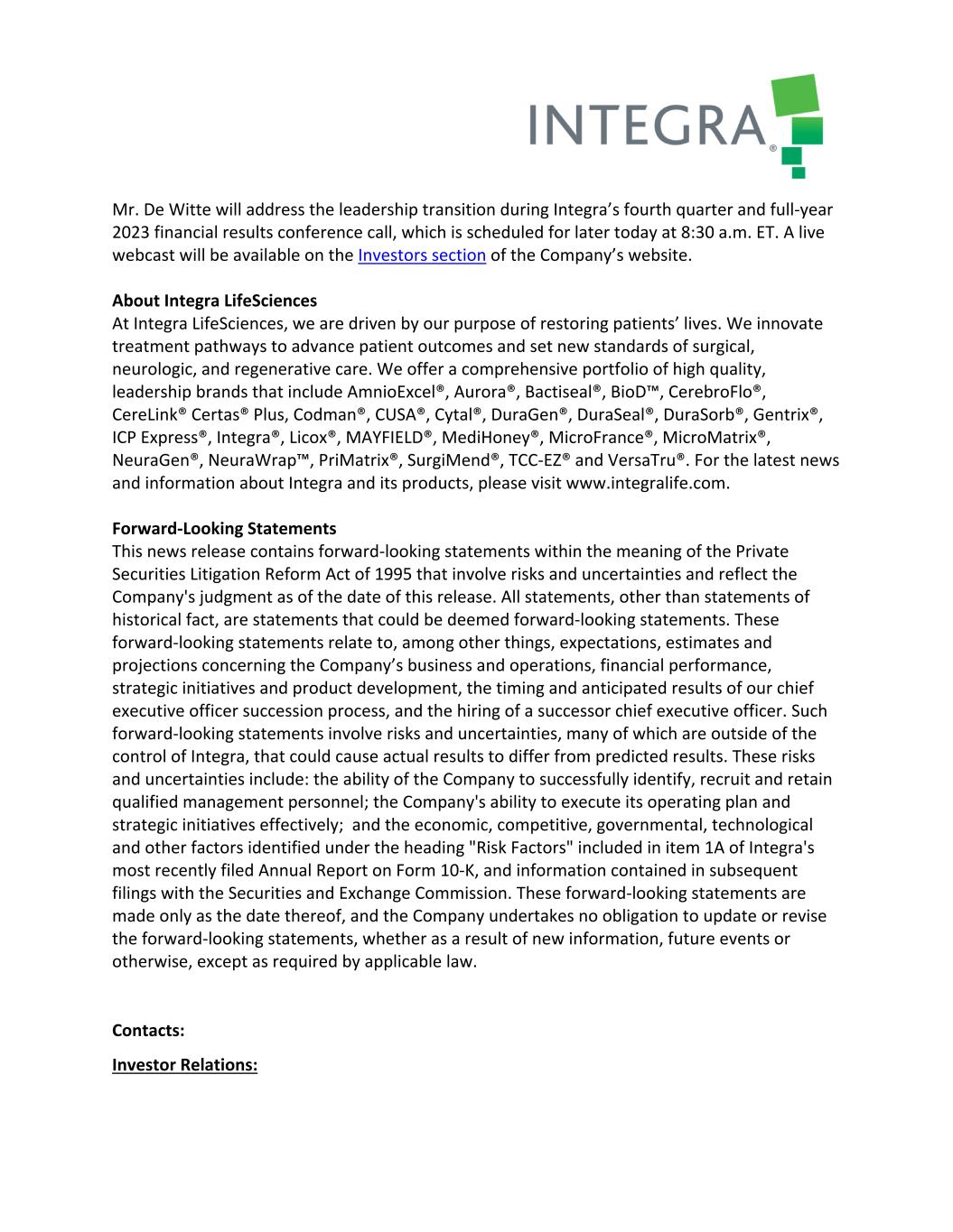 Mr. De Witte will address the leadership transition during Integra’s fourth quarter and full‐year 2023 financial results conference call, which is scheduled for later today at 8:30 a.m. ET. A live webcast will be available on the Investors section of the Company’s website. About Integra LifeSciences At Integra LifeSciences, we are driven by our purpose of restoring patients’ lives. We innovate treatment pathways to advance patient outcomes and set new standards of surgical, neurologic, and regenerative care. We offer a comprehensive portfolio of high quality, leadership brands that include AmnioExcel®, Aurora®, Bactiseal®, BioD™, CerebroFlo®, CereLink® Certas® Plus, Codman®, CUSA®, Cytal®, DuraGen®, DuraSeal®, DuraSorb®, Gentrix®, ICP Express®, Integra®, Licox®, MAYFIELD®, MediHoney®, MicroFrance®, MicroMatrix®, NeuraGen®, NeuraWrap™, PriMatrix®, SurgiMend®, TCC‐EZ® and VersaTru®. For the latest news and information about Integra and its products, please visit www.integralife.com. Forward‐Looking Statements This news release contains forward‐looking statements within the meaning of the Private Securities Litigation Reform Act of 1995 that involve risks and uncertainties and reflect the Company's judgment as of the date of this release. All statements, other than statements of historical fact, are statements that could be deemed forward‐looking statements. These forward‐looking statements relate to, among other things, expectations, estimates and projections concerning the Company’s business and operations, financial performance, strategic initiatives and product development, the timing and anticipated results of our chief executive officer succession process, and the hiring of a successor chief executive officer. Such forward‐looking statements involve risks and uncertainties, many of which are outside of the control of Integra, that could cause actual results to differ from predicted results. These risks and uncertainties include: the ability of the Company to successfully identify, recruit and retain qualified management personnel; the Company's ability to execute its operating plan and strategic initiatives effectively; and the economic, competitive, governmental, technological and other factors identified under the heading "Risk Factors" included in item 1A of Integra's most recently filed Annual Report on Form 10‐K, and information contained in subsequent filings with the Securities and Exchange Commission. These forward‐looking statements are made only as the date thereof, and the Company undertakes no obligation to update or revise the forward‐looking statements, whether as a result of new information, future events or otherwise, except as required by applicable law. Contacts: Investor Relations: