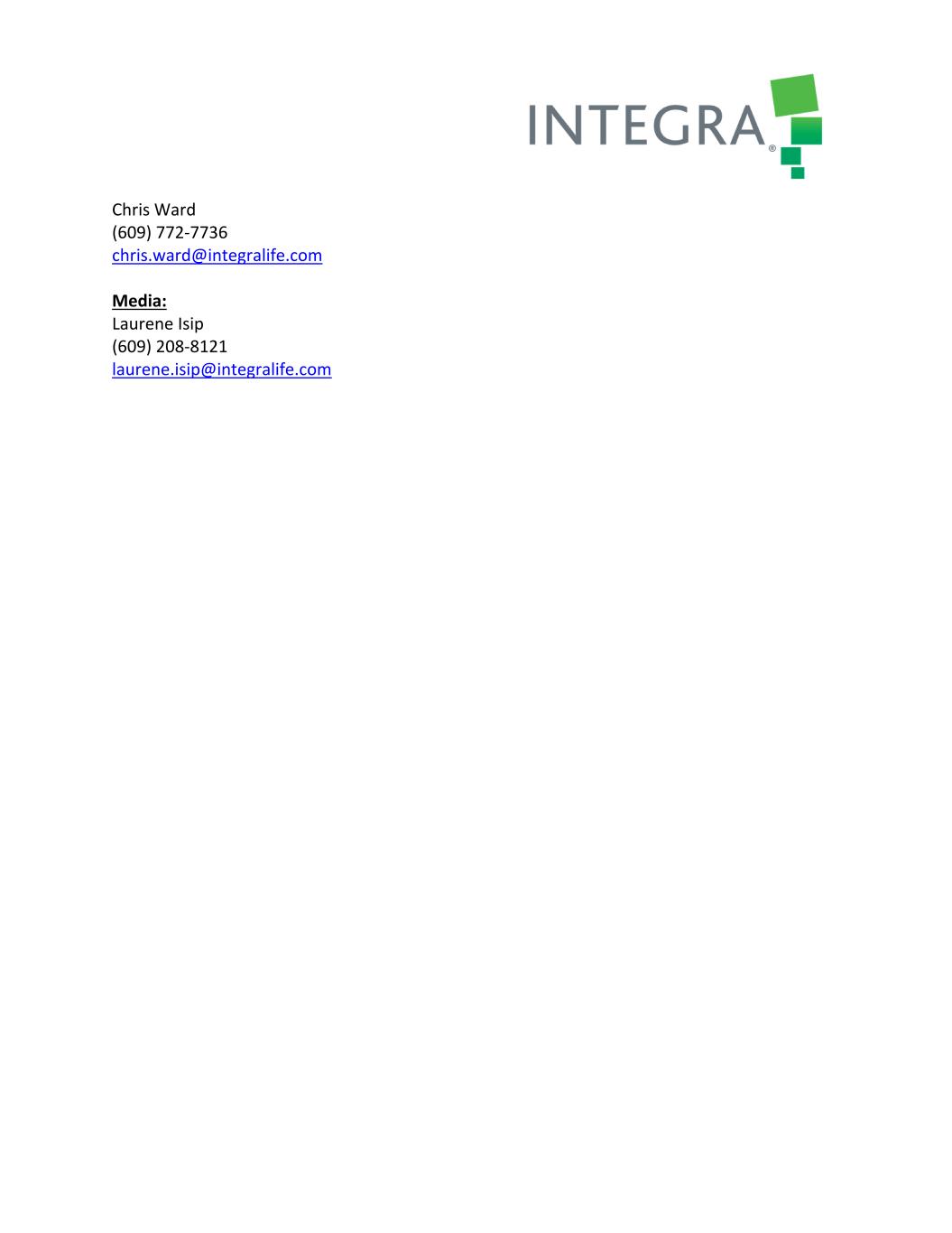 Chris Ward (609) 772‐7736 chris.ward@integralife.com Media: Laurene Isip (609) 208‐8121 laurene.isip@integralife.com