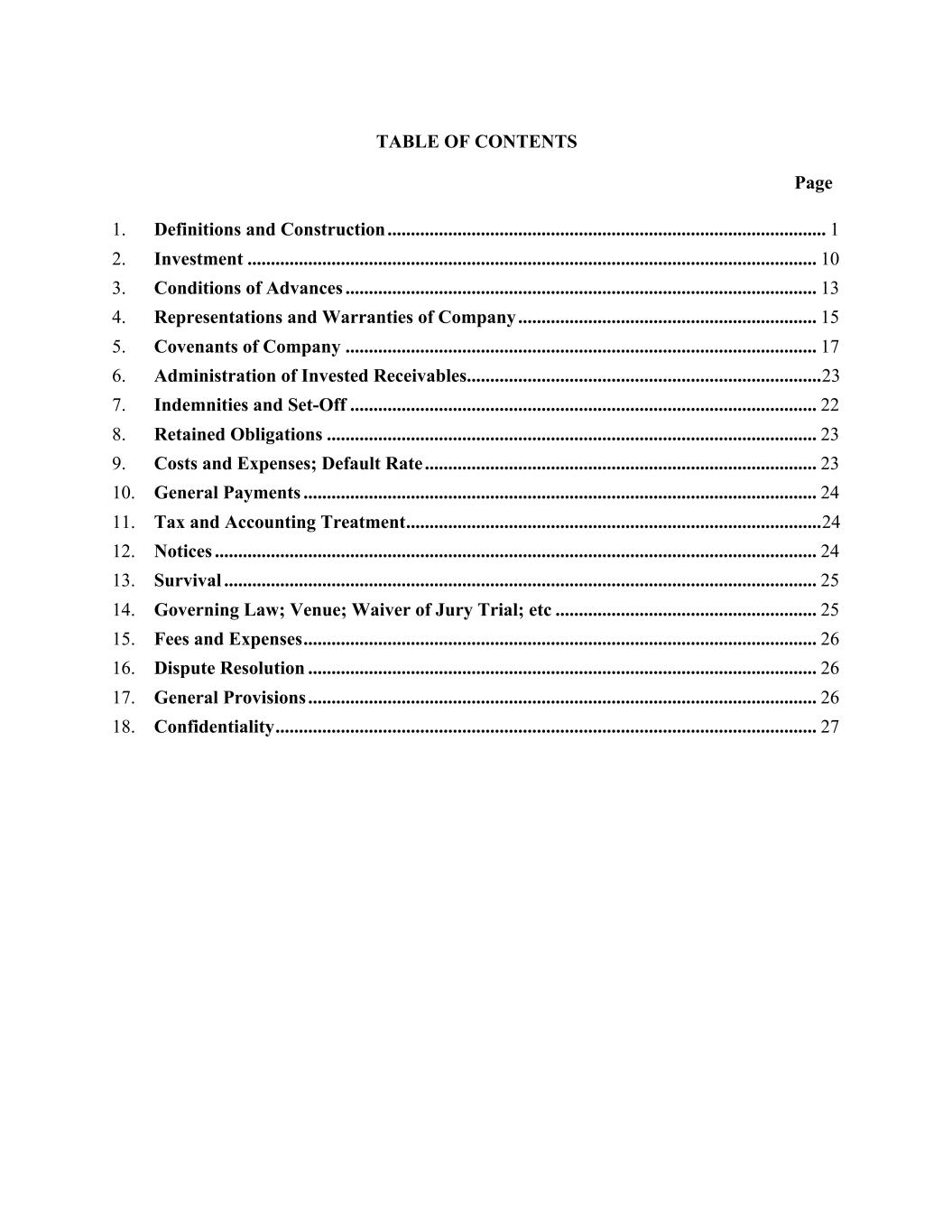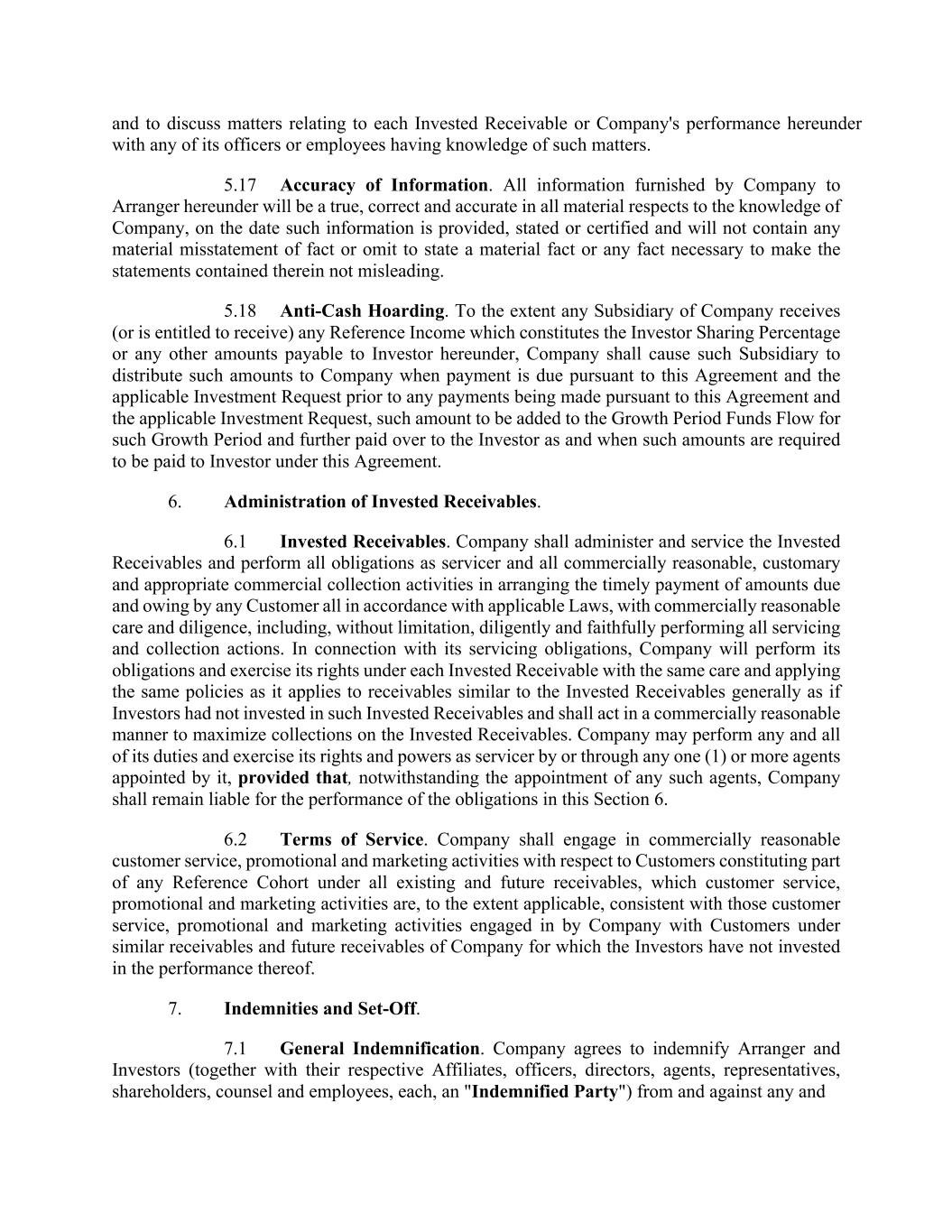 and to discuss matters relating to each Invested Receivable or Company's performance hereunder with any of its officers or employees having knowledge of such matters. 5.17 Accuracy of Information. All information furnished by Company to Arranger hereunder will be a true, correct and accurate in all material respects to the knowledge of Company, on the date such information is provided, stated or certified and will not contain any material misstatement of fact or omit to state a material fact or any fact necessary to make the statements contained therein not misleading. 5.18 Anti-Cash Hoarding. To the extent any Subsidiary of Company receives (or is entitled to receive) any Reference Income which constitutes the Investor Sharing Percentage or any other amounts payable to Investor hereunder, Company shall cause such Subsidiary to distribute such amounts to Company when payment is due pursuant to this Agreement and the applicable Investment Request prior to any payments being made pursuant to this Agreement and the applicable Investment Request, such amount to be added to the Growth Period Funds Flow for such Growth Period and further paid over to the Investor as and when such amounts are required to be paid to Investor under this Agreement. 6. Administration of Invested Receivables. 6.1 Invested Receivables. Company shall administer and service the Invested Receivables and perform all obligations as servicer and all commercially reasonable, customary and appropriate commercial collection activities in arranging the timely payment of amounts due and owing by any Customer all in accordance with applicable Laws, with commercially reasonable care and diligence, including, without limitation, diligently and faithfully performing all servicing and collection actions. In connection with its servicing obligations, Company will perform its obligations and exercise its rights under each Invested Receivable with the same care and applying the same policies as it applies to receivables similar to the Invested Receivables generally as if Investors had not invested in such Invested Receivables and shall act in a commercially reasonable manner to maximize collections on the Invested Receivables. Company may perform any and all of its duties and exercise its rights and powers as servicer by or through any one (1) or more agents appointed by it, provided that, notwithstanding the appointment of any such agents, Company shall remain liable for the performance of the obligations in this Section 6. 6.2 Terms of Service. Company shall engage in commercially reasonable customer service, promotional and marketing activities with respect to Customers constituting part of any Reference Cohort under all existing and future receivables, which customer service, promotional and marketing activities are, to the extent applicable, consistent with those customer service, promotional and marketing activities engaged in by Company with Customers under similar receivables and future receivables of Company for which the Investors have not invested in the performance thereof. 7. Indemnities and Set-Off. 7.1 General Indemnification. Company agrees to indemnify Arranger and Investors (together with their respective Affiliates, officers, directors, agents, representatives, shareholders, counsel and employees, each, an "Indemnified Party") from and against any and