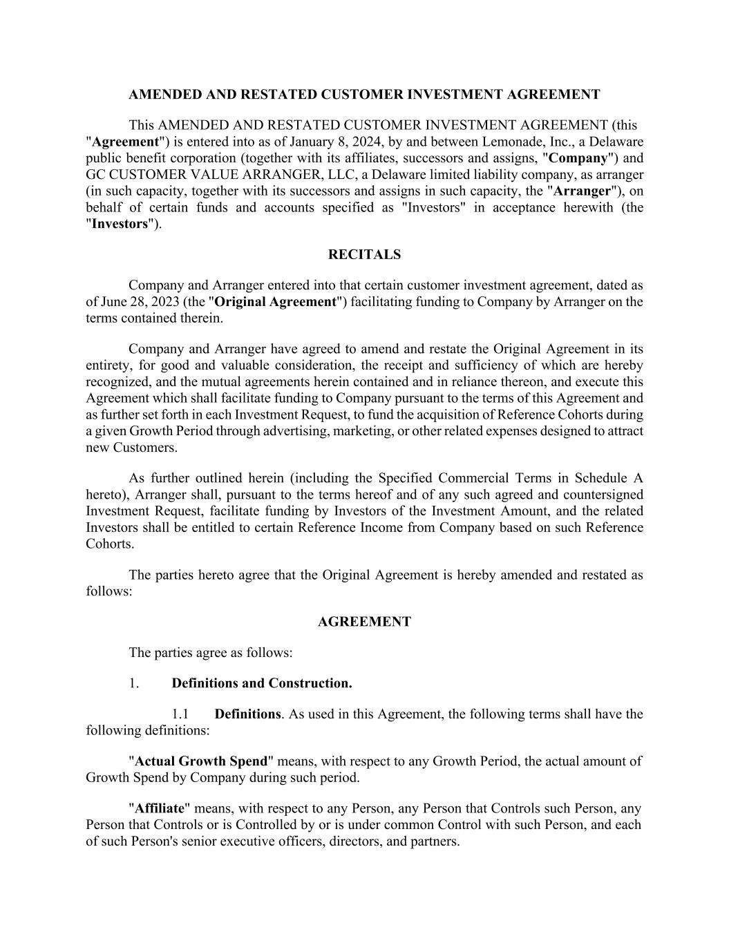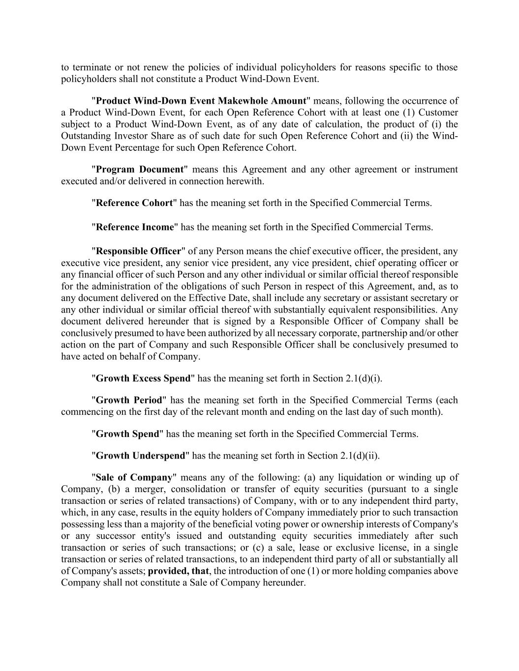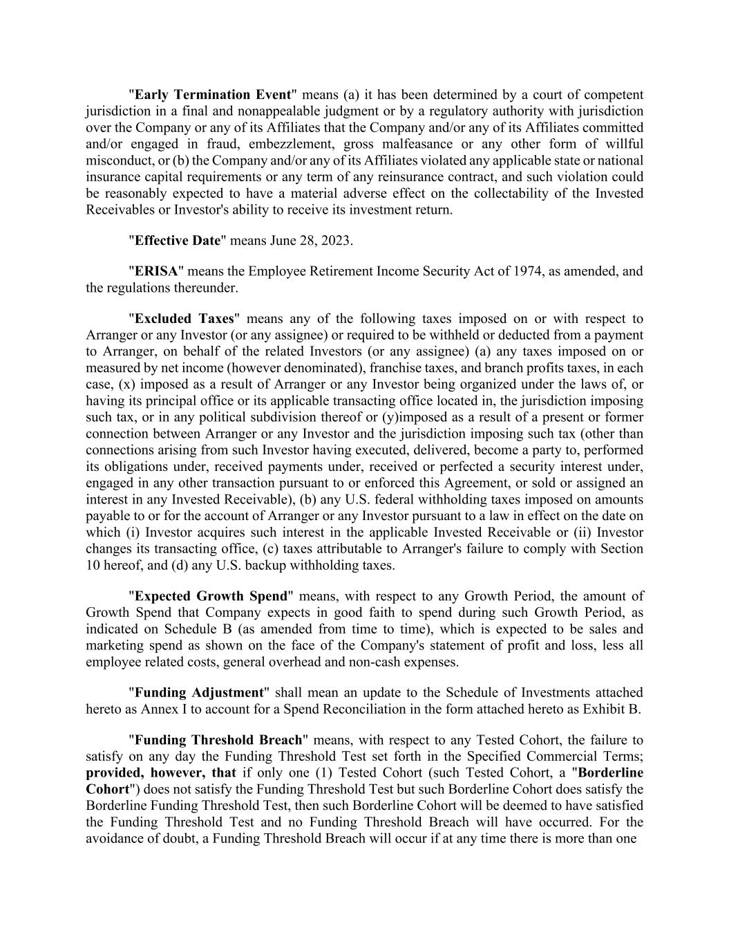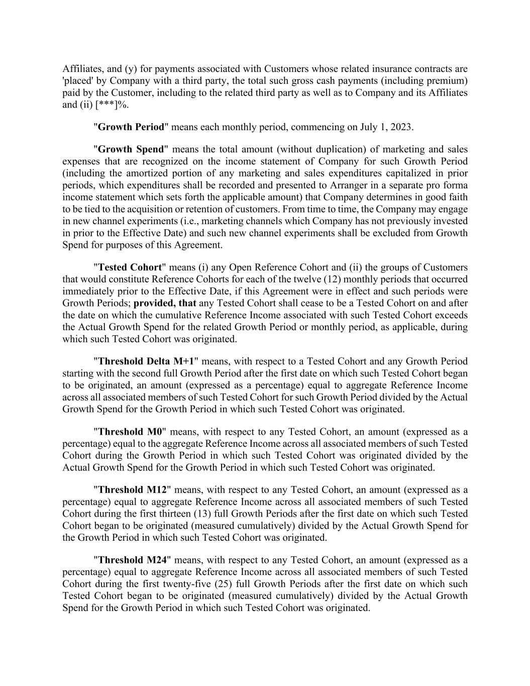 Affiliates, and (y) for payments associated with Customers whose related insurance contracts are 'placed' by Company with a third party, the total such gross cash payments (including premium) paid by the Customer, including to the related third party as well as to Company and its Affiliates and (ii) [***]%. "Growth Period" means each monthly period, commencing on July 1, 2023. "Growth Spend" means the total amount (without duplication) of marketing and sales expenses that are recognized on the income statement of Company for such Growth Period (including the amortized portion of any marketing and sales expenditures capitalized in prior periods, which expenditures shall be recorded and presented to Arranger in a separate pro forma income statement which sets forth the applicable amount) that Company determines in good faith to be tied to the acquisition or retention of customers. From time to time, the Company may engage in new channel experiments (i.e., marketing channels which Company has not previously invested in prior to the Effective Date) and such new channel experiments shall be excluded from Growth Spend for purposes of this Agreement. "Tested Cohort" means (i) any Open Reference Cohort and (ii) the groups of Customers that would constitute Reference Cohorts for each of the twelve (12) monthly periods that occurred immediately prior to the Effective Date, if this Agreement were in effect and such periods were Growth Periods; provided, that any Tested Cohort shall cease to be a Tested Cohort on and after the date on which the cumulative Reference Income associated with such Tested Cohort exceeds the Actual Growth Spend for the related Growth Period or monthly period, as applicable, during which such Tested Cohort was originated. "Threshold Delta M+1" means, with respect to a Tested Cohort and any Growth Period starting with the second full Growth Period after the first date on which such Tested Cohort began to be originated, an amount (expressed as a percentage) equal to aggregate Reference Income across all associated members of such Tested Cohort for such Growth Period divided by the Actual Growth Spend for the Growth Period in which such Tested Cohort was originated. "Threshold M0" means, with respect to any Tested Cohort, an amount (expressed as a percentage) equal to the aggregate Reference Income across all associated members of such Tested Cohort during the Growth Period in which such Tested Cohort was originated divided by the Actual Growth Spend for the Growth Period in which such Tested Cohort was originated. "Threshold M12" means, with respect to any Tested Cohort, an amount (expressed as a percentage) equal to aggregate Reference Income across all associated members of such Tested Cohort during the first thirteen (13) full Growth Periods after the first date on which such Tested Cohort began to be originated (measured cumulatively) divided by the Actual Growth Spend for the Growth Period in which such Tested Cohort was originated. "Threshold M24" means, with respect to any Tested Cohort, an amount (expressed as a percentage) equal to aggregate Reference Income across all associated members of such Tested Cohort during the first twenty-five (25) full Growth Periods after the first date on which such Tested Cohort began to be originated (measured cumulatively) divided by the Actual Growth Spend for the Growth Period in which such Tested Cohort was originated.
