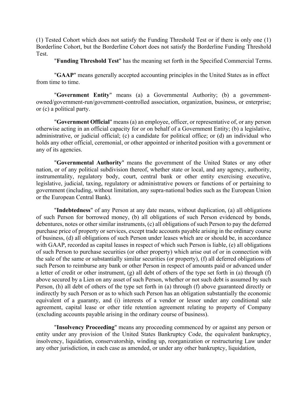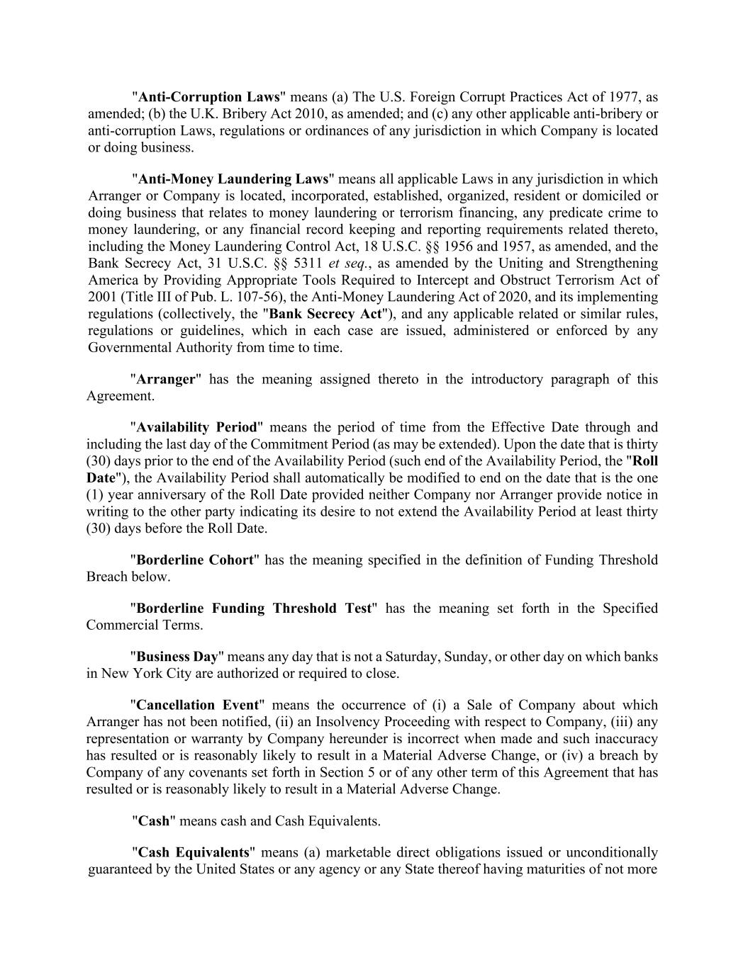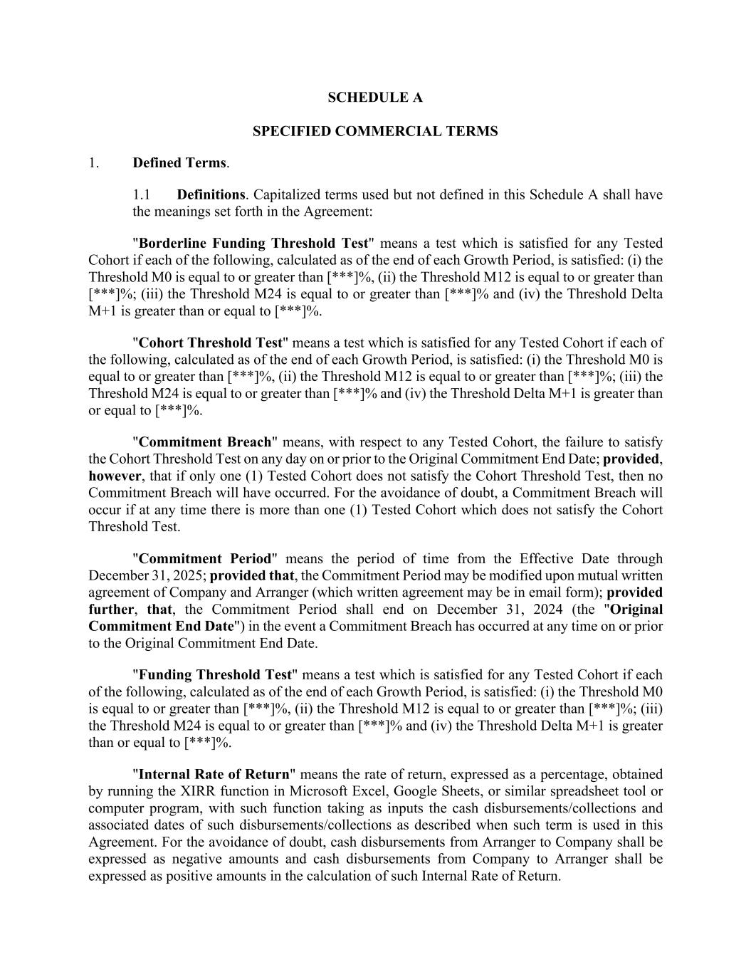 SCHEDULE A SPECIFIED COMMERCIAL TERMS 1. Defined Terms. 1.1 Definitions. Capitalized terms used but not defined in this Schedule A shall have the meanings set forth in the Agreement: "Borderline Funding Threshold Test" means a test which is satisfied for any Tested Cohort if each of the following, calculated as of the end of each Growth Period, is satisfied: (i) the Threshold M0 is equal to or greater than [***]%, (ii) the Threshold M12 is equal to or greater than [***]%; (iii) the Threshold M24 is equal to or greater than [***]% and (iv) the Threshold Delta M+1 is greater than or equal to [***]%. "Cohort Threshold Test" means a test which is satisfied for any Tested Cohort if each of the following, calculated as of the end of each Growth Period, is satisfied: (i) the Threshold M0 is equal to or greater than [***]%, (ii) the Threshold M12 is equal to or greater than [***]%; (iii) the Threshold M24 is equal to or greater than [***]% and (iv) the Threshold Delta M+1 is greater than or equal to [***]%. "Commitment Breach" means, with respect to any Tested Cohort, the failure to satisfy the Cohort Threshold Test on any day on or prior to the Original Commitment End Date; provided, however, that if only one (1) Tested Cohort does not satisfy the Cohort Threshold Test, then no Commitment Breach will have occurred. For the avoidance of doubt, a Commitment Breach will occur if at any time there is more than one (1) Tested Cohort which does not satisfy the Cohort Threshold Test. "Commitment Period" means the period of time from the Effective Date through December 31, 2025; provided that, the Commitment Period may be modified upon mutual written agreement of Company and Arranger (which written agreement may be in email form); provided further, that, the Commitment Period shall end on December 31, 2024 (the "Original Commitment End Date") in the event a Commitment Breach has occurred at any time on or prior to the Original Commitment End Date. "Funding Threshold Test" means a test which is satisfied for any Tested Cohort if each of the following, calculated as of the end of each Growth Period, is satisfied: (i) the Threshold M0 is equal to or greater than [***]%, (ii) the Threshold M12 is equal to or greater than [***]%; (iii) the Threshold M24 is equal to or greater than [***]% and (iv) the Threshold Delta M+1 is greater than or equal to [***]%. "Internal Rate of Return" means the rate of return, expressed as a percentage, obtained by running the XIRR function in Microsoft Excel, Google Sheets, or similar spreadsheet tool or computer program, with such function taking as inputs the cash disbursements/collections and associated dates of such disbursements/collections as described when such term is used in this Agreement. For the avoidance of doubt, cash disbursements from Arranger to Company shall be expressed as negative amounts and cash disbursements from Company to Arranger shall be expressed as positive amounts in the calculation of such Internal Rate of Return.