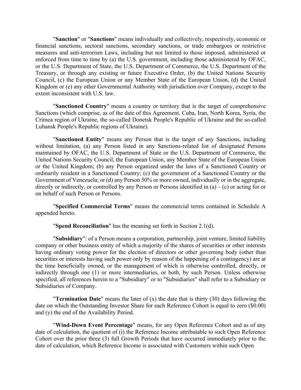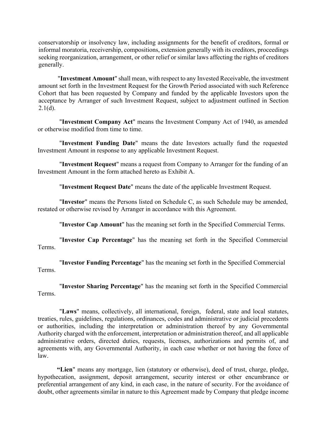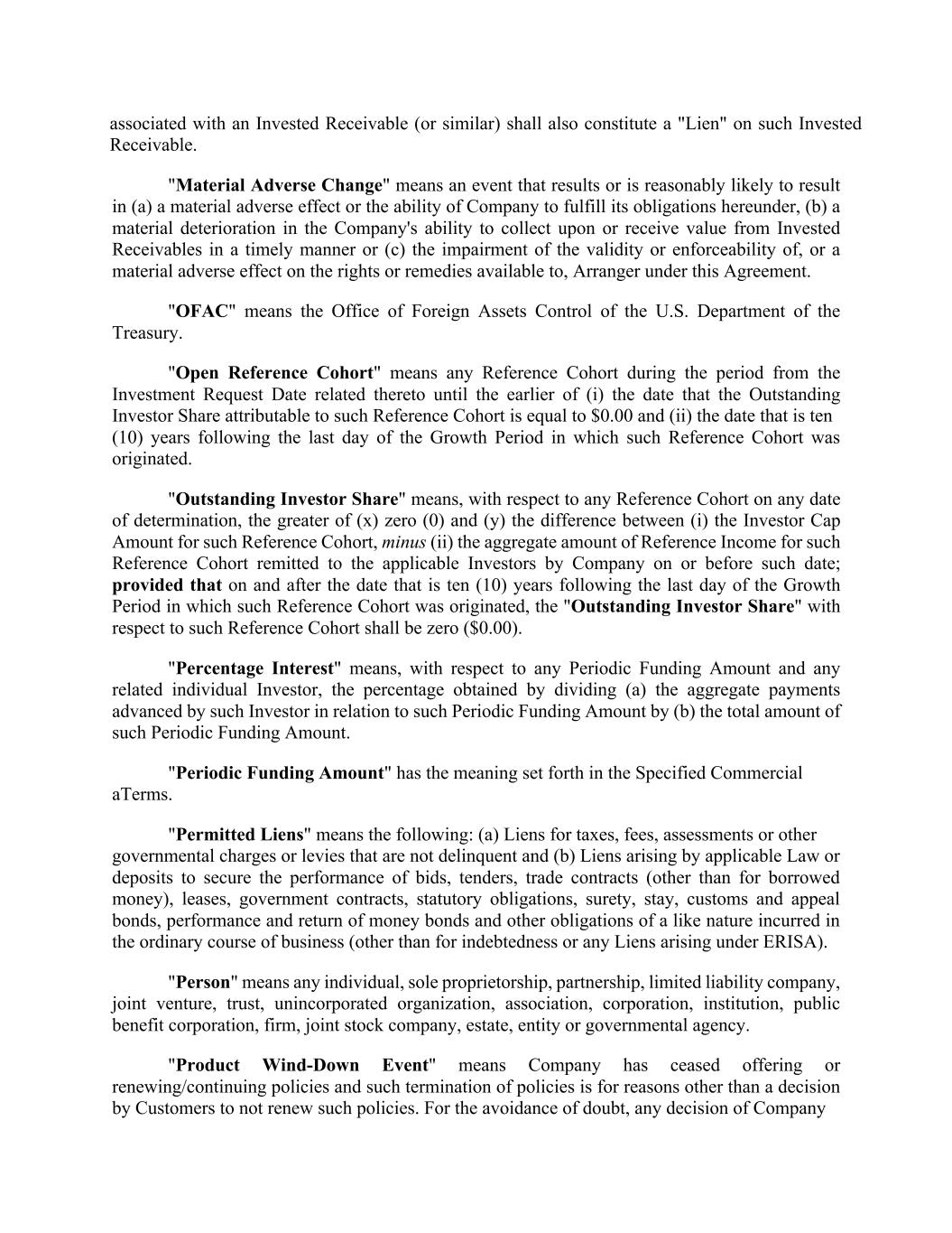 "Invested Receivable" means, collectively, an amount owed to Company by a Reference Cohort, payment processor or other source expected to generate Reference Income. "Investor Cap Amount" means, with respect to any Reference Cohort, the lesser of (a) the greater of (i) 0 and (ii) the amount which, taking into consideration (x) all prior Reference Income and any amounts remitted to Investors pursuant to Section 2.1(d), along with the actual dates of such remittances related to the applicable Reference Cohort, and (y) all prior Investment Amounts, including any amounts remitted to Company pursuant to Section 2.1(d), and the Investment Funding Dates of such remittances, would, as of any date of calculation, lead Investors to realize an Internal Rate of Return of 16% across all such cash remittances; and (b) the product of (i) [***]% and (ii) the Periodic Funding Amount; provided that, on and after the date that is 10 years following the last day of the Growth Period in which such Reference Cohort was originated, the "Investor Cap Amount" with respect to such Reference Cohort shall be zero. "Investor Funding Percentage" means, with respect to any Reference Cohort for a Growth Period, the quotient of (i) the applicable Periodic Funding Amount divided by (ii) the respective Expected Growth Spend; provided, however, that in the case of a Spend Reconciliation, the Investor Funding Percentage may be revised pursuant to a Funding Adjustment; provided further, that the Investor Funding Percentage shall not exceed the Investor Funding Percentage Cap, unless otherwise agreed to in the related Investment Request in Arranger's sole discretion. "Investor Funding Percentage Cap" means [***]; provided, however, that the Investor Funding Percentage Cap for any Reference Cohort originated during a Growth Period occurring after the first six (6) full Growth Periods following the Effective Date have elapsed shall be [***] if, as of the applicable Investment Funding Dates each of the following is satisfied: (i) the Funding Threshold Test has been met for all Tested Cohorts at all times since the Effective Date, (ii) no Cohort Threshold Breach has occurred at any time since the Effective Date and (ii) all of the conditions in Section 3.1 and 3.2 of this Agreement have been satisfied at all times since the Effective Date. "Investor Sharing Percentage" means, with respect to any Reference Cohort, a percentage equal to the Investor Funding Percentage; provided, however, that immediately in the event of a Cohort Threshold Breach with respect to such Reference Cohort, the Investor Sharing Percentage for such Reference Cohort shall be equal to 100%. "Periodic Funding Amount" means, with respect to any Reference Cohort, the Investment Amount, subject to any adjustment pursuant to Section 2.1(d), for the Growth Period in which such Reference Cohort was originated. "Reference Cohort" means, with respect to any Growth Period, the group of Customers each of which is identified as having its first nonzero transaction date in such Growth Period by reference to the "accounting_date" column in the dataset provided by Company to Arranger. "Reference Income" means, with respect to any Reference Cohort, an amount equal to the product of (i) (x) for payments associated with Customers underwritten by Company, including its Affiliates, the total such gross cash payments (including premium) collected by Company and its