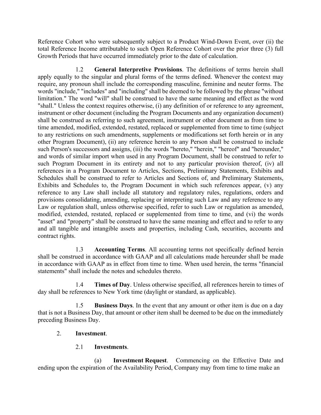 Reference Cohort who were subsequently subject to a Product Wind-Down Event, over (ii) the total Reference Income attributable to such Open Reference Cohort over the prior three (3) full Growth Periods that have occurred immediately prior to the date of calculation. 1.2 General Interpretive Provisions. The definitions of terms herein shall apply equally to the singular and plural forms of the terms defined. Whenever the context may require, any pronoun shall include the corresponding masculine, feminine and neuter forms. The words "include," "includes" and "including" shall be deemed to be followed by the phrase "without limitation." The word "will" shall be construed to have the same meaning and effect as the word "shall." Unless the context requires otherwise, (i) any definition of or reference to any agreement, instrument or other document (including the Program Documents and any organization document) shall be construed as referring to such agreement, instrument or other document as from time to time amended, modified, extended, restated, replaced or supplemented from time to time (subject to any restrictions on such amendments, supplements or modifications set forth herein or in any other Program Document), (ii) any reference herein to any Person shall be construed to include such Person's successors and assigns, (iii) the words "hereto," "herein," "hereof" and "hereunder," and words of similar import when used in any Program Document, shall be construed to refer to such Program Document in its entirety and not to any particular provision thereof, (iv) all references in a Program Document to Articles, Sections, Preliminary Statements, Exhibits and Schedules shall be construed to refer to Articles and Sections of, and Preliminary Statements, Exhibits and Schedules to, the Program Document in which such references appear, (v) any reference to any Law shall include all statutory and regulatory rules, regulations, orders and provisions consolidating, amending, replacing or interpreting such Law and any reference to any Law or regulation shall, unless otherwise specified, refer to such Law or regulation as amended, modified, extended, restated, replaced or supplemented from time to time, and (vi) the words "asset" and "property" shall be construed to have the same meaning and effect and to refer to any and all tangible and intangible assets and properties, including Cash, securities, accounts and contract rights. 1.3 Accounting Terms. All accounting terms not specifically defined herein shall be construed in accordance with GAAP and all calculations made hereunder shall be made in accordance with GAAP as in effect from time to time. When used herein, the terms "financial statements" shall include the notes and schedules thereto. 1.4 Times of Day. Unless otherwise specified, all references herein to times of day shall be references to New York time (daylight or standard, as applicable). 1.5 Business Days. In the event that any amount or other item is due on a day that is not a Business Day, that amount or other item shall be deemed to be due on the immediately preceding Business Day. 2. Investment. 2.1 Investments. (a) Investment Request. Commencing on the Effective Date and ending upon the expiration of the Availability Period, Company may from time to time make an