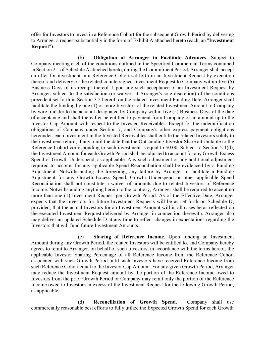 offer for Investors to invest in a Reference Cohort for the subsequent Growth Period by delivering to Arranger a request substantially in the form of Exhibit A attached hereto (each, an "Investment Request"). (b) Obligation of Arranger to Facilitate Advances. Subject to Company meeting each of the conditions outlined in the Specified Commercial Terms contained in Section 2.1 of Schedule A attached hereto, during the Commitment Period, Arranger shall accept an offer for investment in a Reference Cohort set forth in an Investment Request by execution thereof and delivery of the related countersigned Investment Request to Company within five (5) Business Days of its receipt thereof. Upon any such acceptance of an Investment Request by Arranger, subject to the satisfaction (or waiver, at Arranger's sole discretion) of the conditions precedent set forth in Section 3.2 hereof, on the related Investment Funding Date, Arranger shall facilitate the funding by one (1) or more Investors of the related Investment Amount to Company by wire transfer to the account designated by Company within five (5) Business Days of the date of acceptance and shall thereafter be entitled to payment from Company of an amount up to the Investor Cap Amount with respect to the Invested Receivables. Except for the indemnification obligations of Company under Section 7, and Company's other express payment obligations hereunder, each investment in the Invested Receivables shall entitle the related Investors solely to the investment return, if any, until the date that the Outstanding Investor Share attributable to the Reference Cohort corresponding to such investment is equal to $0.00. Subject to Section 2.1(d), the Investment Amount for each Growth Period shall be adjusted to account for any Growth Excess Spend or Growth Underspend, as applicable. Any such adjustment or any additional adjustment required to account for any applicable Spend Reconciliation shall be evidenced by a Funding Adjustment. Notwithstanding the foregoing, any failure by Arranger to facilitate a Funding Adjustment for any Growth Excess Spend, Growth Underspend or other applicable Spend Reconciliation shall not constitute a waiver of amounts due to related Investors of Reference Income. Notwithstanding anything herein to the contrary, Arranger shall be required to accept no more than one (1) Investment Request per Growth Period. As of the Effective Date, Arranger expects that the Investors for future Investment Requests will be as set forth on Schedule D; provided, that the actual Investors for an Investment Amount will in all cases be as reflected on the executed Investment Request delivered by Arranger in connection therewith. Arranger also may deliver an updated Schedule D at any time to reflect changes in expectations regarding the Investors that will fund future Investment Amounts. (c) Sharing of Reference Income. Upon funding an Investment Amount during any Growth Period, the related Investors will be entitled to, and Company hereby agrees to remit to Arranger, on behalf of such Investors, in accordance with the terms hereof, the applicable Investor Sharing Percentage of all Reference Income from the Reference Cohort associated with such Growth Period until such Investors have received Reference Income from such Reference Cohort equal to the Investor Cap Amount. For any given Growth Period, Arranger may reduce the Investment Request amount by the portion of the Reference Income owed to Investors from the prior Growth Period or Company may remit only the portion of the Reference Income owed to Investors in excess of the Investment Request for the following Growth Period, as applicable. (d) Reconciliation of Growth Spend. Company shall use commercially reasonable best efforts to fully utilize the Expected Growth Spend for each Growth