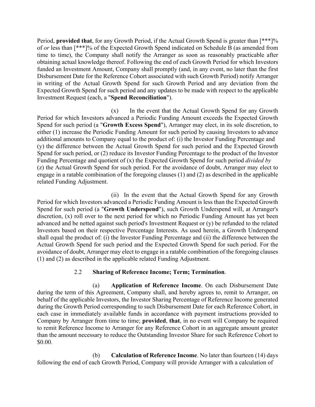 Period, provided that, for any Growth Period, if the Actual Growth Spend is greater than [***]% of or less than [***]% of the Expected Growth Spend indicated on Schedule B (as amended from time to time), the Company shall notify the Arranger as soon as reasonably practicable after obtaining actual knowledge thereof. Following the end of each Growth Period for which Investors funded an Investment Amount, Company shall promptly (and, in any event, no later than the first Disbursement Date for the Reference Cohort associated with such Growth Period) notify Arranger in writing of the Actual Growth Spend for such Growth Period and any deviation from the Expected Growth Spend for such period and any updates to be made with respect to the applicable Investment Request (each, a "Spend Reconciliation"). (x) In the event that the Actual Growth Spend for any Growth Period for which Investors advanced a Periodic Funding Amount exceeds the Expected Growth Spend for such period (a "Growth Excess Spend"), Arranger may elect, in its sole discretion, to either (1) increase the Periodic Funding Amount for such period by causing Investors to advance additional amounts to Company equal to the product of: (i) the Investor Funding Percentage and (y) the difference between the Actual Growth Spend for such period and the Expected Growth Spend for such period, or (2) reduce its Investor Funding Percentage to the product of the Investor Funding Percentage and quotient of (x) the Expected Growth Spend for such period divided by (z) the Actual Growth Spend for such period. For the avoidance of doubt, Arranger may elect to engage in a ratable combination of the foregoing clauses (1) and (2) as described in the applicable related Funding Adjustment. (ii) In the event that the Actual Growth Spend for any Growth Period for which Investors advanced a Periodic Funding Amount is less than the Expected Growth Spend for such period (a "Growth Underspend"), such Growth Underspend will, at Arranger's discretion, (x) roll over to the next period for which no Periodic Funding Amount has yet been advanced and be netted against such period's Investment Request or (y) be refunded to the related Investors based on their respective Percentage Interests. As used herein, a Growth Underspend shall equal the product of: (i) the Investor Funding Percentage and (ii) the difference between the Actual Growth Spend for such period and the Expected Growth Spend for such period. For the avoidance of doubt, Arranger may elect to engage in a ratable combination of the foregoing clauses (1) and (2) as described in the applicable related Funding Adjustment. 2.2 Sharing of Reference Income; Term; Termination. (a) Application of Reference Income. On each Disbursement Date during the term of this Agreement, Company shall, and hereby agrees to, remit to Arranger, on behalf of the applicable Investors, the Investor Sharing Percentage of Reference Income generated during the Growth Period corresponding to such Disbursement Date for each Reference Cohort, in each case in immediately available funds in accordance with payment instructions provided to Company by Arranger from time to time; provided, that, in no event will Company be required to remit Reference Income to Arranger for any Reference Cohort in an aggregate amount greater than the amount necessary to reduce the Outstanding Investor Share for such Reference Cohort to $0.00. (b) Calculation of Reference Income. No later than fourteen (14) days following the end of each Growth Period, Company will provide Arranger with a calculation of