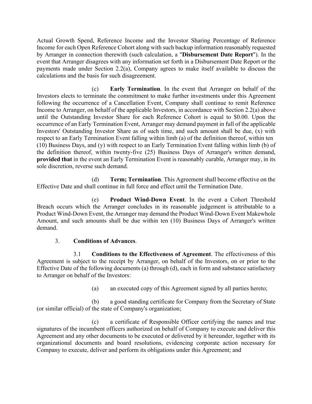 Actual Growth Spend, Reference Income and the Investor Sharing Percentage of Reference Income for each Open Reference Cohort along with such backup information reasonably requested by Arranger in connection therewith (such calculation, a "Disbursement Date Report"). In the event that Arranger disagrees with any information set forth in a Disbursement Date Report or the payments made under Section 2.2(a), Company agrees to make itself available to discuss the calculations and the basis for such disagreement. (c) Early Termination. In the event that Arranger on behalf of the Investors elects to terminate the commitment to make further investments under this Agreement following the occurrence of a Cancellation Event, Company shall continue to remit Reference Income to Arranger, on behalf of the applicable Investors, in accordance with Section 2.2(a) above until the Outstanding Investor Share for each Reference Cohort is equal to $0.00. Upon the occurrence of an Early Termination Event, Arranger may demand payment in full of the applicable Investors' Outstanding Investor Share as of such time, and such amount shall be due, (x) with respect to an Early Termination Event falling within limb (a) of the definition thereof, within ten (10) Business Days, and (y) with respect to an Early Termination Event falling within limb (b) of the definition thereof, within twenty-five (25) Business Days of Arranger's written demand, provided that in the event an Early Termination Event is reasonably curable, Arranger may, in its sole discretion, reverse such demand. (d) Term; Termination. This Agreement shall become effective on the Effective Date and shall continue in full force and effect until the Termination Date. (e) Product Wind-Down Event. In the event a Cohort Threshold Breach occurs which the Arranger concludes in its reasonable judgement is attributable to a Product Wind-Down Event, the Arranger may demand the Product Wind-Down Event Makewhole Amount, and such amounts shall be due within ten (10) Business Days of Arranger's written demand. 3. Conditions of Advances. 3.1 Conditions to the Effectiveness of Agreement. The effectiveness of this Agreement is subject to the receipt by Arranger, on behalf of the Investors, on or prior to the Effective Date of the following documents (a) through (d), each in form and substance satisfactory to Arranger on behalf of the Investors: (a) an executed copy of this Agreement signed by all parties hereto; (b) a good standing certificate for Company from the Secretary of State (or similar official) of the state of Company's organization; (c) a certificate of Responsible Officer certifying the names and true signatures of the incumbent officers authorized on behalf of Company to execute and deliver this Agreement and any other documents to be executed or delivered by it hereunder, together with its organizational documents and board resolutions, evidencing corporate action necessary for Company to execute, deliver and perform its obligations under this Agreement; and