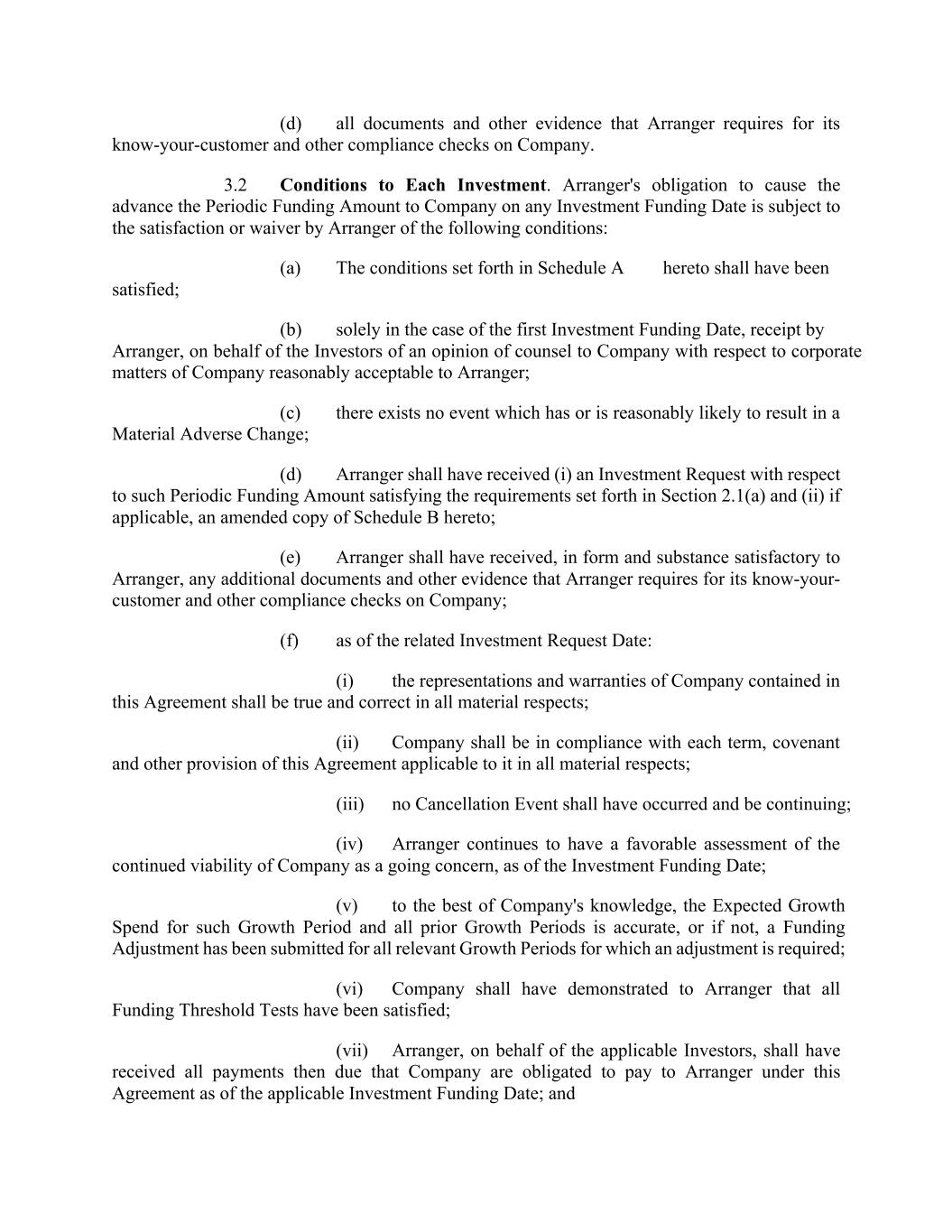 (d) all documents and other evidence that Arranger requires for its know-your-customer and other compliance checks on Company. 3.2 Conditions to Each Investment. Arranger's obligation to cause the advance the Periodic Funding Amount to Company on any Investment Funding Date is subject to the satisfaction or waiver by Arranger of the following conditions: (a) The conditions set forth in Schedule A hereto shall have been satisfied; (b) solely in the case of the first Investment Funding Date, receipt by Arranger, on behalf of the Investors of an opinion of counsel to Company with respect to corporate matters of Company reasonably acceptable to Arranger; (c) there exists no event which has or is reasonably likely to result in a Material Adverse Change; (d) Arranger shall have received (i) an Investment Request with respect to such Periodic Funding Amount satisfying the requirements set forth in Section 2.1(a) and (ii) if applicable, an amended copy of Schedule B hereto; (e) Arranger shall have received, in form and substance satisfactory to Arranger, any additional documents and other evidence that Arranger requires for its know-your- customer and other compliance checks on Company; (f) as of the related Investment Request Date: (i) the representations and warranties of Company contained in this Agreement shall be true and correct in all material respects; (ii) Company shall be in compliance with each term, covenant and other provision of this Agreement applicable to it in all material respects; (iii) no Cancellation Event shall have occurred and be continuing; (iv) Arranger continues to have a favorable assessment of the continued viability of Company as a going concern, as of the Investment Funding Date; (v) to the best of Company's knowledge, the Expected Growth Spend for such Growth Period and all prior Growth Periods is accurate, or if not, a Funding Adjustment has been submitted for all relevant Growth Periods for which an adjustment is required; (vi) Company shall have demonstrated to Arranger that all Funding Threshold Tests have been satisfied; (vii) Arranger, on behalf of the applicable Investors, shall have received all payments then due that Company are obligated to pay to Arranger under this Agreement as of the applicable Investment Funding Date; and