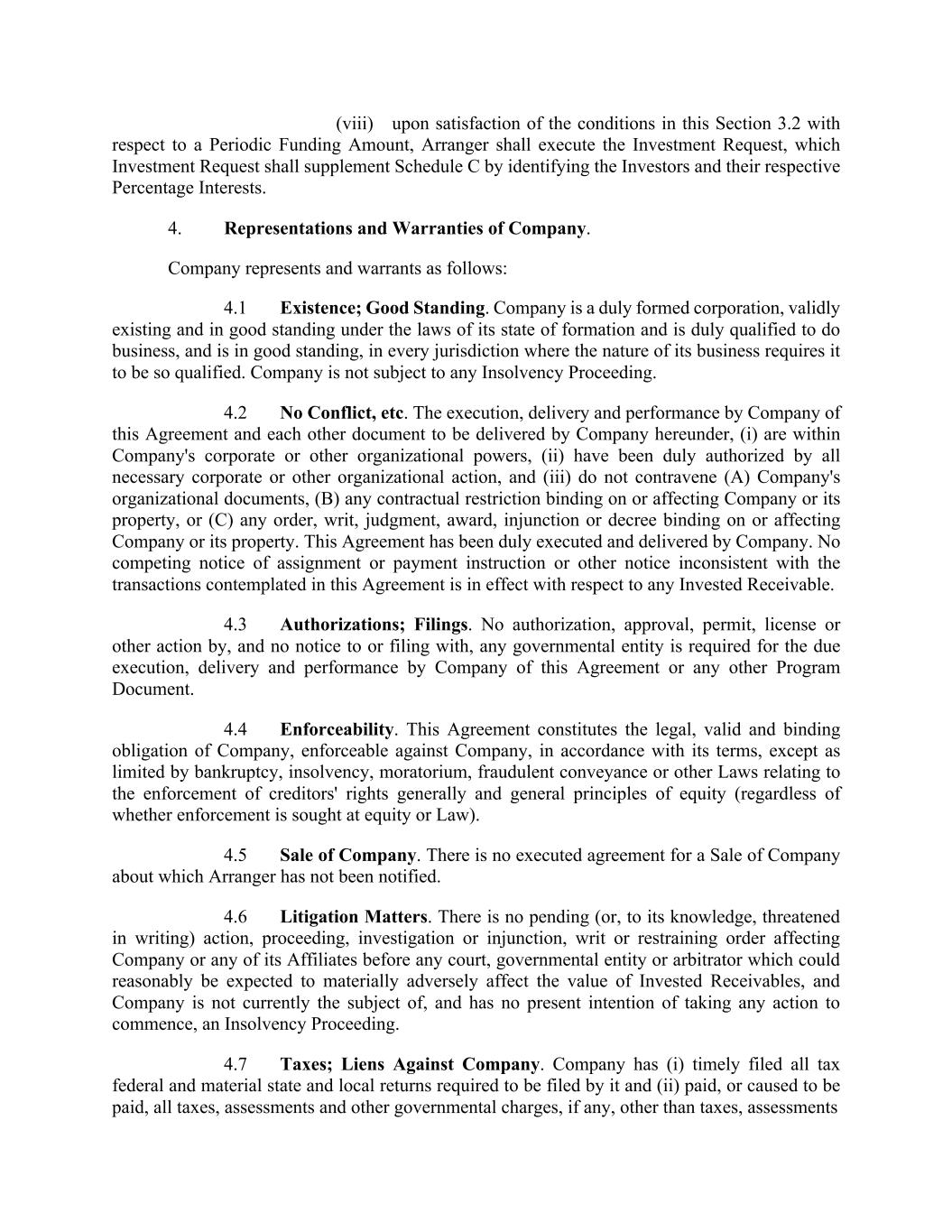 (viii) upon satisfaction of the conditions in this Section 3.2 with respect to a Periodic Funding Amount, Arranger shall execute the Investment Request, which Investment Request shall supplement Schedule C by identifying the Investors and their respective Percentage Interests. 4. Representations and Warranties of Company. Company represents and warrants as follows: 4.1 Existence; Good Standing. Company is a duly formed corporation, validly existing and in good standing under the laws of its state of formation and is duly qualified to do business, and is in good standing, in every jurisdiction where the nature of its business requires it to be so qualified. Company is not subject to any Insolvency Proceeding. 4.2 No Conflict, etc. The execution, delivery and performance by Company of this Agreement and each other document to be delivered by Company hereunder, (i) are within Company's corporate or other organizational powers, (ii) have been duly authorized by all necessary corporate or other organizational action, and (iii) do not contravene (A) Company's organizational documents, (B) any contractual restriction binding on or affecting Company or its property, or (C) any order, writ, judgment, award, injunction or decree binding on or affecting Company or its property. This Agreement has been duly executed and delivered by Company. No competing notice of assignment or payment instruction or other notice inconsistent with the transactions contemplated in this Agreement is in effect with respect to any Invested Receivable. 4.3 Authorizations; Filings. No authorization, approval, permit, license or other action by, and no notice to or filing with, any governmental entity is required for the due execution, delivery and performance by Company of this Agreement or any other Program Document. 4.4 Enforceability. This Agreement constitutes the legal, valid and binding obligation of Company, enforceable against Company, in accordance with its terms, except as limited by bankruptcy, insolvency, moratorium, fraudulent conveyance or other Laws relating to the enforcement of creditors' rights generally and general principles of equity (regardless of whether enforcement is sought at equity or Law). 4.5 Sale of Company. There is no executed agreement for a Sale of Company about which Arranger has not been notified. 4.6 Litigation Matters. There is no pending (or, to its knowledge, threatened in writing) action, proceeding, investigation or injunction, writ or restraining order affecting Company or any of its Affiliates before any court, governmental entity or arbitrator which could reasonably be expected to materially adversely affect the value of Invested Receivables, and Company is not currently the subject of, and has no present intention of taking any action to commence, an Insolvency Proceeding. 4.7 Taxes; Liens Against Company. Company has (i) timely filed all tax federal and material state and local returns required to be filed by it and (ii) paid, or caused to be paid, all taxes, assessments and other governmental charges, if any, other than taxes, assessments
