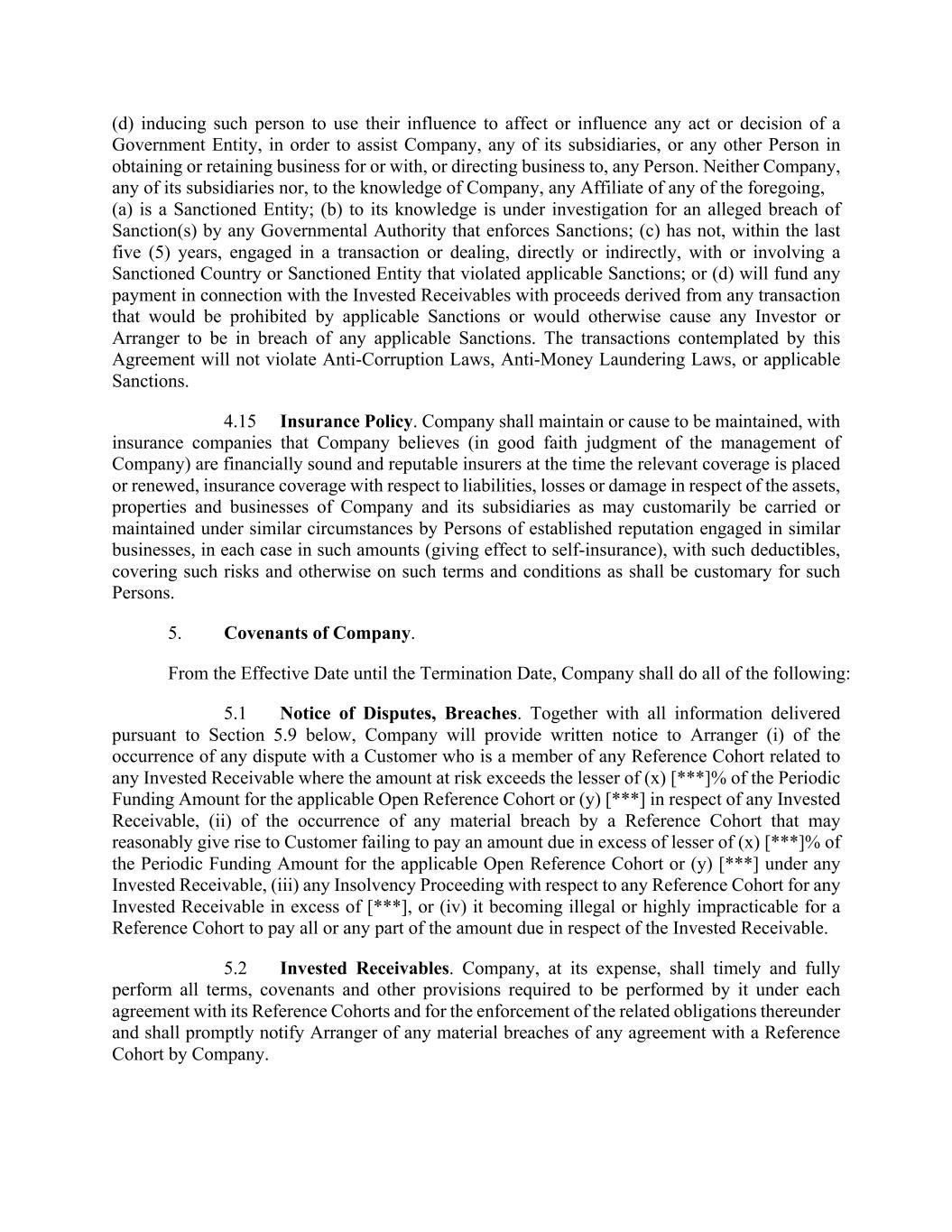 (d) inducing such person to use their influence to affect or influence any act or decision of a Government Entity, in order to assist Company, any of its subsidiaries, or any other Person in obtaining or retaining business for or with, or directing business to, any Person. Neither Company, any of its subsidiaries nor, to the knowledge of Company, any Affiliate of any of the foregoing, (a) is a Sanctioned Entity; (b) to its knowledge is under investigation for an alleged breach of Sanction(s) by any Governmental Authority that enforces Sanctions; (c) has not, within the last five (5) years, engaged in a transaction or dealing, directly or indirectly, with or involving a Sanctioned Country or Sanctioned Entity that violated applicable Sanctions; or (d) will fund any payment in connection with the Invested Receivables with proceeds derived from any transaction that would be prohibited by applicable Sanctions or would otherwise cause any Investor or Arranger to be in breach of any applicable Sanctions. The transactions contemplated by this Agreement will not violate Anti-Corruption Laws, Anti-Money Laundering Laws, or applicable Sanctions. 4.15 Insurance Policy. Company shall maintain or cause to be maintained, with insurance companies that Company believes (in good faith judgment of the management of Company) are financially sound and reputable insurers at the time the relevant coverage is placed or renewed, insurance coverage with respect to liabilities, losses or damage in respect of the assets, properties and businesses of Company and its subsidiaries as may customarily be carried or maintained under similar circumstances by Persons of established reputation engaged in similar businesses, in each case in such amounts (giving effect to self-insurance), with such deductibles, covering such risks and otherwise on such terms and conditions as shall be customary for such Persons. 5. Covenants of Company. From the Effective Date until the Termination Date, Company shall do all of the following: 5.1 Notice of Disputes, Breaches. Together with all information delivered pursuant to Section 5.9 below, Company will provide written notice to Arranger (i) of the occurrence of any dispute with a Customer who is a member of any Reference Cohort related to any Invested Receivable where the amount at risk exceeds the lesser of (x) [***]% of the Periodic Funding Amount for the applicable Open Reference Cohort or (y) [***] in respect of any Invested Receivable, (ii) of the occurrence of any material breach by a Reference Cohort that may reasonably give rise to Customer failing to pay an amount due in excess of lesser of (x) [***]% of the Periodic Funding Amount for the applicable Open Reference Cohort or (y) [***] under any Invested Receivable, (iii) any Insolvency Proceeding with respect to any Reference Cohort for any Invested Receivable in excess of [***], or (iv) it becoming illegal or highly impracticable for a Reference Cohort to pay all or any part of the amount due in respect of the Invested Receivable. 5.2 Invested Receivables. Company, at its expense, shall timely and fully perform all terms, covenants and other provisions required to be performed by it under each agreement with its Reference Cohorts and for the enforcement of the related obligations thereunder and shall promptly notify Arranger of any material breaches of any agreement with a Reference Cohort by Company.