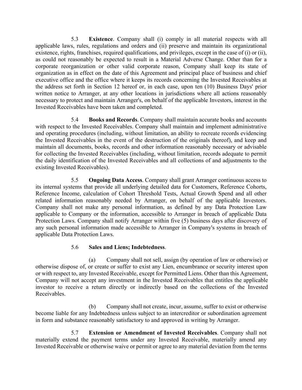 5.3 Existence. Company shall (i) comply in all material respects with all applicable laws, rules, regulations and orders and (ii) preserve and maintain its organizational existence, rights, franchises, required qualifications, and privileges, except in the case of (i) or (ii), as could not reasonably be expected to result in a Material Adverse Change. Other than for a corporate reorganization or other valid corporate reason, Company shall keep its state of organization as in effect on the date of this Agreement and principal place of business and chief executive office and the office where it keeps its records concerning the Invested Receivables at the address set forth in Section 12 hereof or, in each case, upon ten (10) Business Days' prior written notice to Arranger, at any other locations in jurisdictions where all actions reasonably necessary to protect and maintain Arranger's, on behalf of the applicable Investors, interest in the Invested Receivables have been taken and completed. 5.4 Books and Records. Company shall maintain accurate books and accounts with respect to the Invested Receivables. Company shall maintain and implement administrative and operating procedures (including, without limitation, an ability to recreate records evidencing the Invested Receivables in the event of the destruction of the originals thereof), and keep and maintain all documents, books, records and other information reasonably necessary or advisable for collecting the Invested Receivables (including, without limitation, records adequate to permit the daily identification of the Invested Receivables and all collections of and adjustments to the existing Invested Receivables). 5.5 Ongoing Data Access. Company shall grant Arranger continuous access to its internal systems that provide all underlying detailed data for Customers, Reference Cohorts, Reference Income, calculation of Cohort Threshold Tests, Actual Growth Spend and all other related information reasonably needed by Arranger, on behalf of the applicable Investors. Company shall not make any personal information, as defined by any Data Protection Law applicable to Company or the information, accessible to Arranger in breach of applicable Data Protection Laws. Company shall notify Arranger within five (5) business days after discovery of any such personal information made accessible to Arranger in Company's systems in breach of applicable Data Protection Laws. 5.6 Sales and Liens; Indebtedness. (a) Company shall not sell, assign (by operation of law or otherwise) or otherwise dispose of, or create or suffer to exist any Lien, encumbrance or security interest upon or with respect to, any Invested Receivable, except for Permitted Liens. Other than this Agreement, Company will not accept any investment in the Invested Receivables that entitles the applicable investor to receive a return directly or indirectly based on the collections of the Invested Receivables. (b) Company shall not create, incur, assume, suffer to exist or otherwise become liable for any Indebtedness unless subject to an intercreditor or subordination agreement in form and substance reasonably satisfactory to and approved in writing by Arranger. 5.7 Extension or Amendment of Invested Receivables. Company shall not materially extend the payment terms under any Invested Receivable, materially amend any Invested Receivable or otherwise waive or permit or agree to any material deviation from the terms