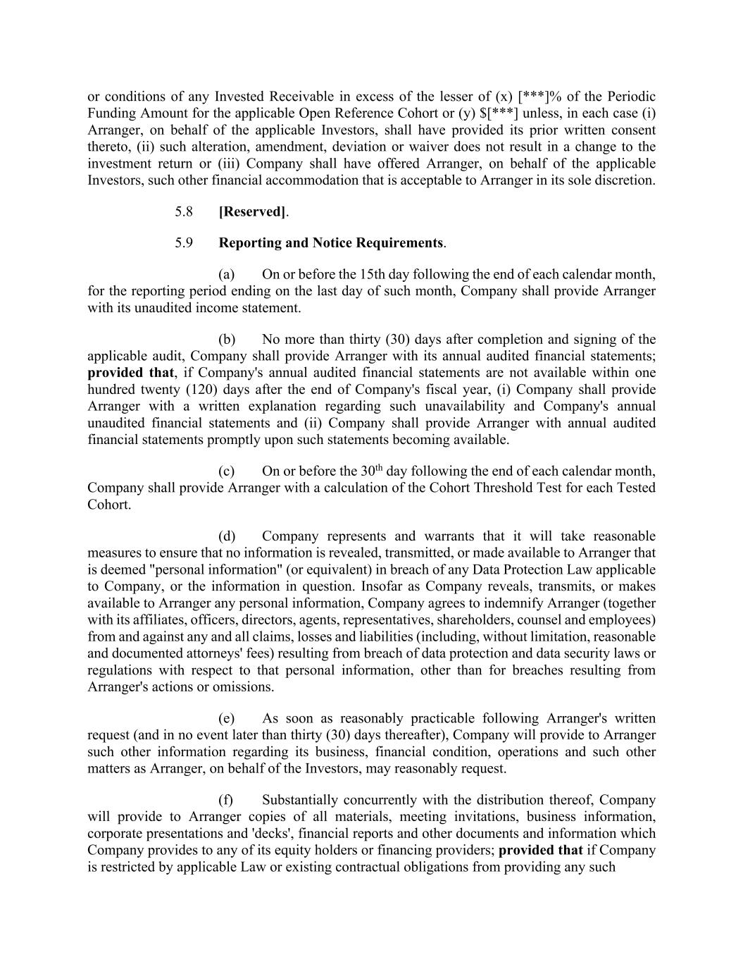 or conditions of any Invested Receivable in excess of the lesser of (x) [***]% of the Periodic Funding Amount for the applicable Open Reference Cohort or (y) $[***] unless, in each case (i) Arranger, on behalf of the applicable Investors, shall have provided its prior written consent thereto, (ii) such alteration, amendment, deviation or waiver does not result in a change to the investment return or (iii) Company shall have offered Arranger, on behalf of the applicable Investors, such other financial accommodation that is acceptable to Arranger in its sole discretion. 5.8 [Reserved]. 5.9 Reporting and Notice Requirements. (a) On or before the 15th day following the end of each calendar month, for the reporting period ending on the last day of such month, Company shall provide Arranger with its unaudited income statement. (b) No more than thirty (30) days after completion and signing of the applicable audit, Company shall provide Arranger with its annual audited financial statements; provided that, if Company's annual audited financial statements are not available within one hundred twenty (120) days after the end of Company's fiscal year, (i) Company shall provide Arranger with a written explanation regarding such unavailability and Company's annual unaudited financial statements and (ii) Company shall provide Arranger with annual audited financial statements promptly upon such statements becoming available. (c) On or before the 30th day following the end of each calendar month, Company shall provide Arranger with a calculation of the Cohort Threshold Test for each Tested Cohort. (d) Company represents and warrants that it will take reasonable measures to ensure that no information is revealed, transmitted, or made available to Arranger that is deemed "personal information" (or equivalent) in breach of any Data Protection Law applicable to Company, or the information in question. Insofar as Company reveals, transmits, or makes available to Arranger any personal information, Company agrees to indemnify Arranger (together with its affiliates, officers, directors, agents, representatives, shareholders, counsel and employees) from and against any and all claims, losses and liabilities (including, without limitation, reasonable and documented attorneys' fees) resulting from breach of data protection and data security laws or regulations with respect to that personal information, other than for breaches resulting from Arranger's actions or omissions. (e) As soon as reasonably practicable following Arranger's written request (and in no event later than thirty (30) days thereafter), Company will provide to Arranger such other information regarding its business, financial condition, operations and such other matters as Arranger, on behalf of the Investors, may reasonably request. (f) Substantially concurrently with the distribution thereof, Company will provide to Arranger copies of all materials, meeting invitations, business information, corporate presentations and 'decks', financial reports and other documents and information which Company provides to any of its equity holders or financing providers; provided that if Company is restricted by applicable Law or existing contractual obligations from providing any such