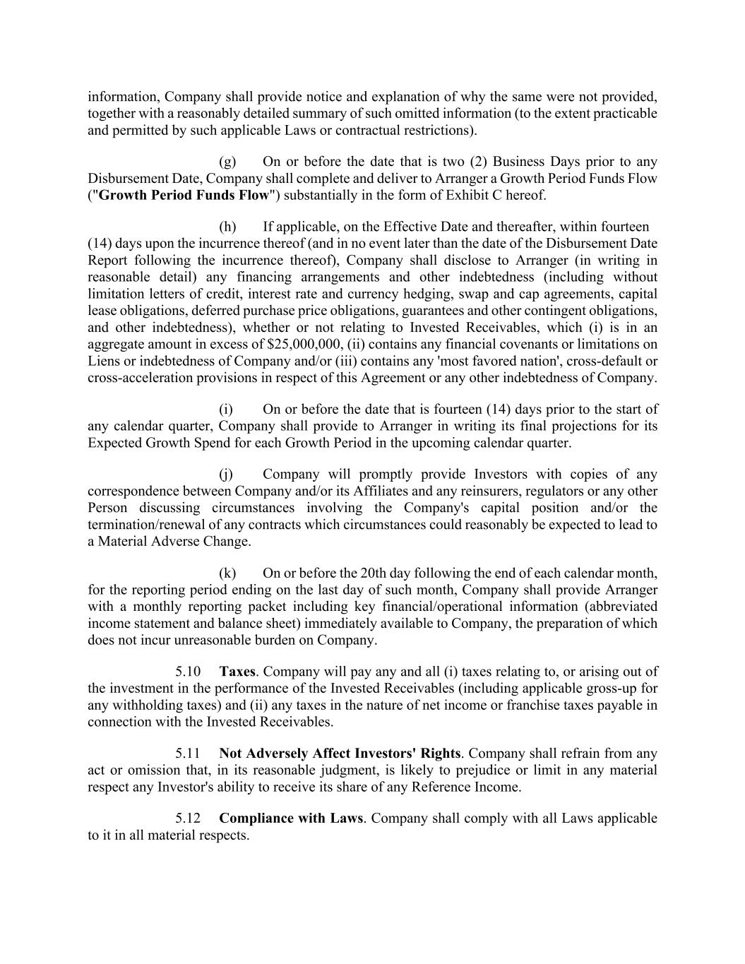 information, Company shall provide notice and explanation of why the same were not provided, together with a reasonably detailed summary of such omitted information (to the extent practicable and permitted by such applicable Laws or contractual restrictions). (g) On or before the date that is two (2) Business Days prior to any Disbursement Date, Company shall complete and deliver to Arranger a Growth Period Funds Flow ("Growth Period Funds Flow") substantially in the form of Exhibit C hereof. (h) If applicable, on the Effective Date and thereafter, within fourteen (14) days upon the incurrence thereof (and in no event later than the date of the Disbursement Date Report following the incurrence thereof), Company shall disclose to Arranger (in writing in reasonable detail) any financing arrangements and other indebtedness (including without limitation letters of credit, interest rate and currency hedging, swap and cap agreements, capital lease obligations, deferred purchase price obligations, guarantees and other contingent obligations, and other indebtedness), whether or not relating to Invested Receivables, which (i) is in an aggregate amount in excess of $25,000,000, (ii) contains any financial covenants or limitations on Liens or indebtedness of Company and/or (iii) contains any 'most favored nation', cross-default or cross-acceleration provisions in respect of this Agreement or any other indebtedness of Company. (i) On or before the date that is fourteen (14) days prior to the start of any calendar quarter, Company shall provide to Arranger in writing its final projections for its Expected Growth Spend for each Growth Period in the upcoming calendar quarter. (j) Company will promptly provide Investors with copies of any correspondence between Company and/or its Affiliates and any reinsurers, regulators or any other Person discussing circumstances involving the Company's capital position and/or the termination/renewal of any contracts which circumstances could reasonably be expected to lead to a Material Adverse Change. (k) On or before the 20th day following the end of each calendar month, for the reporting period ending on the last day of such month, Company shall provide Arranger with a monthly reporting packet including key financial/operational information (abbreviated income statement and balance sheet) immediately available to Company, the preparation of which does not incur unreasonable burden on Company. 5.10 Taxes. Company will pay any and all (i) taxes relating to, or arising out of the investment in the performance of the Invested Receivables (including applicable gross-up for any withholding taxes) and (ii) any taxes in the nature of net income or franchise taxes payable in connection with the Invested Receivables. 5.11 Not Adversely Affect Investors' Rights. Company shall refrain from any act or omission that, in its reasonable judgment, is likely to prejudice or limit in any material respect any Investor's ability to receive its share of any Reference Income. 5.12 Compliance with Laws. Company shall comply with all Laws applicable to it in all material respects.