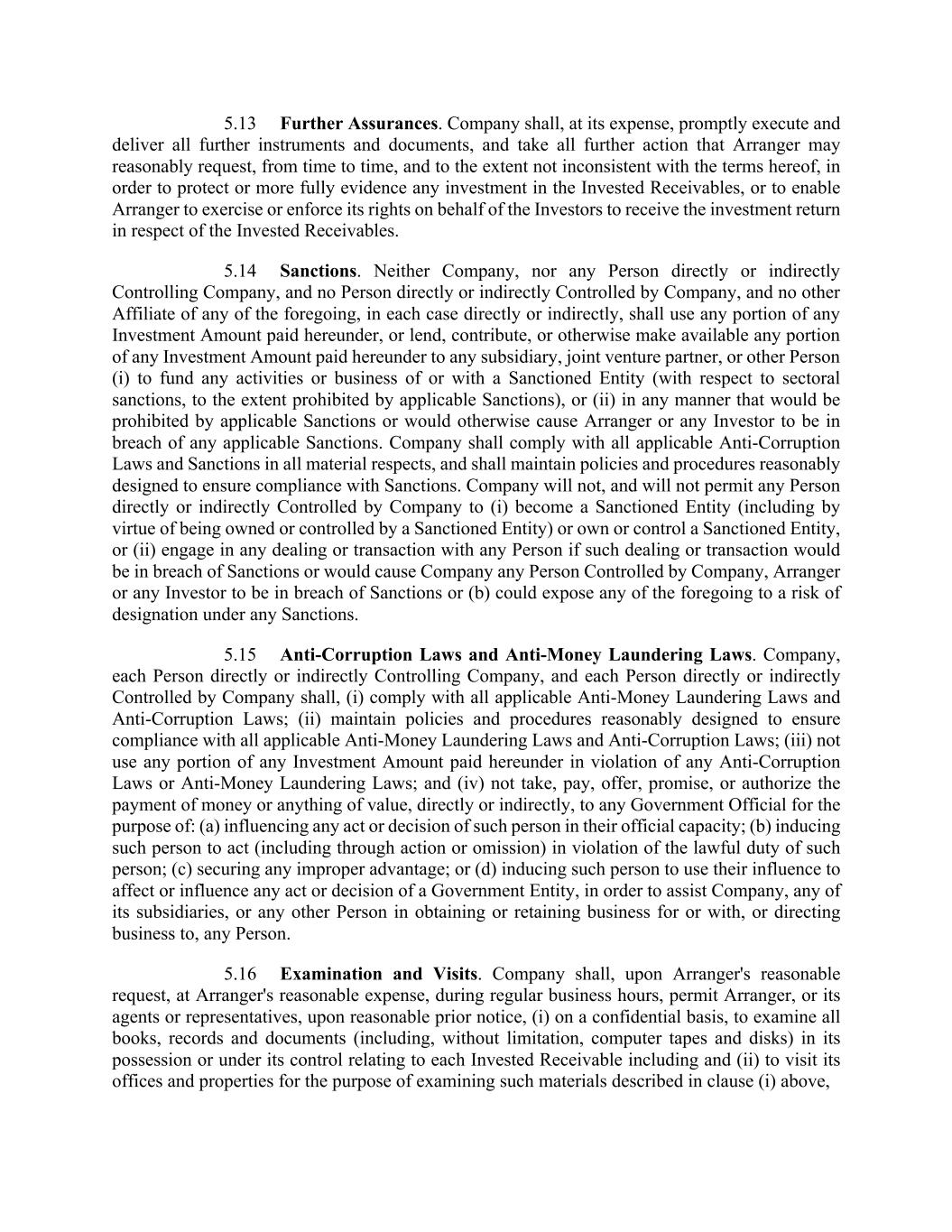 5.13 Further Assurances. Company shall, at its expense, promptly execute and deliver all further instruments and documents, and take all further action that Arranger may reasonably request, from time to time, and to the extent not inconsistent with the terms hereof, in order to protect or more fully evidence any investment in the Invested Receivables, or to enable Arranger to exercise or enforce its rights on behalf of the Investors to receive the investment return in respect of the Invested Receivables. 5.14 Sanctions. Neither Company, nor any Person directly or indirectly Controlling Company, and no Person directly or indirectly Controlled by Company, and no other Affiliate of any of the foregoing, in each case directly or indirectly, shall use any portion of any Investment Amount paid hereunder, or lend, contribute, or otherwise make available any portion of any Investment Amount paid hereunder to any subsidiary, joint venture partner, or other Person (i) to fund any activities or business of or with a Sanctioned Entity (with respect to sectoral sanctions, to the extent prohibited by applicable Sanctions), or (ii) in any manner that would be prohibited by applicable Sanctions or would otherwise cause Arranger or any Investor to be in breach of any applicable Sanctions. Company shall comply with all applicable Anti-Corruption Laws and Sanctions in all material respects, and shall maintain policies and procedures reasonably designed to ensure compliance with Sanctions. Company will not, and will not permit any Person directly or indirectly Controlled by Company to (i) become a Sanctioned Entity (including by virtue of being owned or controlled by a Sanctioned Entity) or own or control a Sanctioned Entity, or (ii) engage in any dealing or transaction with any Person if such dealing or transaction would be in breach of Sanctions or would cause Company any Person Controlled by Company, Arranger or any Investor to be in breach of Sanctions or (b) could expose any of the foregoing to a risk of designation under any Sanctions. 5.15 Anti-Corruption Laws and Anti-Money Laundering Laws. Company, each Person directly or indirectly Controlling Company, and each Person directly or indirectly Controlled by Company shall, (i) comply with all applicable Anti-Money Laundering Laws and Anti-Corruption Laws; (ii) maintain policies and procedures reasonably designed to ensure compliance with all applicable Anti-Money Laundering Laws and Anti-Corruption Laws; (iii) not use any portion of any Investment Amount paid hereunder in violation of any Anti-Corruption Laws or Anti-Money Laundering Laws; and (iv) not take, pay, offer, promise, or authorize the payment of money or anything of value, directly or indirectly, to any Government Official for the purpose of: (a) influencing any act or decision of such person in their official capacity; (b) inducing such person to act (including through action or omission) in violation of the lawful duty of such person; (c) securing any improper advantage; or (d) inducing such person to use their influence to affect or influence any act or decision of a Government Entity, in order to assist Company, any of its subsidiaries, or any other Person in obtaining or retaining business for or with, or directing business to, any Person. 5.16 Examination and Visits. Company shall, upon Arranger's reasonable request, at Arranger's reasonable expense, during regular business hours, permit Arranger, or its agents or representatives, upon reasonable prior notice, (i) on a confidential basis, to examine all books, records and documents (including, without limitation, computer tapes and disks) in its possession or under its control relating to each Invested Receivable including and (ii) to visit its offices and properties for the purpose of examining such materials described in clause (i) above,