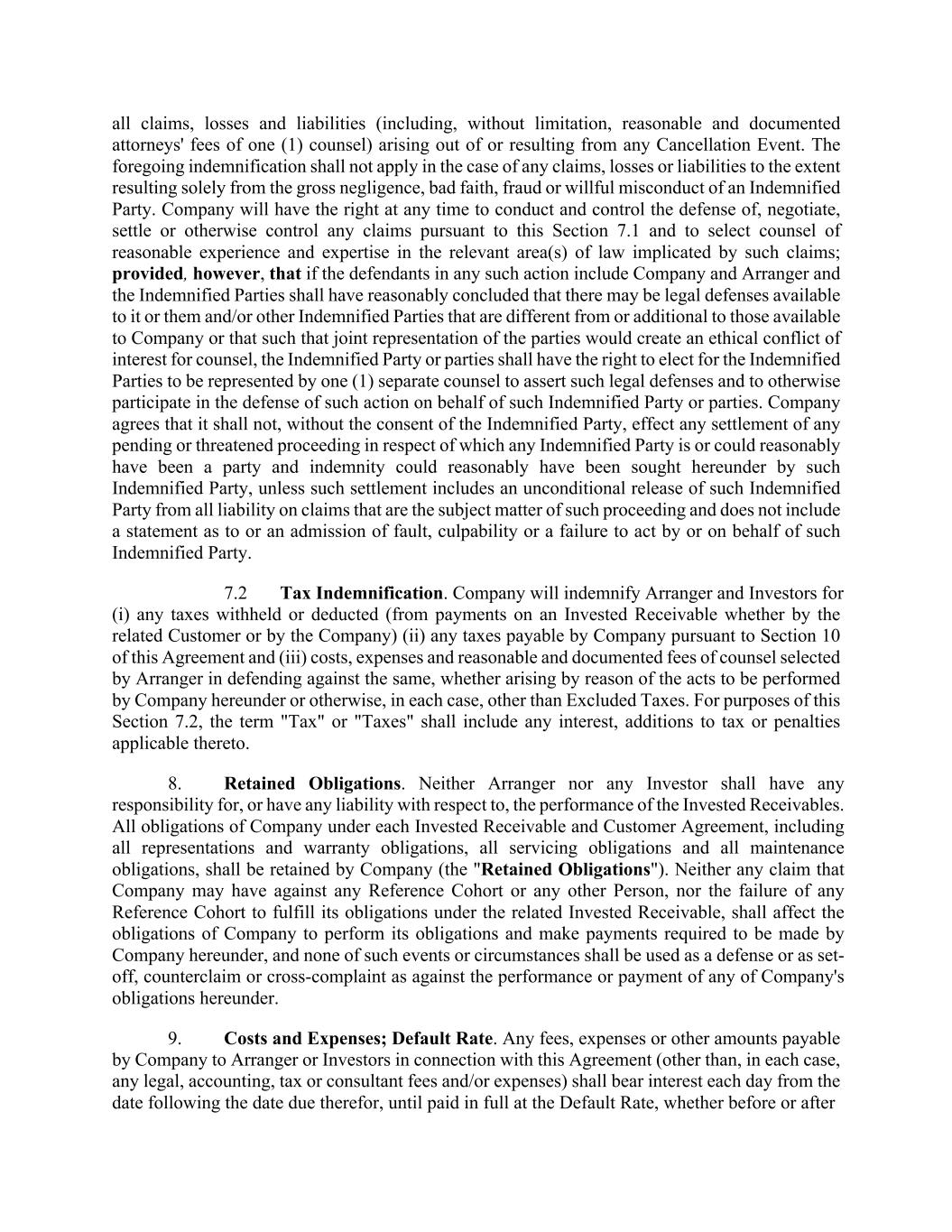 all claims, losses and liabilities (including, without limitation, reasonable and documented attorneys' fees of one (1) counsel) arising out of or resulting from any Cancellation Event. The foregoing indemnification shall not apply in the case of any claims, losses or liabilities to the extent resulting solely from the gross negligence, bad faith, fraud or willful misconduct of an Indemnified Party. Company will have the right at any time to conduct and control the defense of, negotiate, settle or otherwise control any claims pursuant to this Section 7.1 and to select counsel of reasonable experience and expertise in the relevant area(s) of law implicated by such claims; provided, however, that if the defendants in any such action include Company and Arranger and the Indemnified Parties shall have reasonably concluded that there may be legal defenses available to it or them and/or other Indemnified Parties that are different from or additional to those available to Company or that such that joint representation of the parties would create an ethical conflict of interest for counsel, the Indemnified Party or parties shall have the right to elect for the Indemnified Parties to be represented by one (1) separate counsel to assert such legal defenses and to otherwise participate in the defense of such action on behalf of such Indemnified Party or parties. Company agrees that it shall not, without the consent of the Indemnified Party, effect any settlement of any pending or threatened proceeding in respect of which any Indemnified Party is or could reasonably have been a party and indemnity could reasonably have been sought hereunder by such Indemnified Party, unless such settlement includes an unconditional release of such Indemnified Party from all liability on claims that are the subject matter of such proceeding and does not include a statement as to or an admission of fault, culpability or a failure to act by or on behalf of such Indemnified Party. 7.2 Tax Indemnification. Company will indemnify Arranger and Investors for (i) any taxes withheld or deducted (from payments on an Invested Receivable whether by the related Customer or by the Company) (ii) any taxes payable by Company pursuant to Section 10 of this Agreement and (iii) costs, expenses and reasonable and documented fees of counsel selected by Arranger in defending against the same, whether arising by reason of the acts to be performed by Company hereunder or otherwise, in each case, other than Excluded Taxes. For purposes of this Section 7.2, the term "Tax" or "Taxes" shall include any interest, additions to tax or penalties applicable thereto. 8. Retained Obligations. Neither Arranger nor any Investor shall have any responsibility for, or have any liability with respect to, the performance of the Invested Receivables. All obligations of Company under each Invested Receivable and Customer Agreement, including all representations and warranty obligations, all servicing obligations and all maintenance obligations, shall be retained by Company (the "Retained Obligations"). Neither any claim that Company may have against any Reference Cohort or any other Person, nor the failure of any Reference Cohort to fulfill its obligations under the related Invested Receivable, shall affect the obligations of Company to perform its obligations and make payments required to be made by Company hereunder, and none of such events or circumstances shall be used as a defense or as set- off, counterclaim or cross-complaint as against the performance or payment of any of Company's obligations hereunder. 9. Costs and Expenses; Default Rate. Any fees, expenses or other amounts payable by Company to Arranger or Investors in connection with this Agreement (other than, in each case, any legal, accounting, tax or consultant fees and/or expenses) shall bear interest each day from the date following the date due therefor, until paid in full at the Default Rate, whether before or after