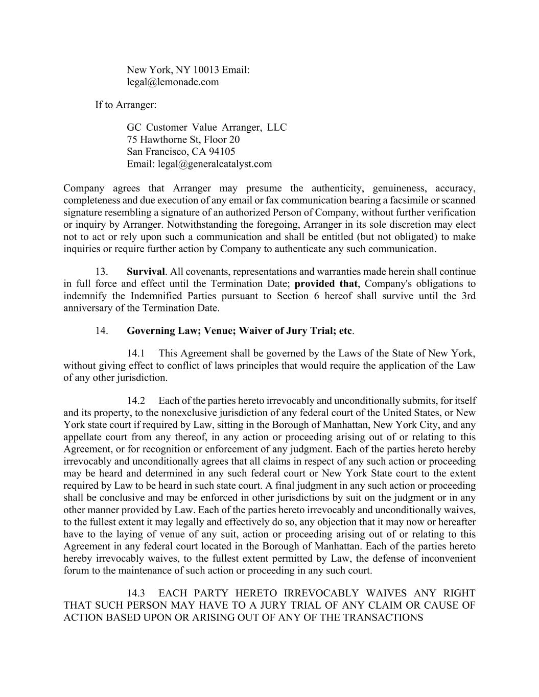 New York, NY 10013 Email: legal@lemonade.com If to Arranger: GC Customer Value Arranger, LLC 75 Hawthorne St, Floor 20 San Francisco, CA 94105 Email: legal@generalcatalyst.com Company agrees that Arranger may presume the authenticity, genuineness, accuracy, completeness and due execution of any email or fax communication bearing a facsimile or scanned signature resembling a signature of an authorized Person of Company, without further verification or inquiry by Arranger. Notwithstanding the foregoing, Arranger in its sole discretion may elect not to act or rely upon such a communication and shall be entitled (but not obligated) to make inquiries or require further action by Company to authenticate any such communication. 13. Survival. All covenants, representations and warranties made herein shall continue in full force and effect until the Termination Date; provided that, Company's obligations to indemnify the Indemnified Parties pursuant to Section 6 hereof shall survive until the 3rd anniversary of the Termination Date. 14. Governing Law; Venue; Waiver of Jury Trial; etc. 14.1 This Agreement shall be governed by the Laws of the State of New York, without giving effect to conflict of laws principles that would require the application of the Law of any other jurisdiction. 14.2 Each of the parties hereto irrevocably and unconditionally submits, for itself and its property, to the nonexclusive jurisdiction of any federal court of the United States, or New York state court if required by Law, sitting in the Borough of Manhattan, New York City, and any appellate court from any thereof, in any action or proceeding arising out of or relating to this Agreement, or for recognition or enforcement of any judgment. Each of the parties hereto hereby irrevocably and unconditionally agrees that all claims in respect of any such action or proceeding may be heard and determined in any such federal court or New York State court to the extent required by Law to be heard in such state court. A final judgment in any such action or proceeding shall be conclusive and may be enforced in other jurisdictions by suit on the judgment or in any other manner provided by Law. Each of the parties hereto irrevocably and unconditionally waives, to the fullest extent it may legally and effectively do so, any objection that it may now or hereafter have to the laying of venue of any suit, action or proceeding arising out of or relating to this Agreement in any federal court located in the Borough of Manhattan. Each of the parties hereto hereby irrevocably waives, to the fullest extent permitted by Law, the defense of inconvenient forum to the maintenance of such action or proceeding in any such court. 14.3 EACH PARTY HERETO IRREVOCABLY WAIVES ANY RIGHT THAT SUCH PERSON MAY HAVE TO A JURY TRIAL OF ANY CLAIM OR CAUSE OF ACTION BASED UPON OR ARISING OUT OF ANY OF THE TRANSACTIONS