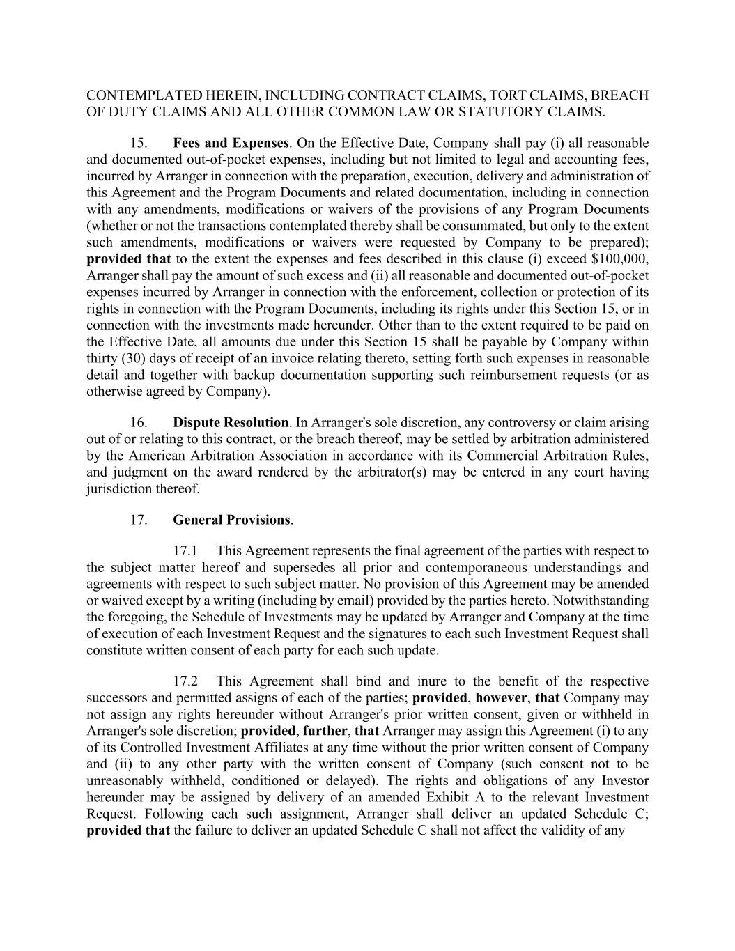 CONTEMPLATED HEREIN, INCLUDING CONTRACT CLAIMS, TORT CLAIMS, BREACH OF DUTY CLAIMS AND ALL OTHER COMMON LAW OR STATUTORY CLAIMS. 15. Fees and Expenses. On the Effective Date, Company shall pay (i) all reasonable and documented out-of-pocket expenses, including but not limited to legal and accounting fees, incurred by Arranger in connection with the preparation, execution, delivery and administration of this Agreement and the Program Documents and related documentation, including in connection with any amendments, modifications or waivers of the provisions of any Program Documents (whether or not the transactions contemplated thereby shall be consummated, but only to the extent such amendments, modifications or waivers were requested by Company to be prepared); provided that to the extent the expenses and fees described in this clause (i) exceed $100,000, Arranger shall pay the amount of such excess and (ii) all reasonable and documented out-of-pocket expenses incurred by Arranger in connection with the enforcement, collection or protection of its rights in connection with the Program Documents, including its rights under this Section 15, or in connection with the investments made hereunder. Other than to the extent required to be paid on the Effective Date, all amounts due under this Section 15 shall be payable by Company within thirty (30) days of receipt of an invoice relating thereto, setting forth such expenses in reasonable detail and together with backup documentation supporting such reimbursement requests (or as otherwise agreed by Company). 16. Dispute Resolution. In Arranger's sole discretion, any controversy or claim arising out of or relating to this contract, or the breach thereof, may be settled by arbitration administered by the American Arbitration Association in accordance with its Commercial Arbitration Rules, and judgment on the award rendered by the arbitrator(s) may be entered in any court having jurisdiction thereof. 17. General Provisions. 17.1 This Agreement represents the final agreement of the parties with respect to the subject matter hereof and supersedes all prior and contemporaneous understandings and agreements with respect to such subject matter. No provision of this Agreement may be amended or waived except by a writing (including by email) provided by the parties hereto. Notwithstanding the foregoing, the Schedule of Investments may be updated by Arranger and Company at the time of execution of each Investment Request and the signatures to each such Investment Request shall constitute written consent of each party for each such update. 17.2 This Agreement shall bind and inure to the benefit of the respective successors and permitted assigns of each of the parties; provided, however, that Company may not assign any rights hereunder without Arranger's prior written consent, given or withheld in Arranger's sole discretion; provided, further, that Arranger may assign this Agreement (i) to any of its Controlled Investment Affiliates at any time without the prior written consent of Company and (ii) to any other party with the written consent of Company (such consent not to be unreasonably withheld, conditioned or delayed). The rights and obligations of any Investor hereunder may be assigned by delivery of an amended Exhibit A to the relevant Investment Request. Following each such assignment, Arranger shall deliver an updated Schedule C; provided that the failure to deliver an updated Schedule C shall not affect the validity of any