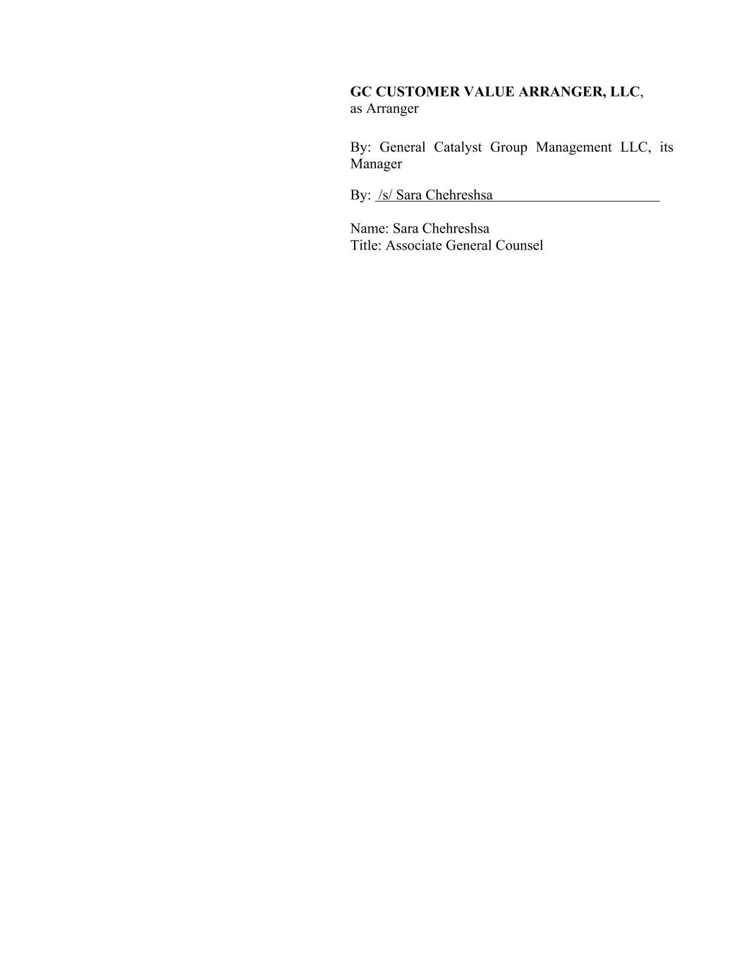 GC CUSTOMER VALUE ARRANGER, LLC, as Arranger By: General Catalyst Group Management LLC, its Manager By: /s/ Sara Chehreshsa Name: Sara Chehreshsa Title: Associate General Counsel