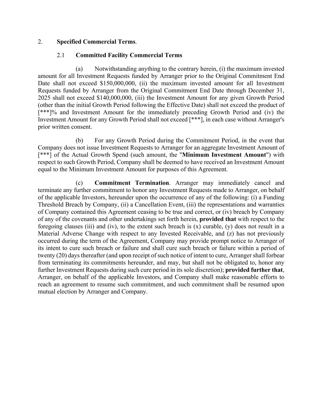 2. Specified Commercial Terms. 2.1 Committed Facility Commercial Terms (a) Notwithstanding anything to the contrary herein, (i) the maximum invested amount for all Investment Requests funded by Arranger prior to the Original Commitment End Date shall not exceed $150,000,000, (ii) the maximum invested amount for all Investment Requests funded by Arranger from the Original Commitment End Date through December 31, 2025 shall not exceed $140,000,000, (iii) the Investment Amount for any given Growth Period (other than the initial Growth Period following the Effective Date) shall not exceed the product of [***]% and Investment Amount for the immediately preceding Growth Period and (iv) the Investment Amount for any Growth Period shall not exceed [***], in each case without Arranger's prior written consent. (b) For any Growth Period during the Commitment Period, in the event that Company does not issue Investment Requests to Arranger for an aggregate Investment Amount of [***] of the Actual Growth Spend (such amount, the "Minimum Investment Amount") with respect to such Growth Period, Company shall be deemed to have received an Investment Amount equal to the Minimum Investment Amount for purposes of this Agreement. (c) Commitment Termination. Arranger may immediately cancel and terminate any further commitment to honor any Investment Requests made to Arranger, on behalf of the applicable Investors, hereunder upon the occurrence of any of the following: (i) a Funding Threshold Breach by Company, (ii) a Cancellation Event, (iii) the representations and warranties of Company contained this Agreement ceasing to be true and correct, or (iv) breach by Company of any of the covenants and other undertakings set forth herein, provided that with respect to the foregoing clauses (iii) and (iv), to the extent such breach is (x) curable, (y) does not result in a Material Adverse Change with respect to any Invested Receivable, and (z) has not previously occurred during the term of the Agreement, Company may provide prompt notice to Arranger of its intent to cure such breach or failure and shall cure such breach or failure within a period of twenty (20) days thereafter (and upon receipt of such notice of intent to cure, Arranger shall forbear from terminating its commitments hereunder, and may, but shall not be obligated to, honor any further Investment Requests during such cure period in its sole discretion); provided further that, Arranger, on behalf of the applicable Investors, and Company shall make reasonable efforts to reach an agreement to resume such commitment, and such commitment shall be resumed upon mutual election by Arranger and Company.