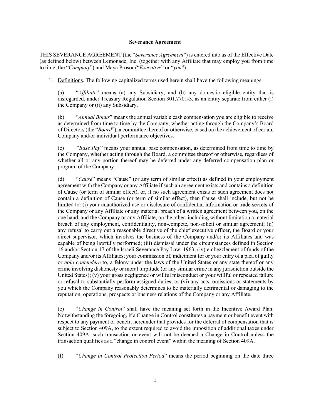 1 Severance Agreement THIS SEVERANCE AGREEMENT (the “Severance Agreement”) is entered into as of the Effective Date (as defined below) between Lemonade, Inc. (together with any Affiliate that may employ you from time to time, the “Company”) and Maya Prosor (“Executive” or “you”). 1. Definitions. The following capitalized terms used herein shall have the following meanings: (a) “Affiliate” means (a) any Subsidiary; and (b) any domestic eligible entity that is disregarded, under Treasury Regulation Section 301.7701-3, as an entity separate from either (i) the Company or (ii) any Subsidiary. (b) “Annual Bonus” means the annual variable cash compensation you are eligible to receive as determined from time to time by the Company, whether acting through the Company’s Board of Directors (the “Board”), a committee thereof or otherwise, based on the achievement of certain Company and/or individual performance objectives. (c) “Base Pay” means your annual base compensation, as determined from time to time by the Company, whether acting through the Board, a committee thereof or otherwise, regardless of whether all or any portion thereof may be deferred under any deferred compensation plan or program of the Company. (d) “Cause” means “Cause” (or any term of similar effect) as defined in your employment agreement with the Company or any Affiliate if such an agreement exists and contains a definition of Cause (or term of similar effect), or, if no such agreement exists or such agreement does not contain a definition of Cause (or term of similar effect), then Cause shall include, but not be limited to: (i) your unauthorized use or disclosure of confidential information or trade secrets of the Company or any Affiliate or any material breach of a written agreement between you, on the one hand, and the Company or any Affiliate, on the other, including without limitation a material breach of any employment, confidentiality, non-compete, non-solicit or similar agreement; (ii) any refusal to carry out a reasonable directive of the chief executive officer, the Board or your direct supervisor, which involves the business of the Company and/or its Affiliates and was capable of being lawfully performed; (iii) dismissal under the circumstances defined in Section 16 and/or Section 17 of the Israeli Severance Pay Law, 1963; (iv) embezzlement of funds of the Company and/or its Affiliates; your commission of, indictment for or your entry of a plea of guilty or nolo contendere to, a felony under the laws of the United States or any state thereof or any crime involving dishonesty or moral turpitude (or any similar crime in any jurisdiction outside the United States); (v) your gross negligence or willful misconduct or your willful or repeated failure or refusal to substantially perform assigned duties; or (vi) any acts, omissions or statements by you which the Company reasonably determines to be materially detrimental or damaging to the reputation, operations, prospects or business relations of the Company or any Affiliate. (e) “Change in Control” shall have the meaning set forth in the Incentive Award Plan. Notwithstanding the foregoing, if a Change in Control constitutes a payment or benefit event with respect to any payment or benefit hereunder that provides for the deferral of compensation that is subject to Section 409A, to the extent required to avoid the imposition of additional taxes under Section 409A, such transaction or event will not be deemed a Change in Control unless the transaction qualifies as a “change in control event” within the meaning of Section 409A. (f) “Change in Control Protection Period” means the period beginning on the date three