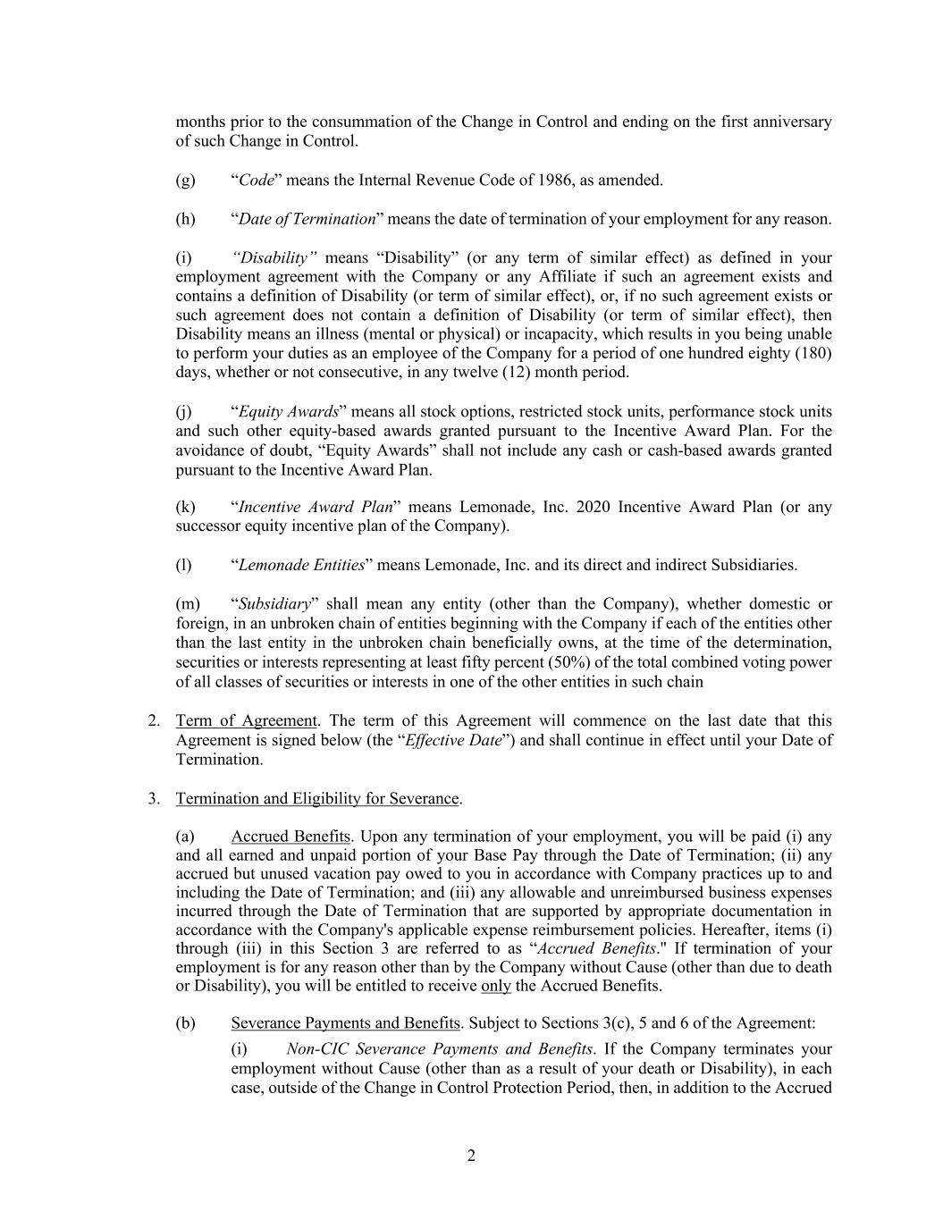 2 months prior to the consummation of the Change in Control and ending on the first anniversary of such Change in Control. (g) “Code” means the Internal Revenue Code of 1986, as amended. (h) “Date of Termination” means the date of termination of your employment for any reason. (i) “Disability” means “Disability” (or any term of similar effect) as defined in your employment agreement with the Company or any Affiliate if such an agreement exists and contains a definition of Disability (or term of similar effect), or, if no such agreement exists or such agreement does not contain a definition of Disability (or term of similar effect), then Disability means an illness (mental or physical) or incapacity, which results in you being unable to perform your duties as an employee of the Company for a period of one hundred eighty (180) days, whether or not consecutive, in any twelve (12) month period. (j) “Equity Awards” means all stock options, restricted stock units, performance stock units and such other equity-based awards granted pursuant to the Incentive Award Plan. For the avoidance of doubt, “Equity Awards” shall not include any cash or cash-based awards granted pursuant to the Incentive Award Plan. (k) “Incentive Award Plan” means Lemonade, Inc. 2020 Incentive Award Plan (or any successor equity incentive plan of the Company). (l) “Lemonade Entities” means Lemonade, Inc. and its direct and indirect Subsidiaries. (m) “Subsidiary” shall mean any entity (other than the Company), whether domestic or foreign, in an unbroken chain of entities beginning with the Company if each of the entities other than the last entity in the unbroken chain beneficially owns, at the time of the determination, securities or interests representing at least fifty percent (50%) of the total combined voting power of all classes of securities or interests in one of the other entities in such chain 2. Term of Agreement. The term of this Agreement will commence on the last date that this Agreement is signed below (the “Effective Date”) and shall continue in effect until your Date of Termination. 3. Termination and Eligibility for Severance. (a) Accrued Benefits. Upon any termination of your employment, you will be paid (i) any and all earned and unpaid portion of your Base Pay through the Date of Termination; (ii) any accrued but unused vacation pay owed to you in accordance with Company practices up to and including the Date of Termination; and (iii) any allowable and unreimbursed business expenses incurred through the Date of Termination that are supported by appropriate documentation in accordance with the Company's applicable expense reimbursement policies. Hereafter, items (i) through (iii) in this Section 3 are referred to as “Accrued Benefits.'' If termination of your employment is for any reason other than by the Company without Cause (other than due to death or Disability), you will be entitled to receive only the Accrued Benefits. (b) Severance Payments and Benefits. Subject to Sections 3(c), 5 and 6 of the Agreement: (i) Non-CIC Severance Payments and Benefits. If the Company terminates your employment without Cause (other than as a result of your death or Disability), in each case, outside of the Change in Control Protection Period, then, in addition to the Accrued
