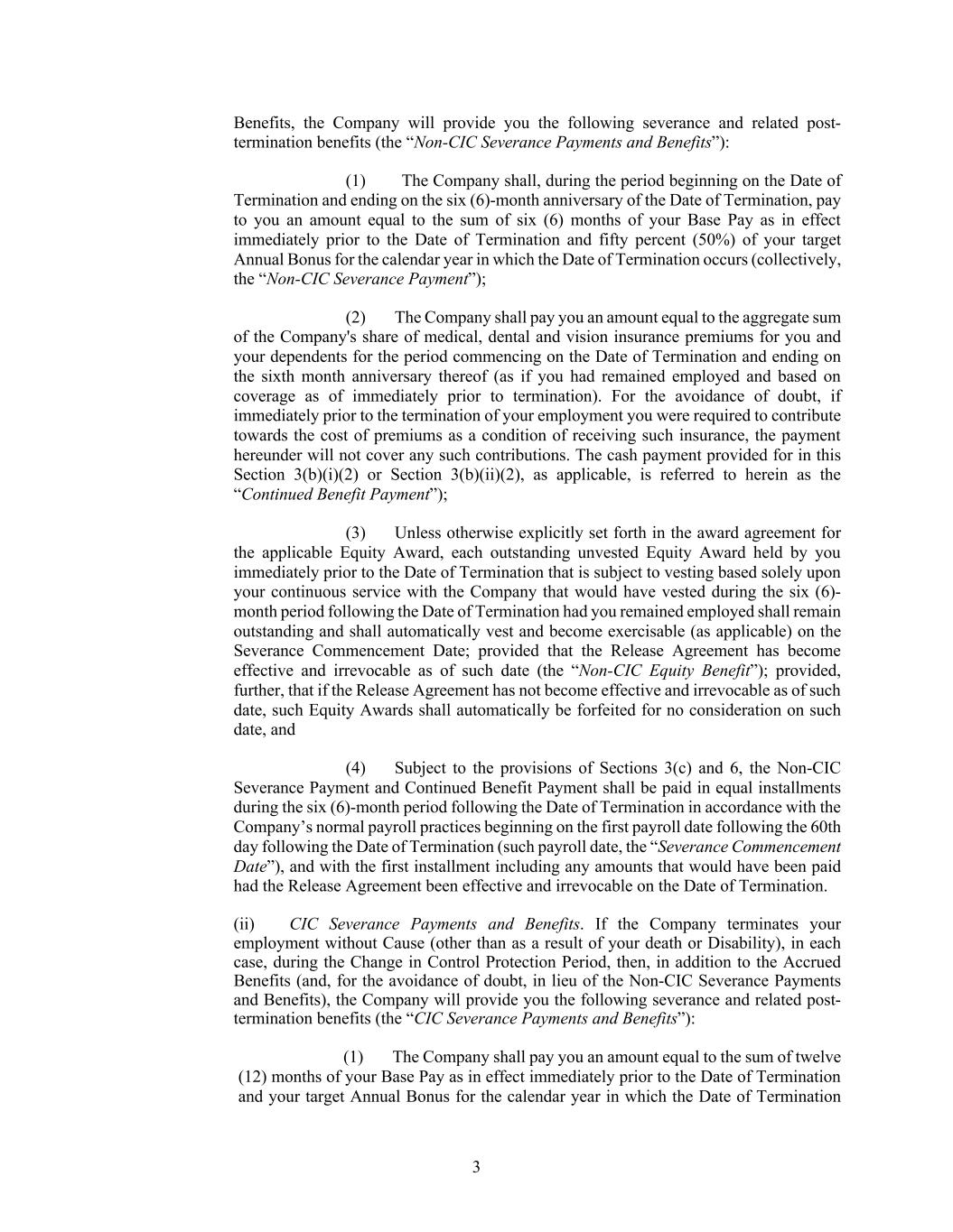 3 Benefits, the Company will provide you the following severance and related post- termination benefits (the “Non-CIC Severance Payments and Benefits”): (1) The Company shall, during the period beginning on the Date of Termination and ending on the six (6)-month anniversary of the Date of Termination, pay to you an amount equal to the sum of six (6) months of your Base Pay as in effect immediately prior to the Date of Termination and fifty percent (50%) of your target Annual Bonus for the calendar year in which the Date of Termination occurs (collectively, the “Non-CIC Severance Payment”); (2) The Company shall pay you an amount equal to the aggregate sum of the Company's share of medical, dental and vision insurance premiums for you and your dependents for the period commencing on the Date of Termination and ending on the sixth month anniversary thereof (as if you had remained employed and based on coverage as of immediately prior to termination). For the avoidance of doubt, if immediately prior to the termination of your employment you were required to contribute towards the cost of premiums as a condition of receiving such insurance, the payment hereunder will not cover any such contributions. The cash payment provided for in this Section 3(b)(i)(2) or Section 3(b)(ii)(2), as applicable, is referred to herein as the “Continued Benefit Payment”); (3) Unless otherwise explicitly set forth in the award agreement for the applicable Equity Award, each outstanding unvested Equity Award held by you immediately prior to the Date of Termination that is subject to vesting based solely upon your continuous service with the Company that would have vested during the six (6)- month period following the Date of Termination had you remained employed shall remain outstanding and shall automatically vest and become exercisable (as applicable) on the Severance Commencement Date; provided that the Release Agreement has become effective and irrevocable as of such date (the “Non-CIC Equity Benefit”); provided, further, that if the Release Agreement has not become effective and irrevocable as of such date, such Equity Awards shall automatically be forfeited for no consideration on such date, and (4) Subject to the provisions of Sections 3(c) and 6, the Non-CIC Severance Payment and Continued Benefit Payment shall be paid in equal installments during the six (6)-month period following the Date of Termination in accordance with the Company’s normal payroll practices beginning on the first payroll date following the 60th day following the Date of Termination (such payroll date, the “Severance Commencement Date”), and with the first installment including any amounts that would have been paid had the Release Agreement been effective and irrevocable on the Date of Termination. (ii) CIC Severance Payments and Benefits. If the Company terminates your employment without Cause (other than as a result of your death or Disability), in each case, during the Change in Control Protection Period, then, in addition to the Accrued Benefits (and, for the avoidance of doubt, in lieu of the Non-CIC Severance Payments and Benefits), the Company will provide you the following severance and related post- termination benefits (the “CIC Severance Payments and Benefits”): (1) The Company shall pay you an amount equal to the sum of twelve (12) months of your Base Pay as in effect immediately prior to the Date of Termination and your target Annual Bonus for the calendar year in which the Date of Termination