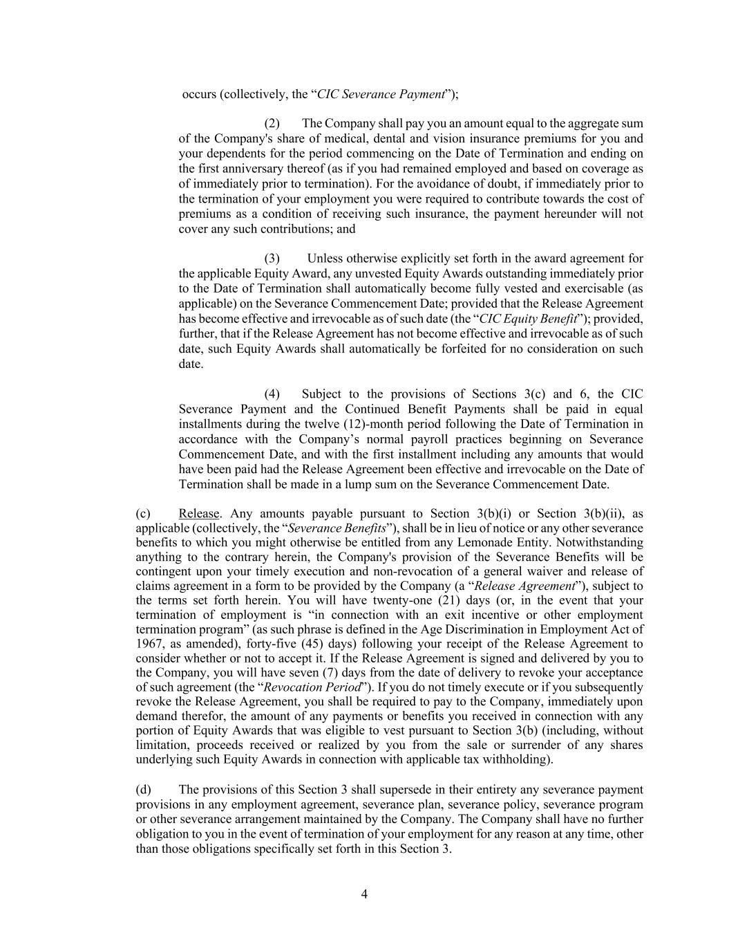 4 occurs (collectively, the “CIC Severance Payment”); (2) The Company shall pay you an amount equal to the aggregate sum of the Company's share of medical, dental and vision insurance premiums for you and your dependents for the period commencing on the Date of Termination and ending on the first anniversary thereof (as if you had remained employed and based on coverage as of immediately prior to termination). For the avoidance of doubt, if immediately prior to the termination of your employment you were required to contribute towards the cost of premiums as a condition of receiving such insurance, the payment hereunder will not cover any such contributions; and (3) Unless otherwise explicitly set forth in the award agreement for the applicable Equity Award, any unvested Equity Awards outstanding immediately prior to the Date of Termination shall automatically become fully vested and exercisable (as applicable) on the Severance Commencement Date; provided that the Release Agreement has become effective and irrevocable as of such date (the “CIC Equity Benefit”); provided, further, that if the Release Agreement has not become effective and irrevocable as of such date, such Equity Awards shall automatically be forfeited for no consideration on such date. (4) Subject to the provisions of Sections 3(c) and 6, the CIC Severance Payment and the Continued Benefit Payments shall be paid in equal installments during the twelve (12)-month period following the Date of Termination in accordance with the Company’s normal payroll practices beginning on Severance Commencement Date, and with the first installment including any amounts that would have been paid had the Release Agreement been effective and irrevocable on the Date of Termination shall be made in a lump sum on the Severance Commencement Date. (c) Release. Any amounts payable pursuant to Section 3(b)(i) or Section 3(b)(ii), as applicable (collectively, the “Severance Benefits”), shall be in lieu of notice or any other severance benefits to which you might otherwise be entitled from any Lemonade Entity. Notwithstanding anything to the contrary herein, the Company's provision of the Severance Benefits will be contingent upon your timely execution and non-revocation of a general waiver and release of claims agreement in a form to be provided by the Company (a “Release Agreement”), subject to the terms set forth herein. You will have twenty-one (21) days (or, in the event that your termination of employment is “in connection with an exit incentive or other employment termination program” (as such phrase is defined in the Age Discrimination in Employment Act of 1967, as amended), forty-five (45) days) following your receipt of the Release Agreement to consider whether or not to accept it. If the Release Agreement is signed and delivered by you to the Company, you will have seven (7) days from the date of delivery to revoke your acceptance of such agreement (the “Revocation Period”). If you do not timely execute or if you subsequently revoke the Release Agreement, you shall be required to pay to the Company, immediately upon demand therefor, the amount of any payments or benefits you received in connection with any portion of Equity Awards that was eligible to vest pursuant to Section 3(b) (including, without limitation, proceeds received or realized by you from the sale or surrender of any shares underlying such Equity Awards in connection with applicable tax withholding). (d) The provisions of this Section 3 shall supersede in their entirety any severance payment provisions in any employment agreement, severance plan, severance policy, severance program or other severance arrangement maintained by the Company. The Company shall have no further obligation to you in the event of termination of your employment for any reason at any time, other than those obligations specifically set forth in this Section 3.