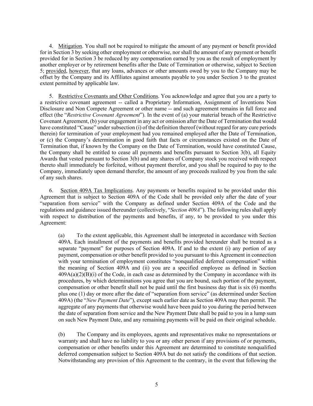 5 4. Mitigation. You shall not be required to mitigate the amount of any payment or benefit provided for in Section 3 by seeking other employment or otherwise, nor shall the amount of any payment or benefit provided for in Section 3 be reduced by any compensation earned by you as the result of employment by another employer or by retirement benefits after the Date of Termination or otherwise, subject to Section 5; provided, however, that any loans, advances or other amounts owed by you to the Company may be offset by the Company and its Affiliates against amounts payable to you under Section 3 to the greatest extent permitted by applicable law. 5. Restrictive Covenants and Other Conditions. You acknowledge and agree that you are a party to a restrictive covenant agreement -- called a Proprietary Information, Assignment of Inventions Non Disclosure and Non Compete Agreement or other name -- and such agreement remains in full force and effect (the “Restrictive Covenant Agreement”). In the event of (a) your material breach of the Restrictive Covenant Agreement, (b) your engagement in any act or omission after the Date of Termination that would have constituted “Cause” under subsection (i) of the definition thereof (without regard for any cure periods therein) for termination of your employment had you remained employed after the Date of Termination, or (c) the Company’s determination in good faith that facts or circumstances existed on the Date of Termination that, if known by the Company on the Date of Termination, would have constituted Cause, the Company shall be entitled to cease all payments and benefits pursuant to Section 3(b), all Equity Awards that vested pursuant to Section 3(b) and any shares of Company stock you received with respect thereto shall immediately be forfeited, without payment therefor, and you shall be required to pay to the Company, immediately upon demand therefor, the amount of any proceeds realized by you from the sale of any such shares. 6. Section 409A Tax Implications. Any payments or benefits required to be provided under this Agreement that is subject to Section 409A of the Code shall be provided only after the date of your “separation from service” with the Company as defined under Section 409A of the Code and the regulations and guidance issued thereunder (collectively, “Section 409A”). The following rules shall apply with respect to distribution of the payments and benefits, if any, to be provided to you under this Agreement: (a) To the extent applicable, this Agreement shall be interpreted in accordance with Section 409A. Each installment of the payments and benefits provided hereunder shall be treated as a separate “payment” for purposes of Section 409A. If and to the extent (i) any portion of any payment, compensation or other benefit provided to you pursuant to this Agreement in connection with your termination of employment constitutes “nonqualified deferred compensation” within the meaning of Section 409A and (ii) you are a specified employee as defined in Section 409A(a)(2)(B)(i) of the Code, in each case as determined by the Company in accordance with its procedures, by which determinations you agree that you are bound, such portion of the payment, compensation or other benefit shall not be paid until the first business day that is six (6) months plus one (1) day or more after the date of “separation from service” (as determined under Section 409A) (the “New Payment Date”), except such earlier date as Section 409A may then permit. The aggregate of any payments that otherwise would have been paid to you during the period between the date of separation from service and the New Payment Date shall be paid to you in a lump sum on such New Payment Date, and any remaining payments will be paid on their original schedule. (b) The Company and its employees, agents and representatives make no representations or warranty and shall have no liability to you or any other person if any provisions of or payments, compensation or other benefits under this Agreement are determined to constitute nonqualified deferred compensation subject to Section 409A but do not satisfy the conditions of that section. Notwithstanding any provision of this Agreement to the contrary, in the event that following the