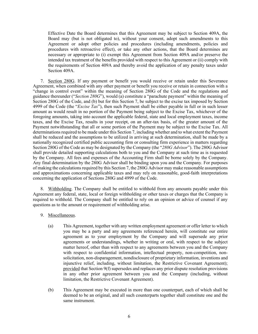 6 Effective Date the Board determines that this Agreement may be subject to Section 409A, the Board may (but is not obligated to), without your consent, adopt such amendments to this Agreement or adopt other policies and procedures (including amendments, policies and procedures with retroactive effect), or take any other actions, that the Board determines are necessary or appropriate to (i) exempt this Agreement from Section 409A and/or preserve the intended tax treatment of the benefits provided with respect to this Agreement or (ii) comply with the requirements of Section 409A and thereby avoid the application of any penalty taxes under Section 409A. 7. Section 280G. If any payment or benefit you would receive or retain under this Severance Agreement, when combined with any other payment or benefit you receive or retain in connection with a “change in control event” within the meaning of Section 280G of the Code and the regulations and guidance thereunder (“Section 280G”), would (a) constitute a “parachute payment” within the meaning of Section 280G of the Code, and (b) but for this Section 7, be subject to the excise tax imposed by Section 4999 of the Code (the “Excise Tax”), then such Payment shall be either payable in full or in such lesser amount as would result in no portion of the Payment being subject to the Excise Tax, whichever of the foregoing amounts, taking into account the applicable federal, state and local employment taxes, income taxes, and the Excise Tax, results in your receipt, on an after-tax basis, of the greater amount of the Payment notwithstanding that all or some portion of the Payment may be subject to the Excise Tax. All determinations required to be made under this Section 7, including whether and to what extent the Payment shall be reduced and the assumptions to be utilized in arriving at such determination, shall be made by a nationally recognized certified public accounting firm or consulting firm experience in matters regarding Section 280G of the Code as may be designated by the Company (the “280G Advisor”). The 280G Advisor shall provide detailed supporting calculations both to you and the Company at such time as is requested by the Company. All fees and expenses of the Accounting Firm shall be borne solely by the Company. Any final determination by the 280G Advisor shall be binding upon you and the Company. For purposes of making the calculations required by this Section 7, the 280G Advisor may make reasonable assumptions and approximations concerning applicable taxes and may rely on reasonable, good-faith interpretations concerning the application of Sections 280G and 4999 of the Code. 8. Withholding. The Company shall be entitled to withhold from any amounts payable under this Agreement any federal, state, local or foreign withholding or other taxes or charges that the Company is required to withhold. The Company shall be entitled to rely on an opinion or advice of counsel if any questions as to the amount or requirement of withholding arise. 9. Miscellaneous. (a) This Agreement, together with any written employment agreement or offer letter to which you may be a party and any agreements referenced herein, will constitute our entire agreement as to your employment by the Company and will supersede any prior agreements or understandings, whether in writing or oral, with respect to the subject matter hereof, other than with respect to any agreements between you and the Company with respect to confidential information, intellectual property, non-competition, non- solicitation, non-disparagement, nondisclosure of proprietary information, inventions and injunctive relief, including, without limitation, the Restrictive Covenant Agreement); provided that Section 9(f) supersedes and replaces any prior dispute resolution provisions in any other prior agreement between you and the Company (including, without limitation, the Restrictive Covenant Agreement). (b) This Agreement may be executed in more than one counterpart, each of which shall be deemed to be an original, and all such counterparts together shall constitute one and the same instrument.
