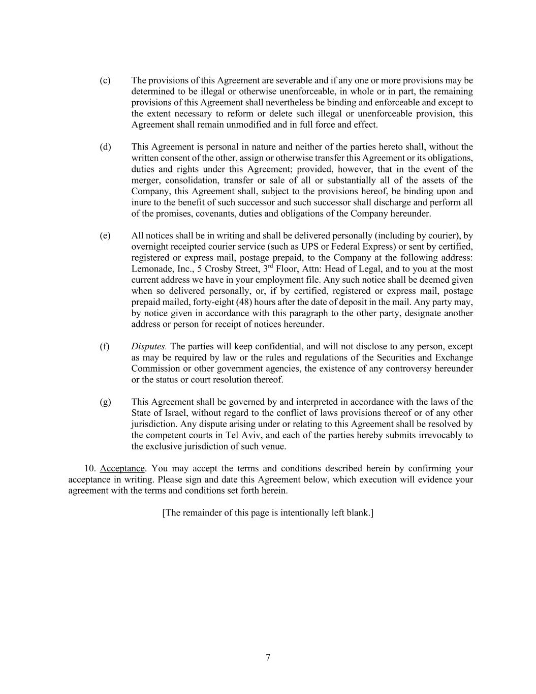 7 (c) The provisions of this Agreement are severable and if any one or more provisions may be determined to be illegal or otherwise unenforceable, in whole or in part, the remaining provisions of this Agreement shall nevertheless be binding and enforceable and except to the extent necessary to reform or delete such illegal or unenforceable provision, this Agreement shall remain unmodified and in full force and effect. (d) This Agreement is personal in nature and neither of the parties hereto shall, without the written consent of the other, assign or otherwise transfer this Agreement or its obligations, duties and rights under this Agreement; provided, however, that in the event of the merger, consolidation, transfer or sale of all or substantially all of the assets of the Company, this Agreement shall, subject to the provisions hereof, be binding upon and inure to the benefit of such successor and such successor shall discharge and perform all of the promises, covenants, duties and obligations of the Company hereunder. (e) All notices shall be in writing and shall be delivered personally (including by courier), by overnight receipted courier service (such as UPS or Federal Express) or sent by certified, registered or express mail, postage prepaid, to the Company at the following address: Lemonade, Inc., 5 Crosby Street, 3rd Floor, Attn: Head of Legal, and to you at the most current address we have in your employment file. Any such notice shall be deemed given when so delivered personally, or, if by certified, registered or express mail, postage prepaid mailed, forty-eight (48) hours after the date of deposit in the mail. Any party may, by notice given in accordance with this paragraph to the other party, designate another address or person for receipt of notices hereunder. (f) Disputes. The parties will keep confidential, and will not disclose to any person, except as may be required by law or the rules and regulations of the Securities and Exchange Commission or other government agencies, the existence of any controversy hereunder or the status or court resolution thereof. (g) This Agreement shall be governed by and interpreted in accordance with the laws of the State of Israel, without regard to the conflict of laws provisions thereof or of any other jurisdiction. Any dispute arising under or relating to this Agreement shall be resolved by the competent courts in Tel Aviv, and each of the parties hereby submits irrevocably to the exclusive jurisdiction of such venue. 10. Acceptance. You may accept the terms and conditions described herein by confirming your acceptance in writing. Please sign and date this Agreement below, which execution will evidence your agreement with the terms and conditions set forth herein. [The remainder of this page is intentionally left blank.]