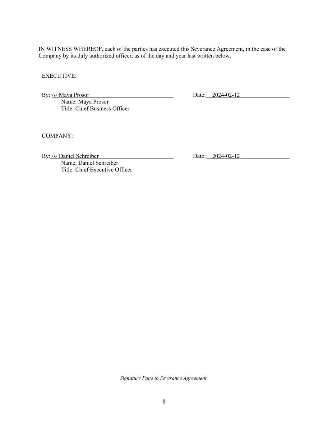 8 IN WITNESS WHEREOF, each of the parties has executed this Severance Agreement, in the case of the Company by its duly authorized officer, as of the day and year last written below. EXECUTIVE: By: /s/ Maya Prosor Date: 2024-02-12 Name: Maya Prosor Title: Chief Business Officer COMPANY: By: /s/ Daniel Schreiber Date: 2024-02-12 Name: Daniel Schreiber Title: Chief Executive Officer Signature Page to Severance Agreement