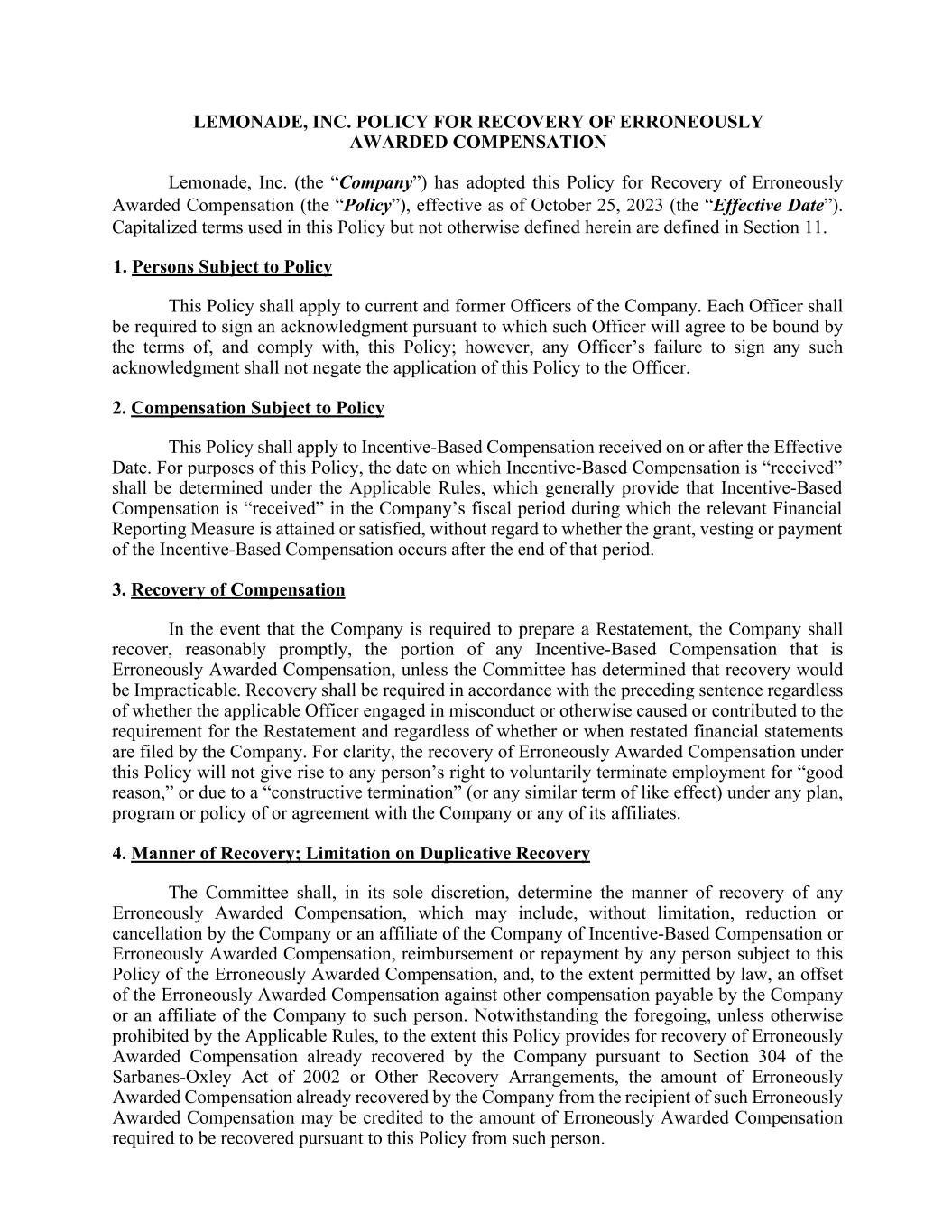 LEMONADE, INC. POLICY FOR RECOVERY OF ERRONEOUSLY AWARDED COMPENSATION Lemonade, Inc. (the “Company”) has adopted this Policy for Recovery of Erroneously Awarded Compensation (the “Policy”), effective as of October 25, 2023 (the “Effective Date”). Capitalized terms used in this Policy but not otherwise defined herein are defined in Section 11. 1. Persons Subject to Policy This Policy shall apply to current and former Officers of the Company. Each Officer shall be required to sign an acknowledgment pursuant to which such Officer will agree to be bound by the terms of, and comply with, this Policy; however, any Officer’s failure to sign any such acknowledgment shall not negate the application of this Policy to the Officer. 2. Compensation Subject to Policy This Policy shall apply to Incentive-Based Compensation received on or after the Effective Date. For purposes of this Policy, the date on which Incentive-Based Compensation is “received” shall be determined under the Applicable Rules, which generally provide that Incentive-Based Compensation is “received” in the Company’s fiscal period during which the relevant Financial Reporting Measure is attained or satisfied, without regard to whether the grant, vesting or payment of the Incentive-Based Compensation occurs after the end of that period. 3. Recovery of Compensation In the event that the Company is required to prepare a Restatement, the Company shall recover, reasonably promptly, the portion of any Incentive-Based Compensation that is Erroneously Awarded Compensation, unless the Committee has determined that recovery would be Impracticable. Recovery shall be required in accordance with the preceding sentence regardless of whether the applicable Officer engaged in misconduct or otherwise caused or contributed to the requirement for the Restatement and regardless of whether or when restated financial statements are filed by the Company. For clarity, the recovery of Erroneously Awarded Compensation under this Policy will not give rise to any person’s right to voluntarily terminate employment for “good reason,” or due to a “constructive termination” (or any similar term of like effect) under any plan, program or policy of or agreement with the Company or any of its affiliates. 4. Manner of Recovery; Limitation on Duplicative Recovery The Committee shall, in its sole discretion, determine the manner of recovery of any Erroneously Awarded Compensation, which may include, without limitation, reduction or cancellation by the Company or an affiliate of the Company of Incentive-Based Compensation or Erroneously Awarded Compensation, reimbursement or repayment by any person subject to this Policy of the Erroneously Awarded Compensation, and, to the extent permitted by law, an offset of the Erroneously Awarded Compensation against other compensation payable by the Company or an affiliate of the Company to such person. Notwithstanding the foregoing, unless otherwise prohibited by the Applicable Rules, to the extent this Policy provides for recovery of Erroneously Awarded Compensation already recovered by the Company pursuant to Section 304 of the Sarbanes-Oxley Act of 2002 or Other Recovery Arrangements, the amount of Erroneously Awarded Compensation already recovered by the Company from the recipient of such Erroneously Awarded Compensation may be credited to the amount of Erroneously Awarded Compensation required to be recovered pursuant to this Policy from such person.