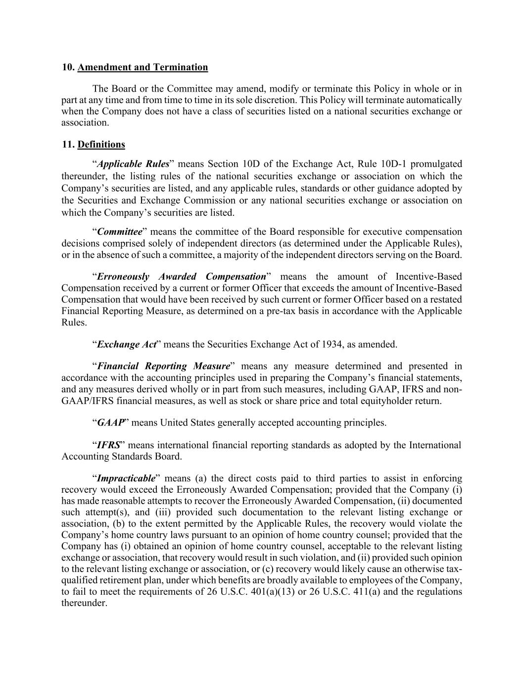 10. Amendment and Termination The Board or the Committee may amend, modify or terminate this Policy in whole or in part at any time and from time to time in its sole discretion. This Policy will terminate automatically when the Company does not have a class of securities listed on a national securities exchange or association. 11. Definitions “Applicable Rules” means Section 10D of the Exchange Act, Rule 10D-1 promulgated thereunder, the listing rules of the national securities exchange or association on which the Company’s securities are listed, and any applicable rules, standards or other guidance adopted by the Securities and Exchange Commission or any national securities exchange or association on which the Company’s securities are listed. “Committee” means the committee of the Board responsible for executive compensation decisions comprised solely of independent directors (as determined under the Applicable Rules), or in the absence of such a committee, a majority of the independent directors serving on the Board. “Erroneously Awarded Compensation” means the amount of Incentive-Based Compensation received by a current or former Officer that exceeds the amount of Incentive-Based Compensation that would have been received by such current or former Officer based on a restated Financial Reporting Measure, as determined on a pre-tax basis in accordance with the Applicable Rules. “Exchange Act” means the Securities Exchange Act of 1934, as amended. “Financial Reporting Measure” means any measure determined and presented in accordance with the accounting principles used in preparing the Company’s financial statements, and any measures derived wholly or in part from such measures, including GAAP, IFRS and non- GAAP/IFRS financial measures, as well as stock or share price and total equityholder return. “GAAP” means United States generally accepted accounting principles. “IFRS” means international financial reporting standards as adopted by the International Accounting Standards Board. “Impracticable” means (a) the direct costs paid to third parties to assist in enforcing recovery would exceed the Erroneously Awarded Compensation; provided that the Company (i) has made reasonable attempts to recover the Erroneously Awarded Compensation, (ii) documented such attempt(s), and (iii) provided such documentation to the relevant listing exchange or association, (b) to the extent permitted by the Applicable Rules, the recovery would violate the Company’s home country laws pursuant to an opinion of home country counsel; provided that the Company has (i) obtained an opinion of home country counsel, acceptable to the relevant listing exchange or association, that recovery would result in such violation, and (ii) provided such opinion to the relevant listing exchange or association, or (c) recovery would likely cause an otherwise tax- qualified retirement plan, under which benefits are broadly available to employees of the Company, to fail to meet the requirements of 26 U.S.C. 401(a)(13) or 26 U.S.C. 411(a) and the regulations thereunder.