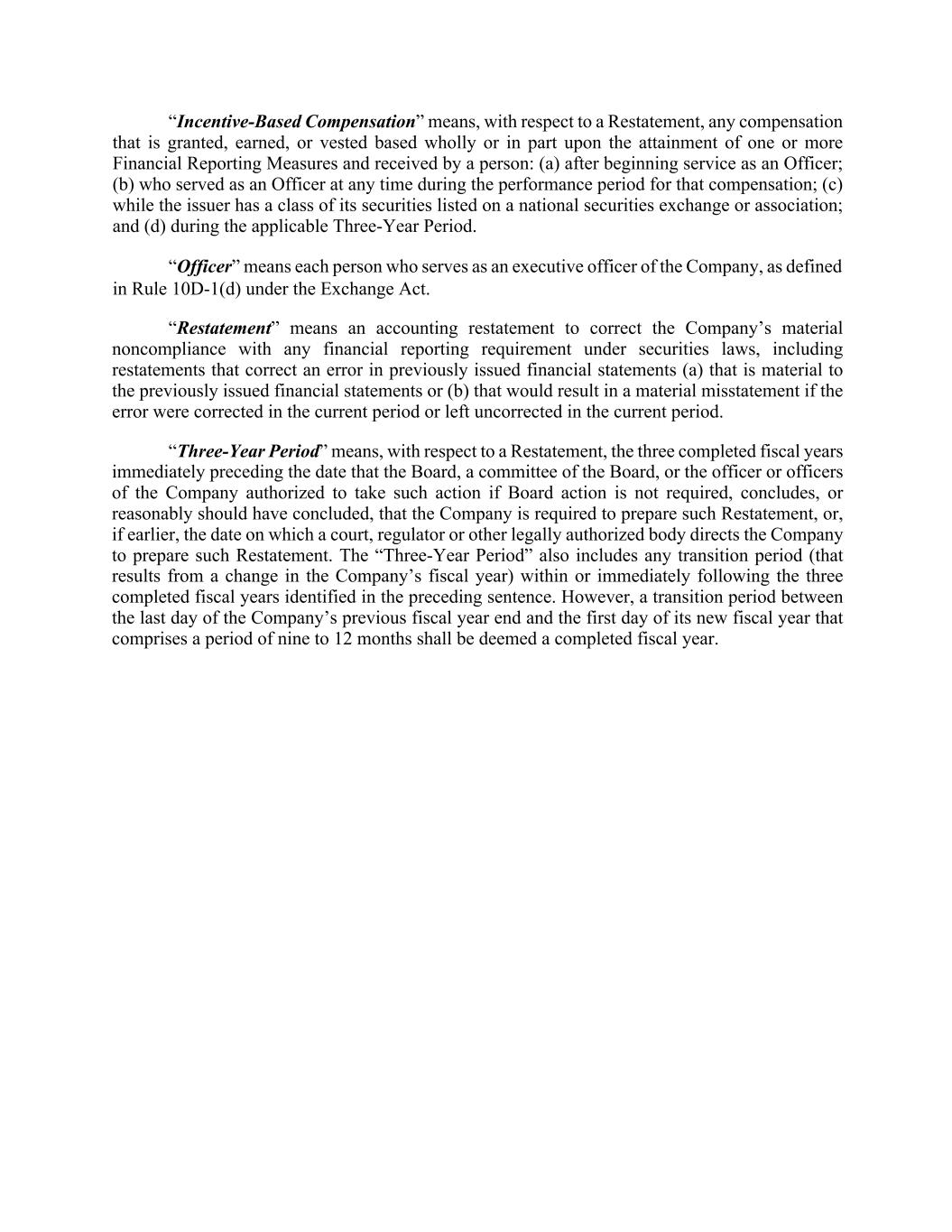 “Incentive-Based Compensation” means, with respect to a Restatement, any compensation that is granted, earned, or vested based wholly or in part upon the attainment of one or more Financial Reporting Measures and received by a person: (a) after beginning service as an Officer; (b) who served as an Officer at any time during the performance period for that compensation; (c) while the issuer has a class of its securities listed on a national securities exchange or association; and (d) during the applicable Three-Year Period. “Officer” means each person who serves as an executive officer of the Company, as defined in Rule 10D-1(d) under the Exchange Act. “Restatement” means an accounting restatement to correct the Company’s material noncompliance with any financial reporting requirement under securities laws, including restatements that correct an error in previously issued financial statements (a) that is material to the previously issued financial statements or (b) that would result in a material misstatement if the error were corrected in the current period or left uncorrected in the current period. “Three-Year Period” means, with respect to a Restatement, the three completed fiscal years immediately preceding the date that the Board, a committee of the Board, or the officer or officers of the Company authorized to take such action if Board action is not required, concludes, or reasonably should have concluded, that the Company is required to prepare such Restatement, or, if earlier, the date on which a court, regulator or other legally authorized body directs the Company to prepare such Restatement. The “Three-Year Period” also includes any transition period (that results from a change in the Company’s fiscal year) within or immediately following the three completed fiscal years identified in the preceding sentence. However, a transition period between the last day of the Company’s previous fiscal year end and the first day of its new fiscal year that comprises a period of nine to 12 months shall be deemed a completed fiscal year.